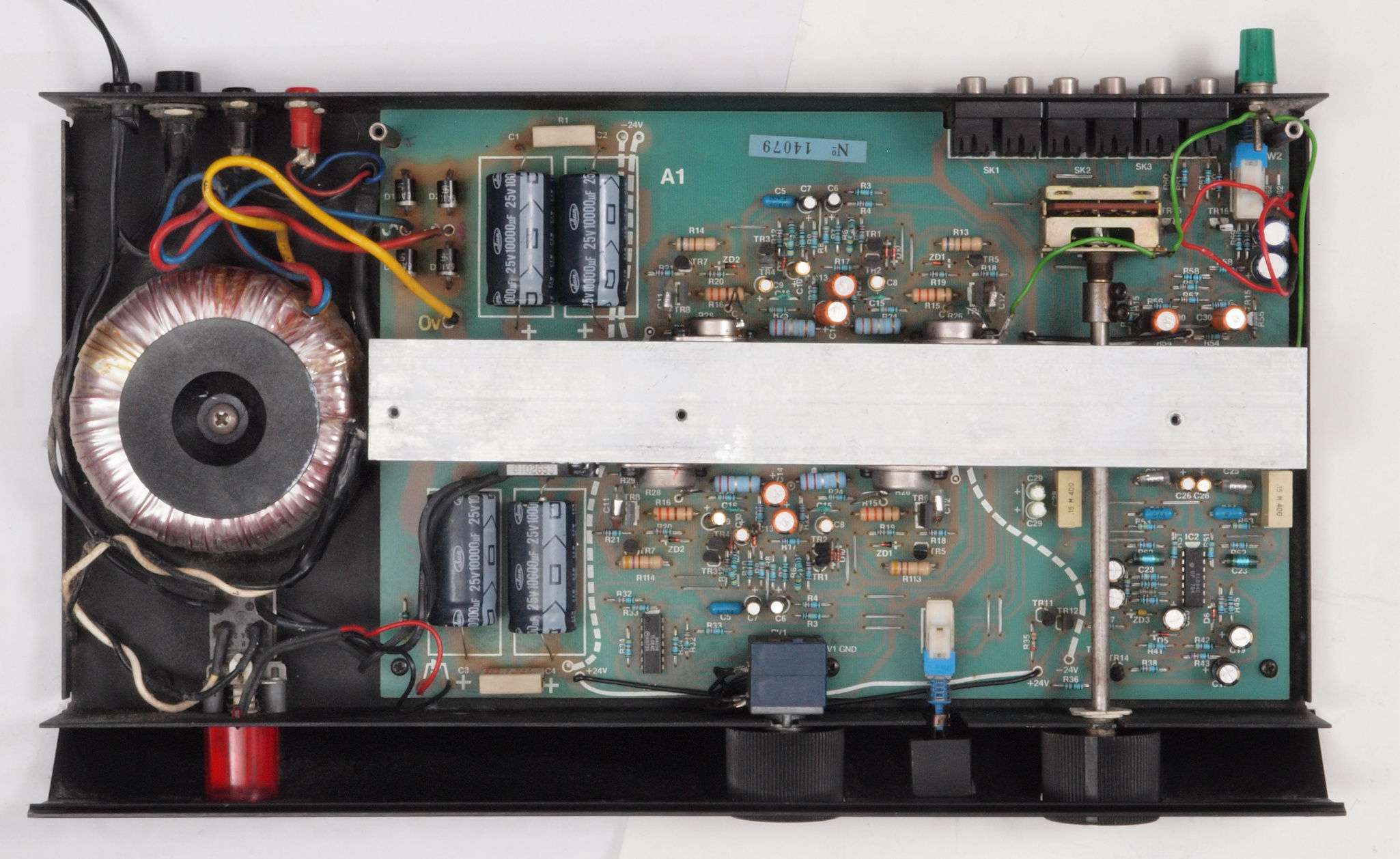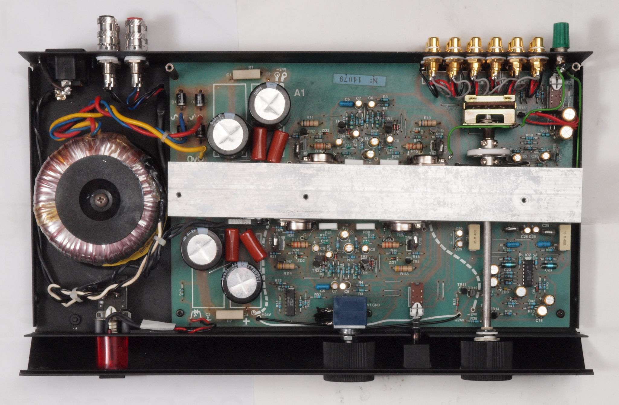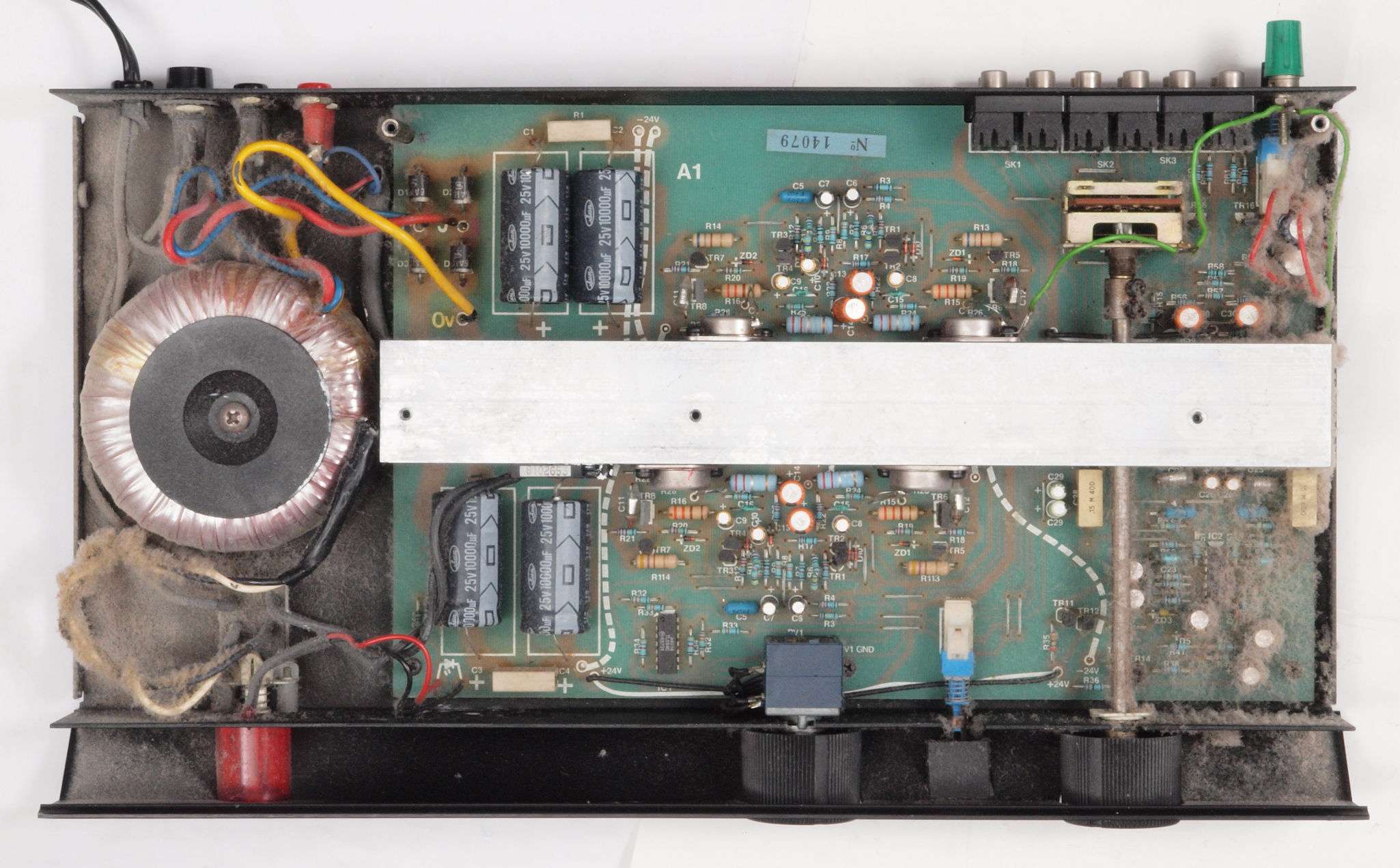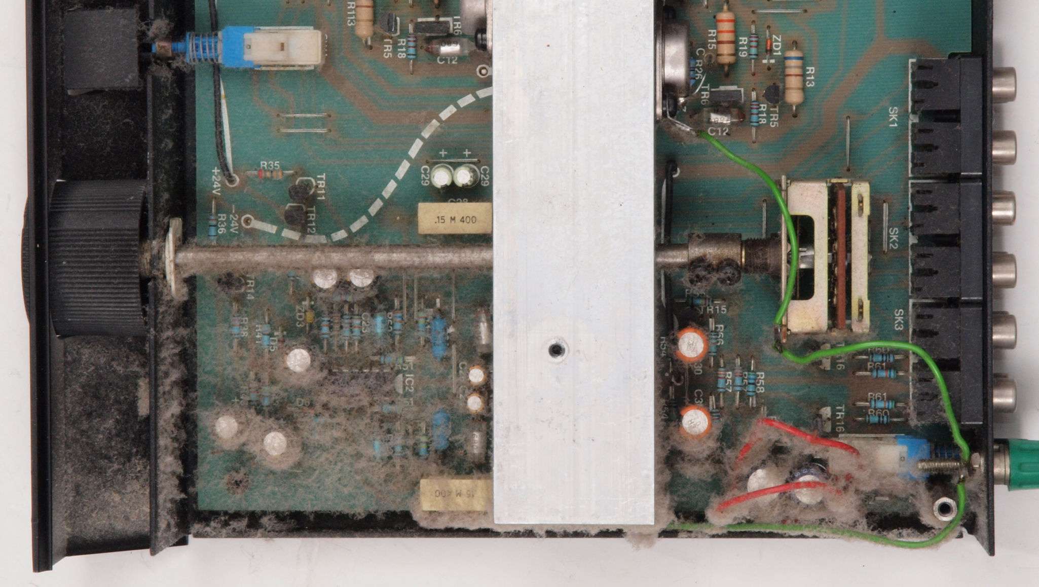A162. 点検中 上蓋(放熱器)を取り、上から見る。 EQ−AMP回りの埃。