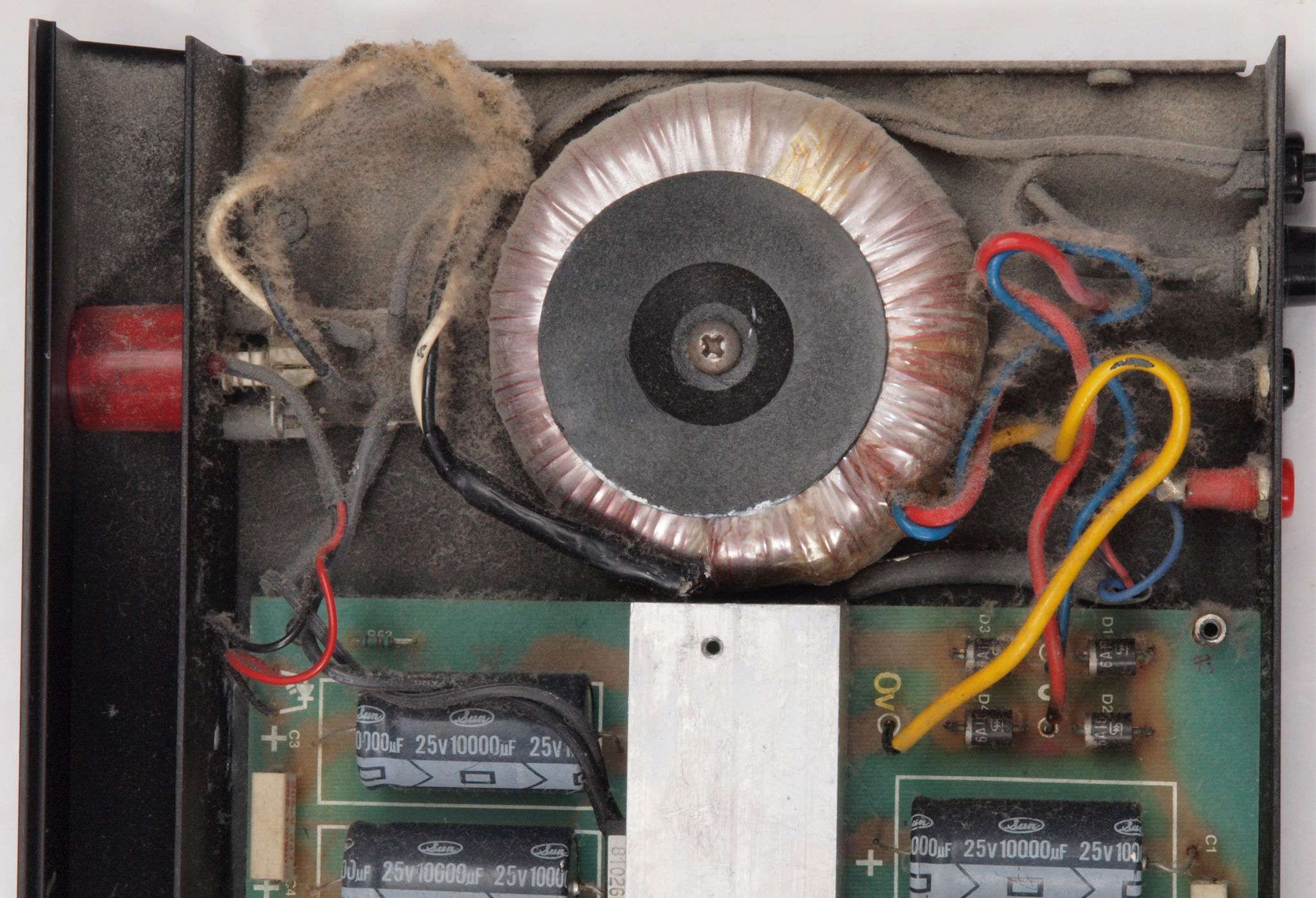 A162. 点検中 上蓋(放熱器)を取り、上から見る。 トランス回りの埃。