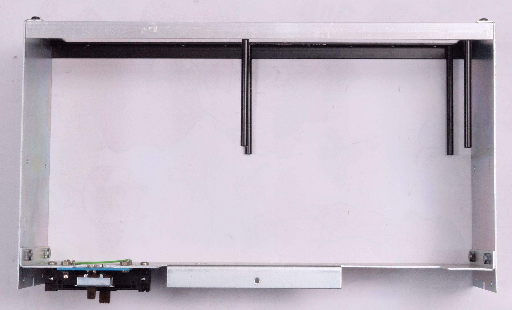 | C. 修理状況 C10. 修理中 基板、 電源トランス、 前パネル等を外したシャシ。 |