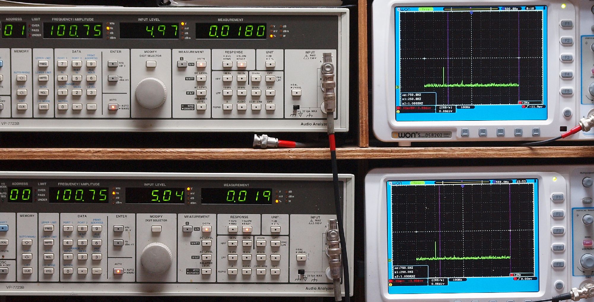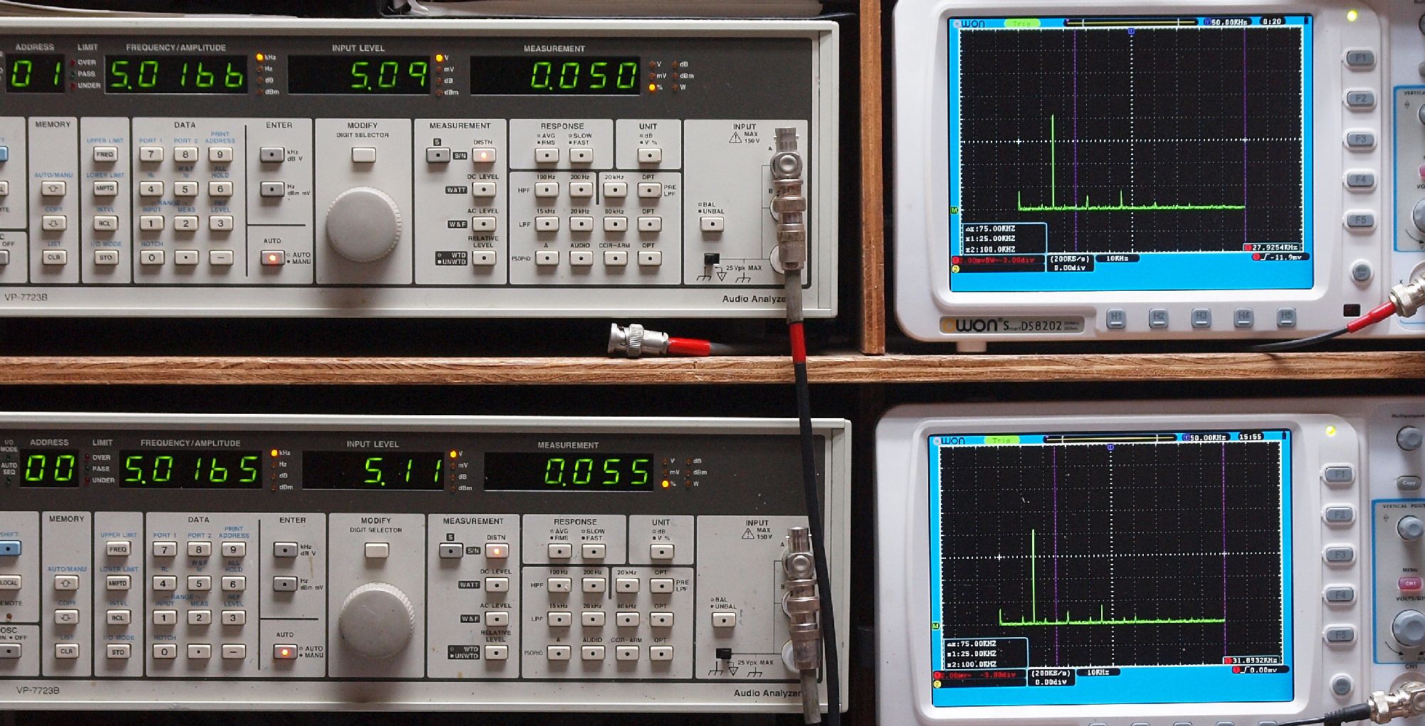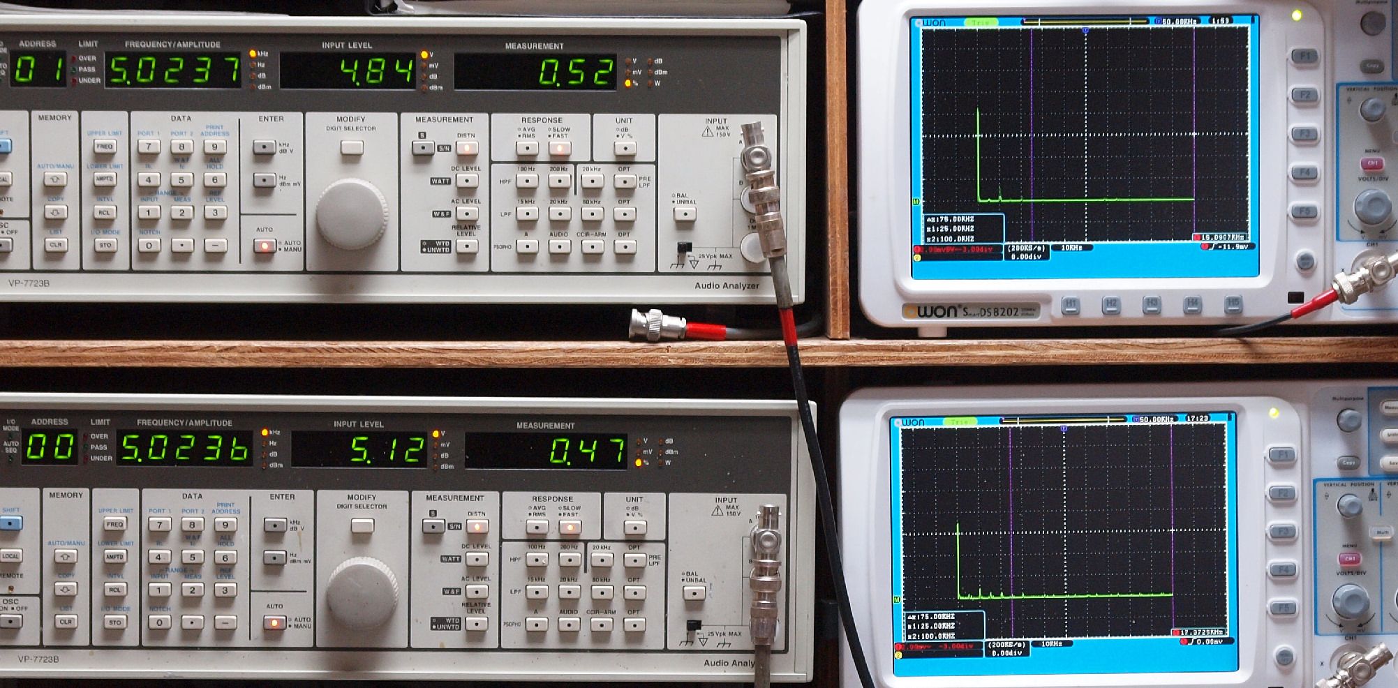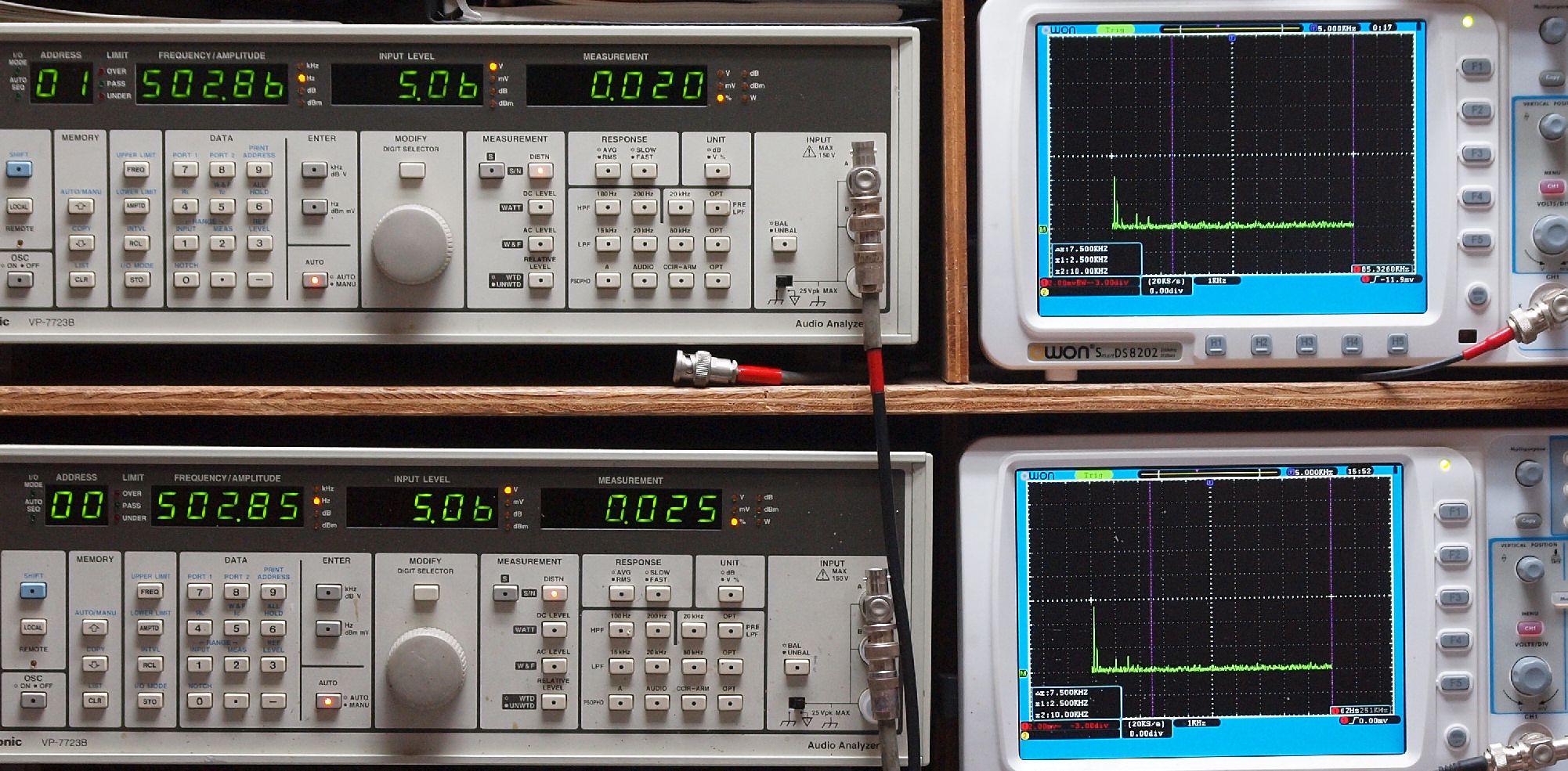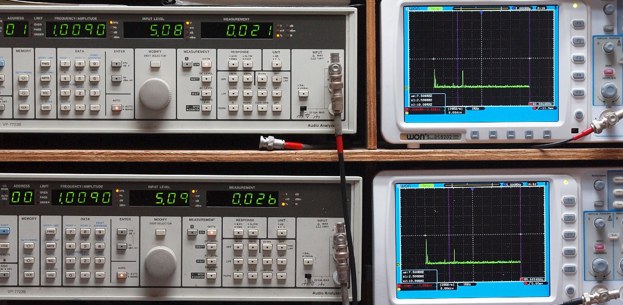 | E. 調整・測定 E0. 出力、歪み調整・測定、電源電圧は100Vにて測定 「見方」。 上段中 右側5V出力を「Audio Analyzer Panasonic VP−7723B」により測定。 表示LED、 左端=メモリーNo、 中左=周波数測定、 中右=出力電圧測定、 右端=歪み率測定。 上段右端 VP−7723Bの基本波除去出力を「owon SDS8202(200MHZ)」で「FFT分析」表示。 下段中 左側5V出力を「Audio Analyzer Panasonic VP−7723B」により測定。 表示LED、 左端=メモリーNo、 中左=周波数測定、 中右=出力電圧測定、 右端=歪み率測定。 下段右端 VP−7723Bの基本波除去出力を「owon SDS6062(200MHZ)」で「FFT分析」表示。 下段左端 オーディオ発振器 VP−7201A より50Hz〜100kHzの信号を出し(歪み率=約0.003%)、ATT+分配器を通し、AMPに入力。 よって、ダイアル設定出力レベルより低くなります。測定機器の仕様や整備の様子はこちら、「VP−7723B」「VP−7201A」。 FFT画面の見方はこちら。 |