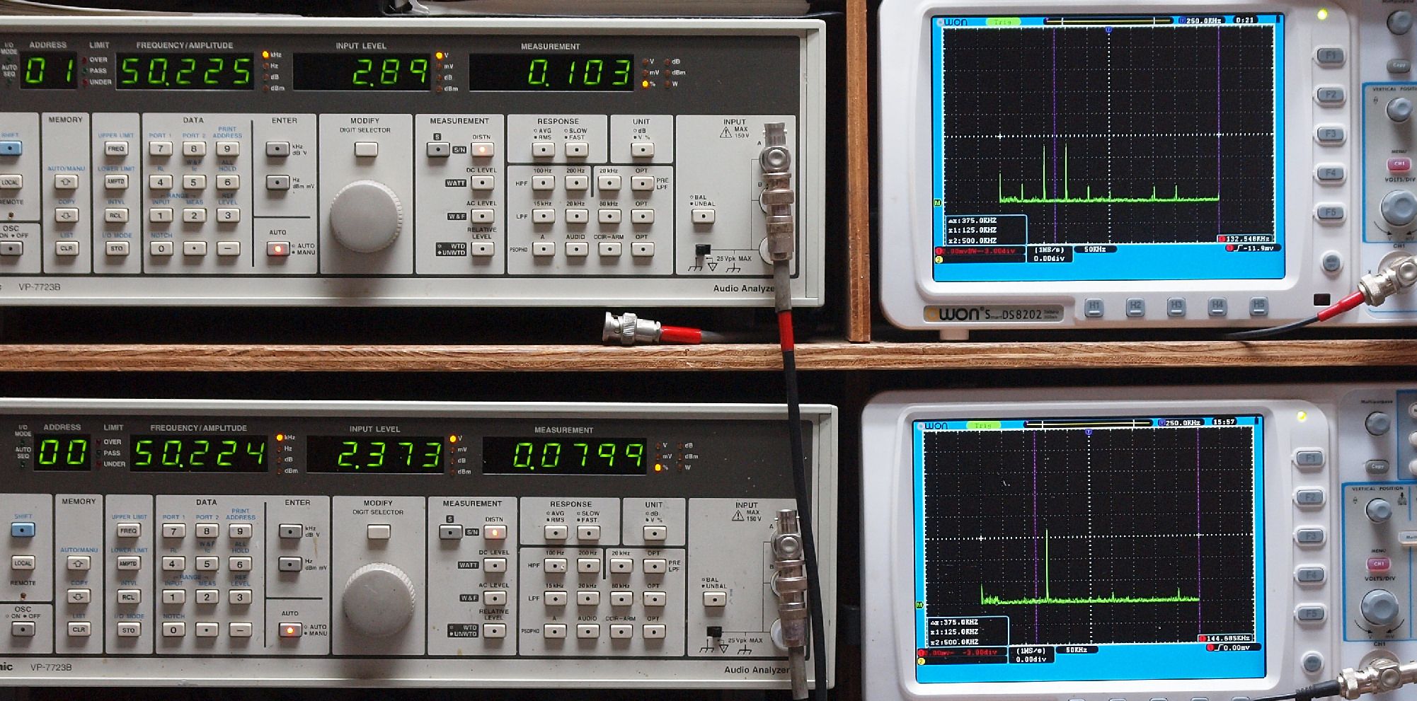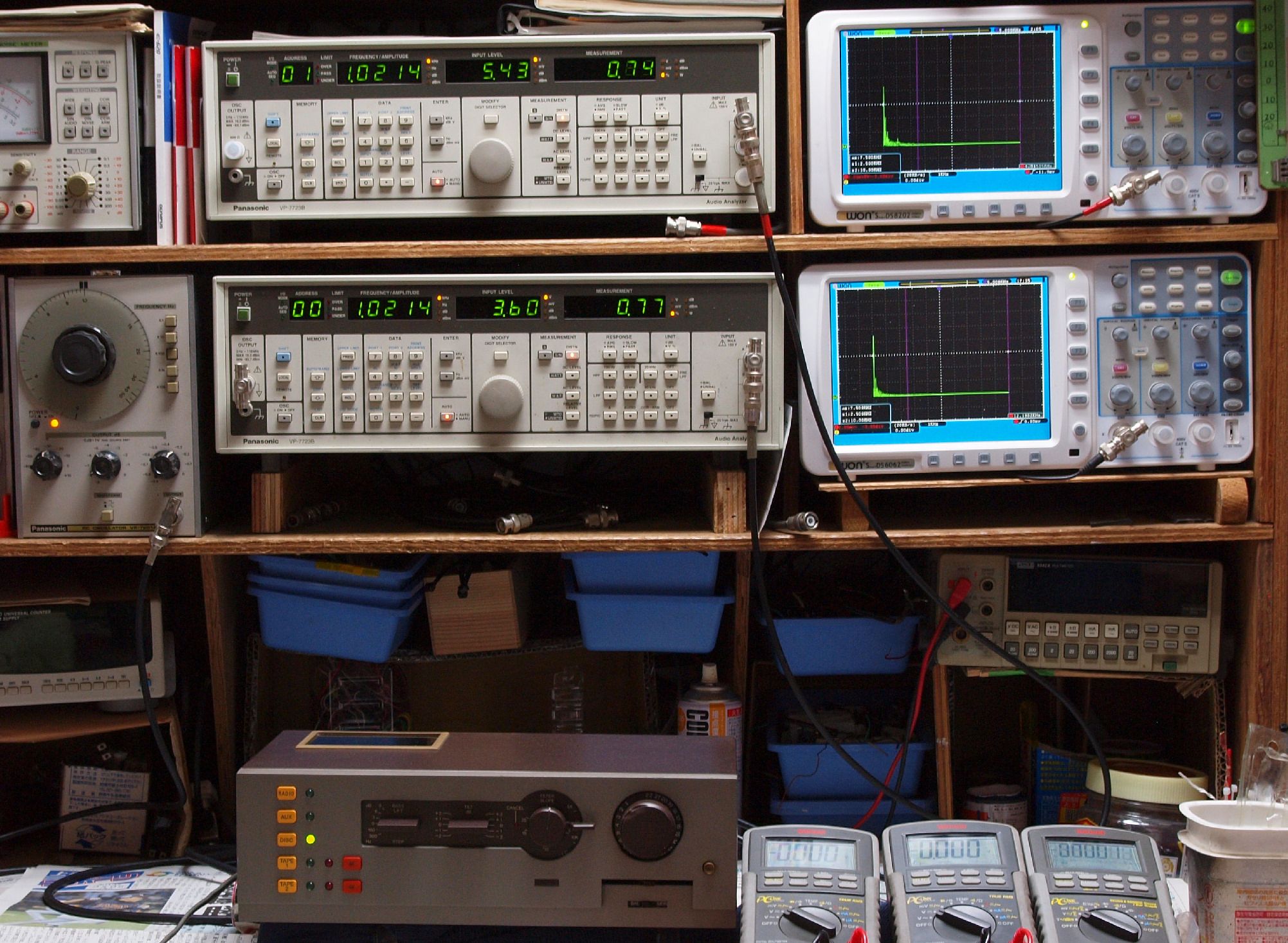 | T. 修理前点検測定 T0. 出力、歪み調整・測定、電源電圧は100Vにて測定 「見方」。 上段中 右側5V出力を「Audio Analyzer Panasonic VP−7723B」により測定。 表示LED、 左端=メモリーNo、 中左=周波数測定、 中右=出力電圧測定、 右端=歪み率測定。 上段右端 VP−7723Bの基本波除去出力を「owon SDS8202(200MHZ)」で「FFT分析」表示。 下段中 左側5V出力を「Audio Analyzer Panasonic VP−7723B」により測定。 表示LED、 左端=メモリーNo、 中左=周波数測定、 中右=出力電圧測定、 右端=歪み率測定。 下段右端 VP−7723Bの基本波除去出力を「owon SDS6062(200MHZ)」で「FFT分析」表示。 下段左端 オーディオ発振器 VP−7201A より50Hz〜100kHzの信号を出し(歪み率=約0.003%)、ATT+分配器を通し、AMPに入力。 よって、ダイアル設定出力レベルより低くなります。測定機器の仕様や整備の様子はこちら、「VP−7723B」「VP−7201A」。 FFT画面の見方はこちら。 |