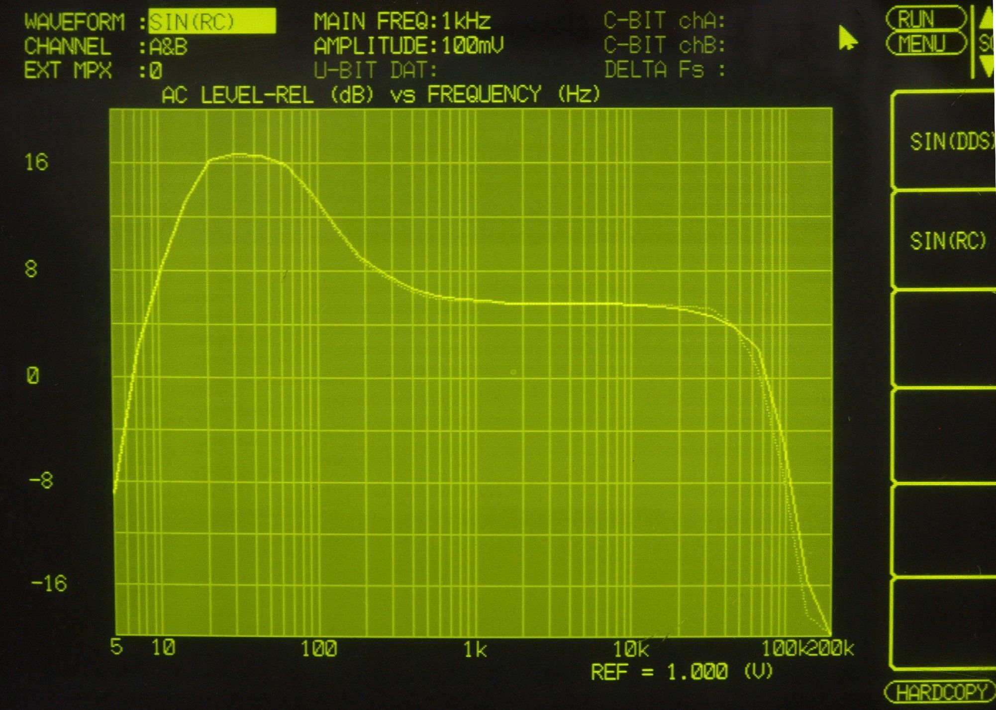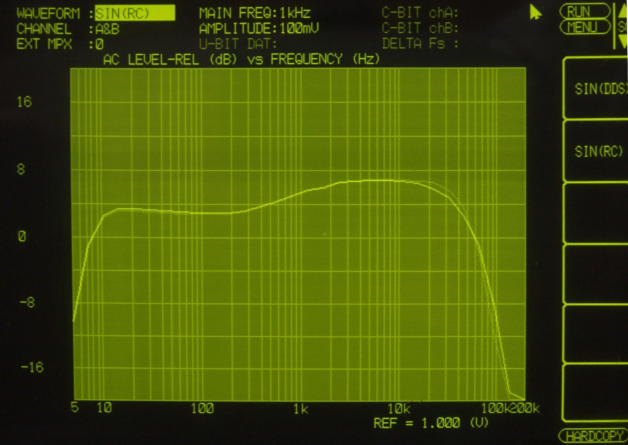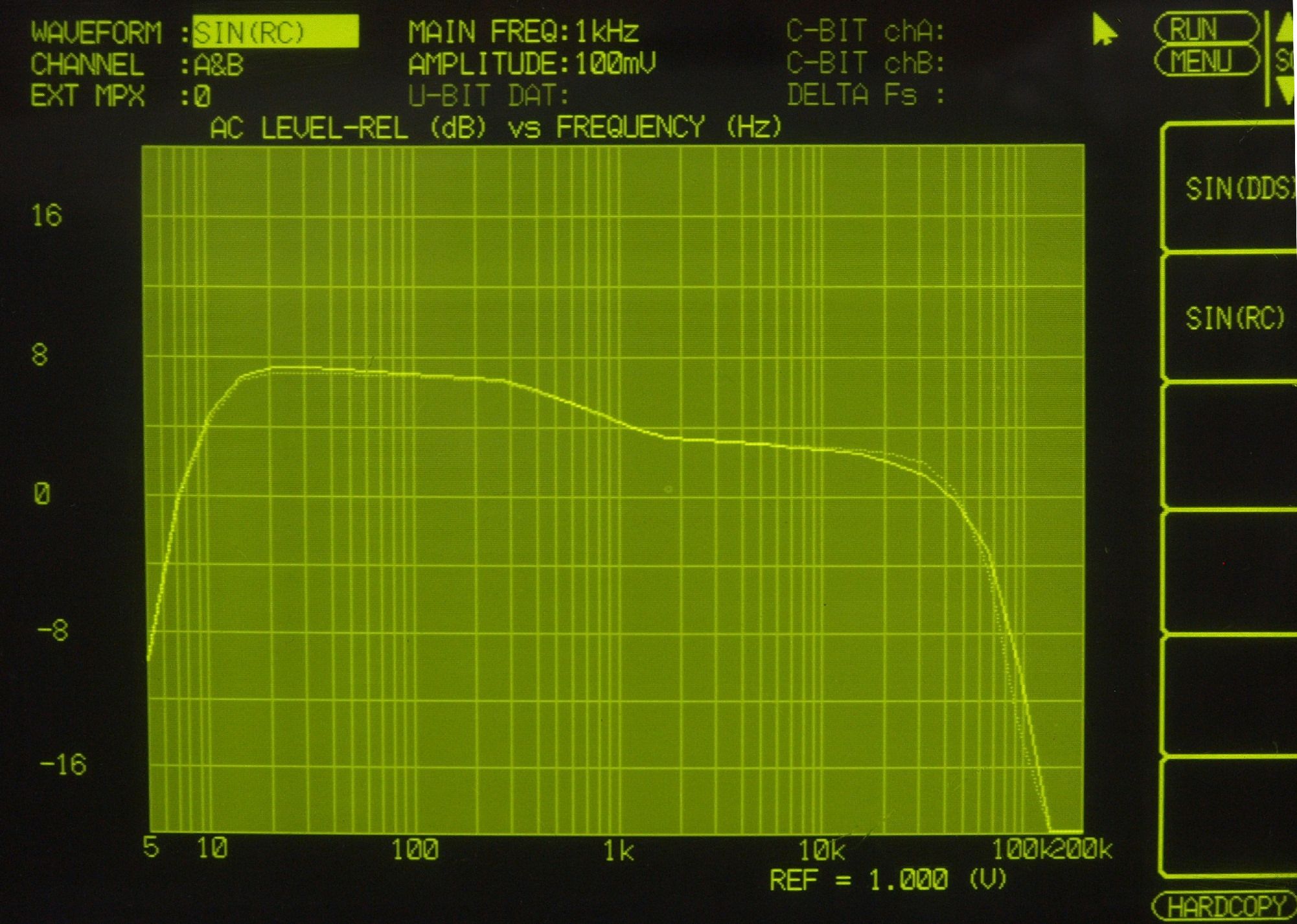 | F7. 入出力特性測定(Radio入力)。 100mVを入力。 BASS LIFT=0dB、TILT=−3dB。 VRはMax位置。 | ||||||||||||||||||||||||||||||||||||||||||||||||||||