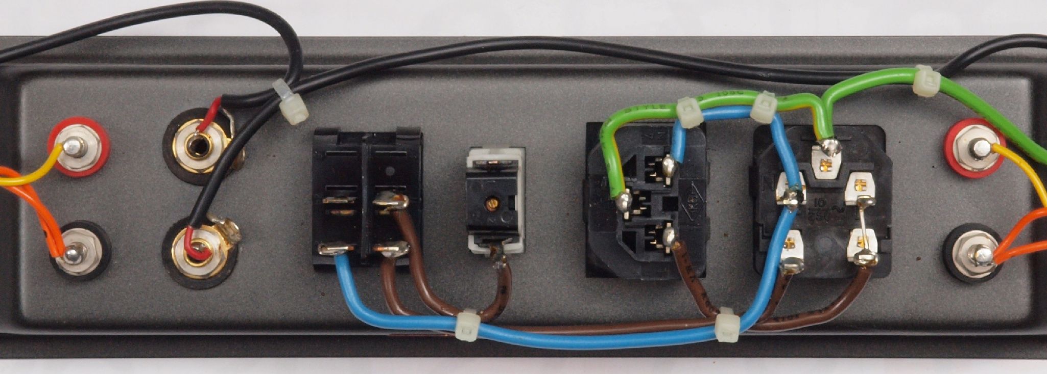 | C52. 修理(交換)後 端子パネル「SP出力端子・RCA入力端子」 RCA端子をWBT2010交換、SP出力端子をWBT−0730PLに交換。 |
