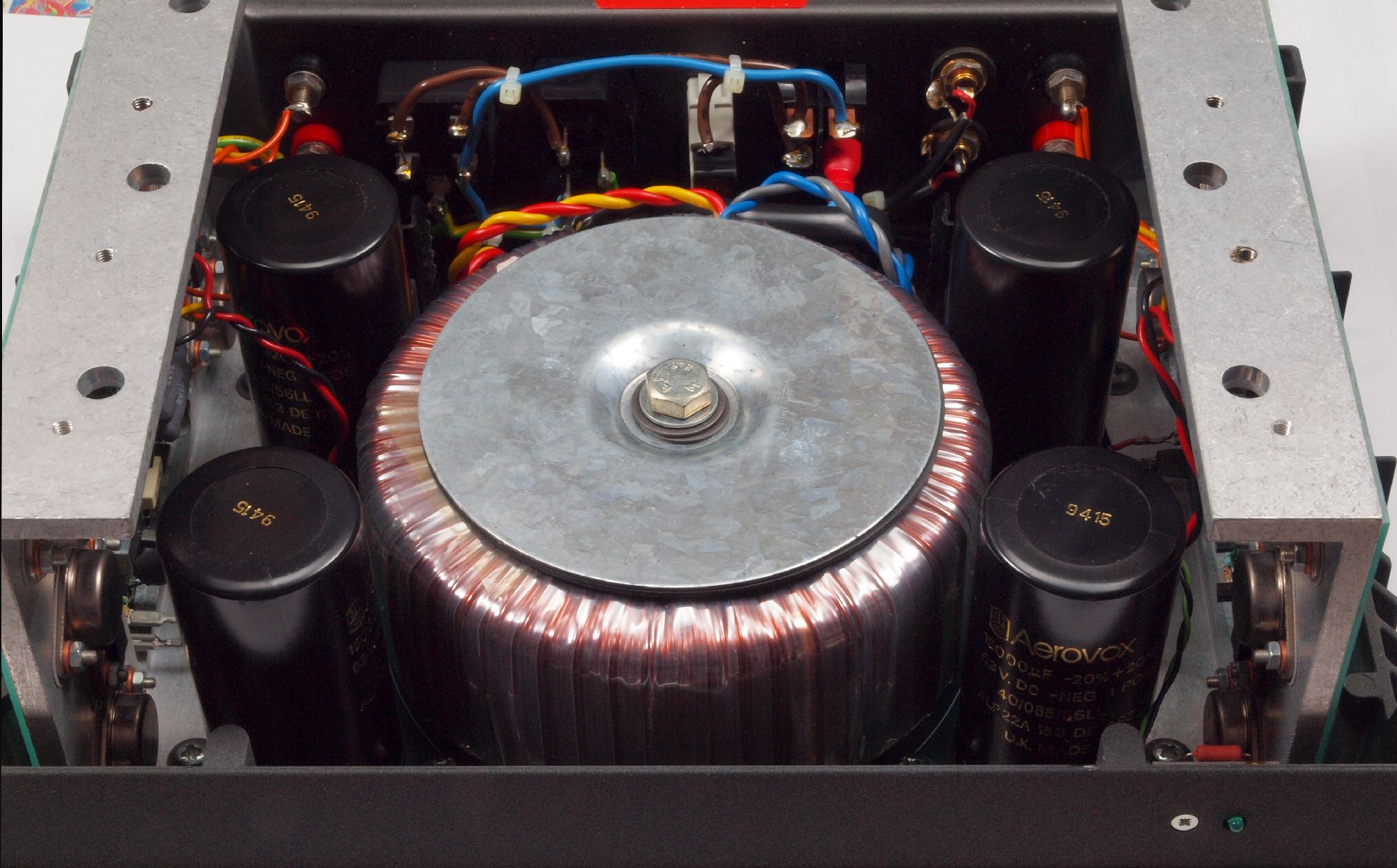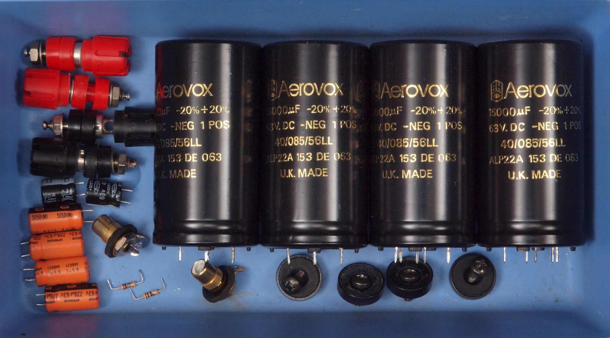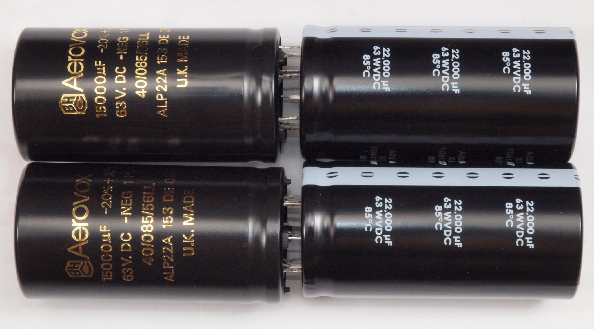 | A81. 点検中 電解コンデンサーの比較。左=付いていた物15000μ/63V、左=交換する物22000μ/63V。 | ||||||||||||||||||||||||||||