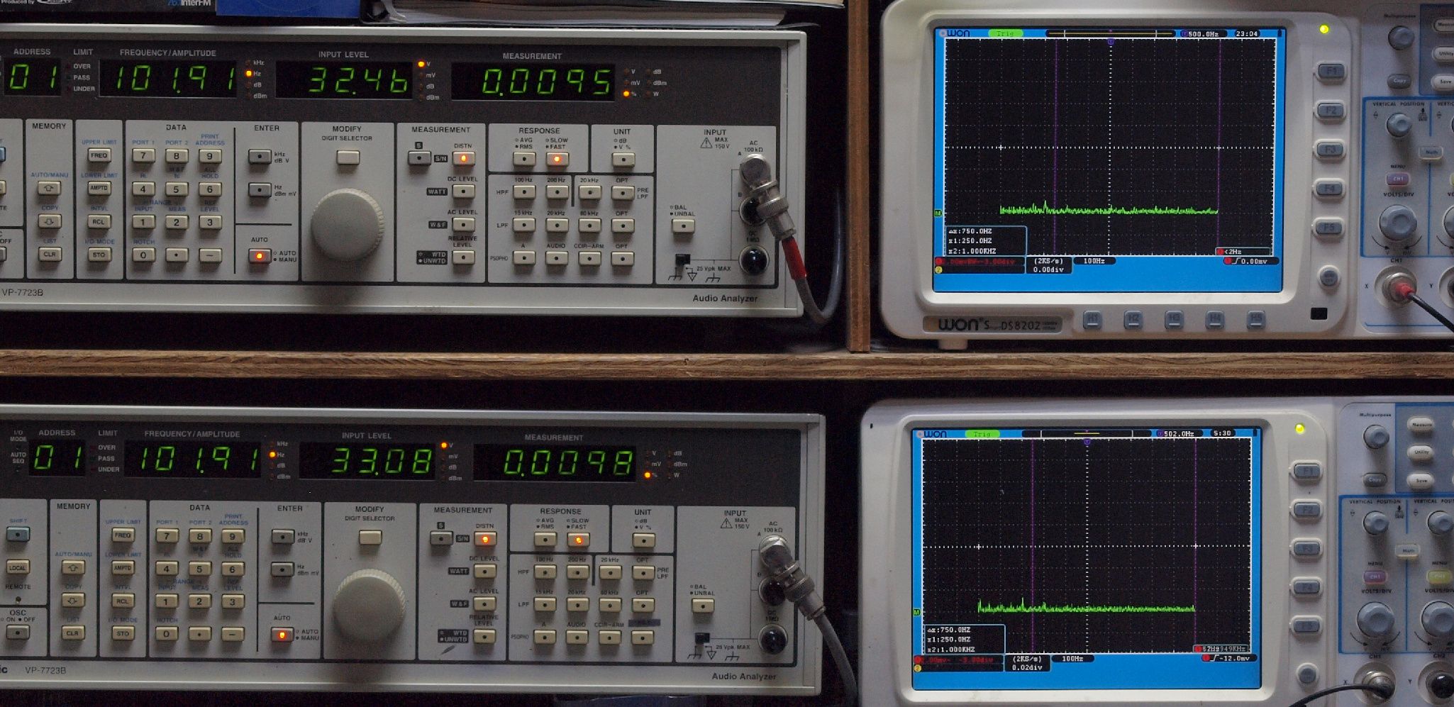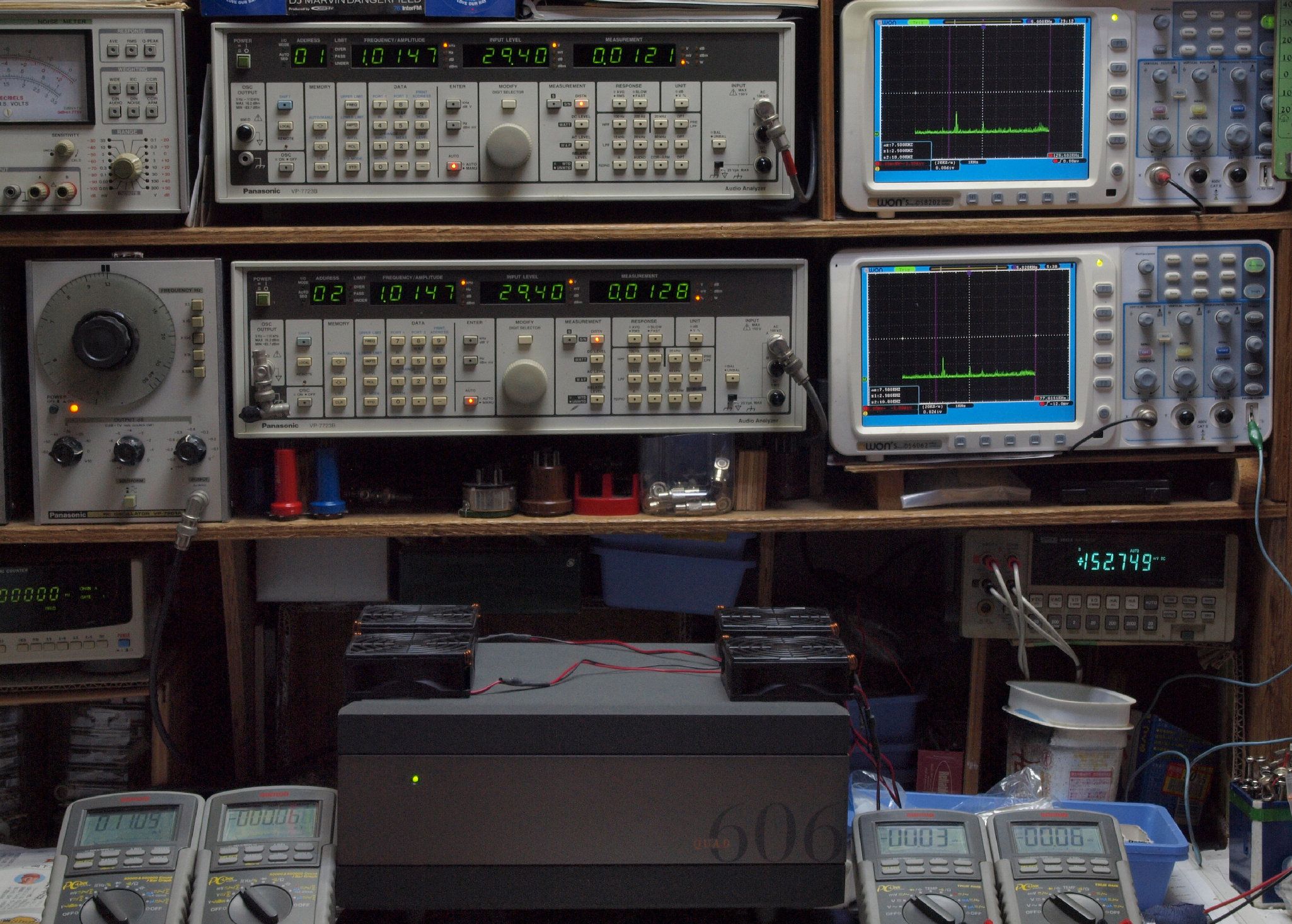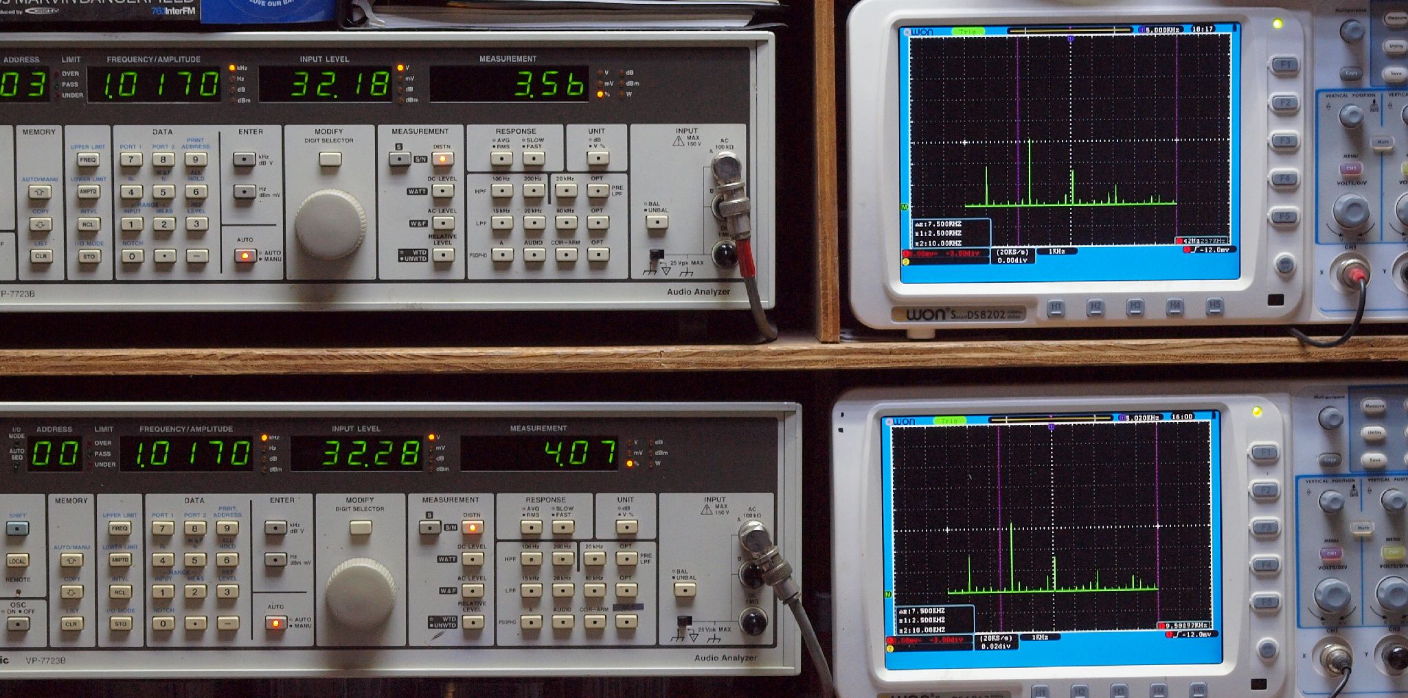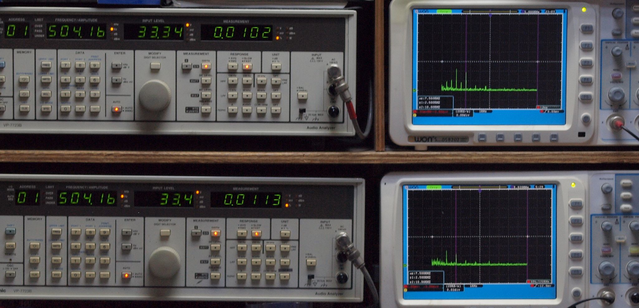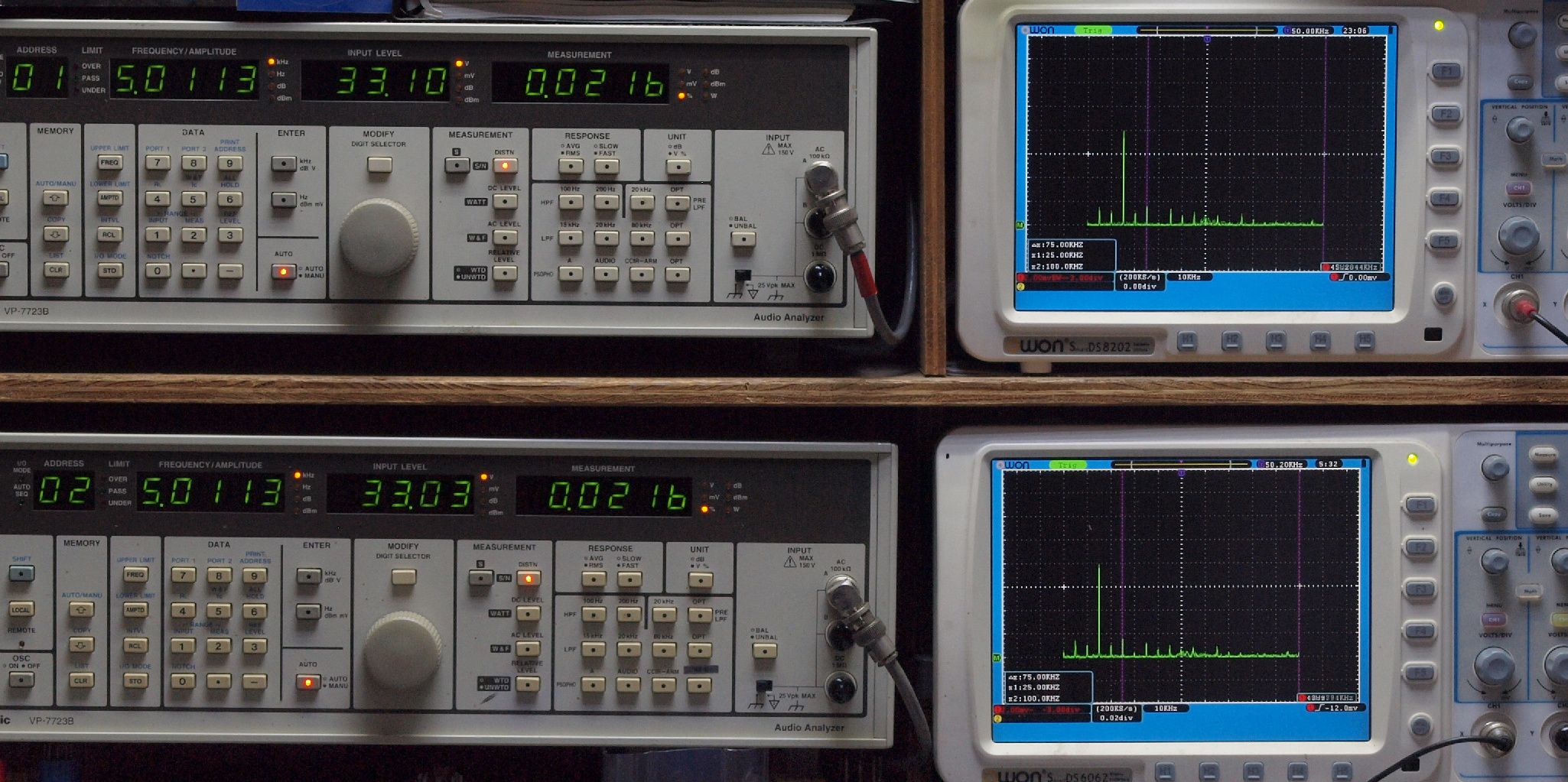 | E. 測定・調整。 画像をクリックすると、大きく(横幅2050ドット)表示されます。 E1. 出力・歪み率測定・調整 「見方」。 上段中 右側SP出力を「Audio Analyzer Panasonic VP−7723B」により測定。 表示LED、 左端=メモリーNo、 中左=周波数測定、 中右=出力電圧測定、 右端=歪み率測定。 上段右端 VP−7723Bの基本波除去出力を「owon SDS8202(200MHZ)」で「FFT分析」表示。 下段中 左側SP出力を「Audio Analyzer Panasonic VP−7723B」により測定。 表示LED、 左端=メモリーNo、 中左=周波数測定、 中右=出力電圧測定、 右端=歪み率測定。 下段右端 VP−7723Bの基本波除去出力を「owon SDS6062(200MHZ)」で「FFT分析」表示。 下段左端 オーディオ発振器 VP−7201A より50Hz〜100kHzの信号を出し(歪み率=約0.003%)、ATT+分配器を通し、AMPに入力。 よって、ダイアル設定出力レベルより低くなります。測定機器の仕様や整備の様子はこちら、「VP−7723B」「VP−7201A」。 FFT画面の見方はこちら。 |