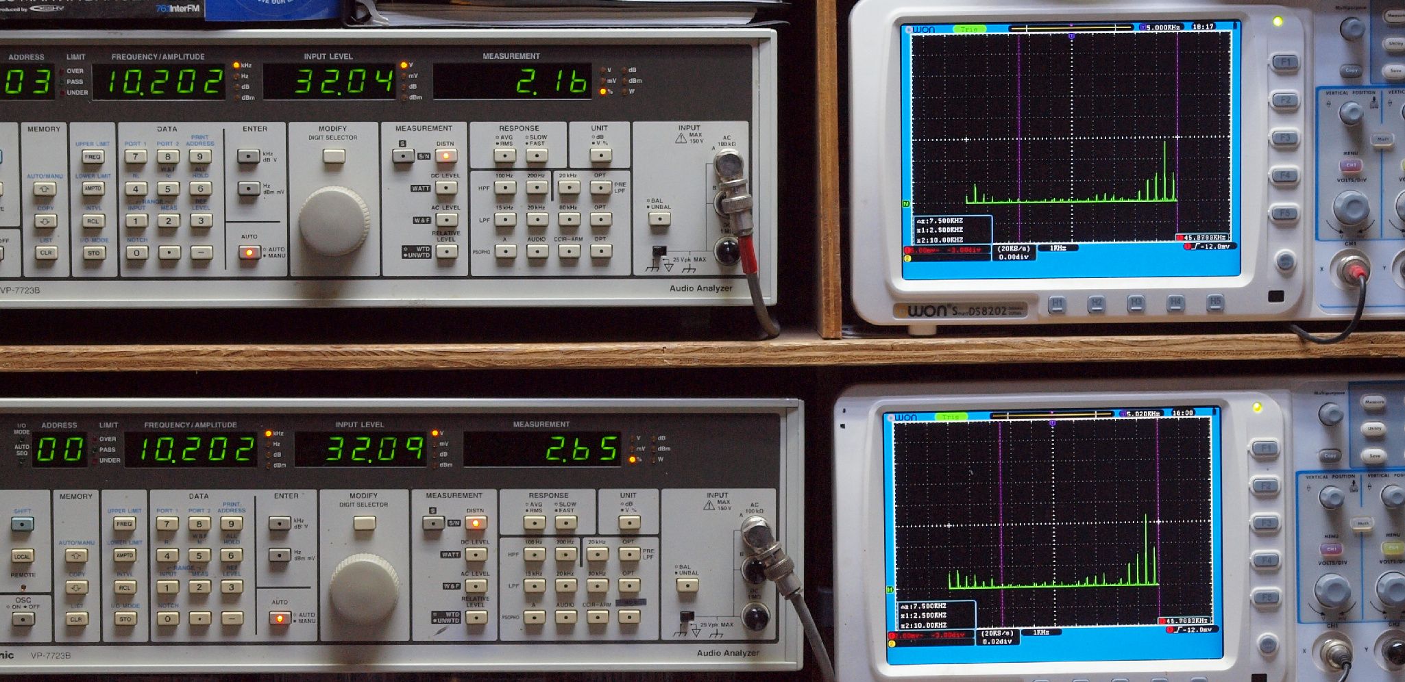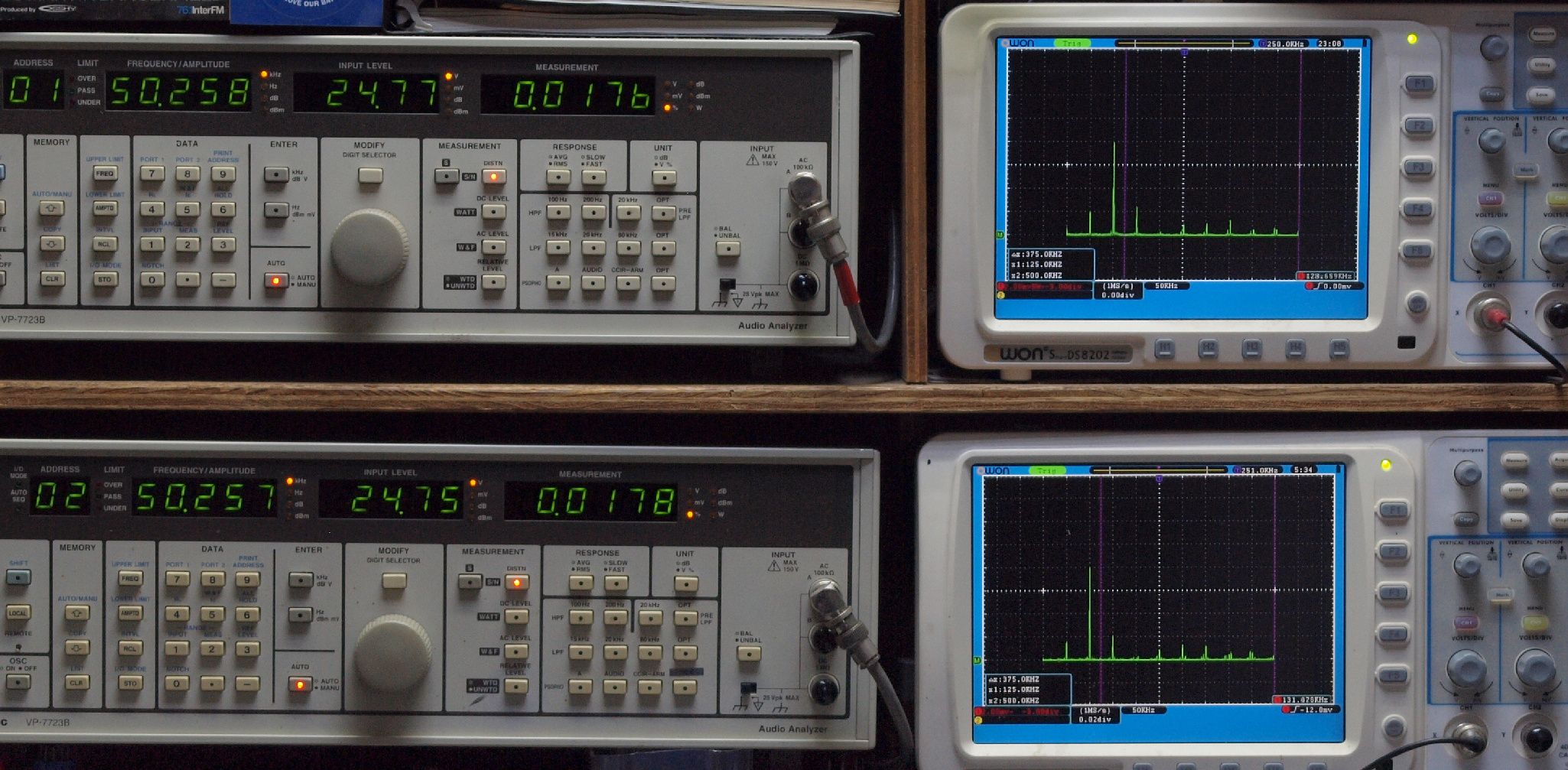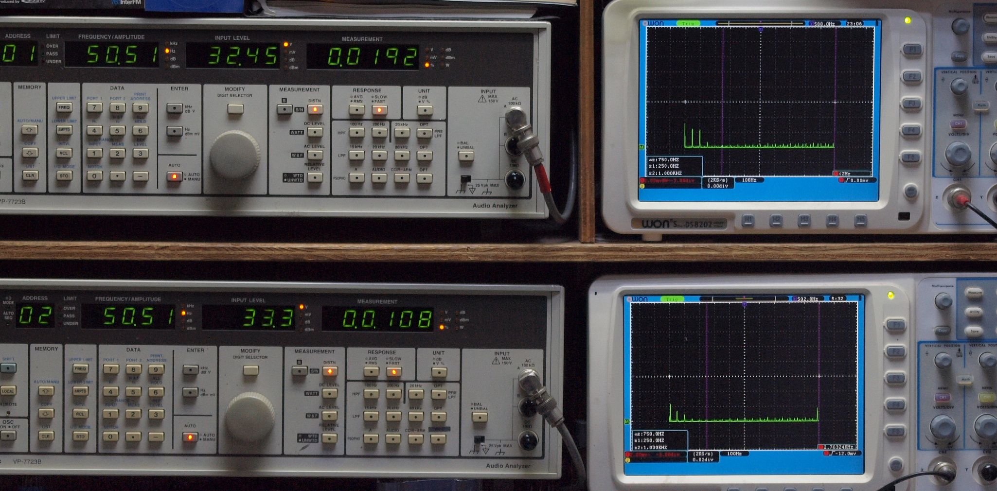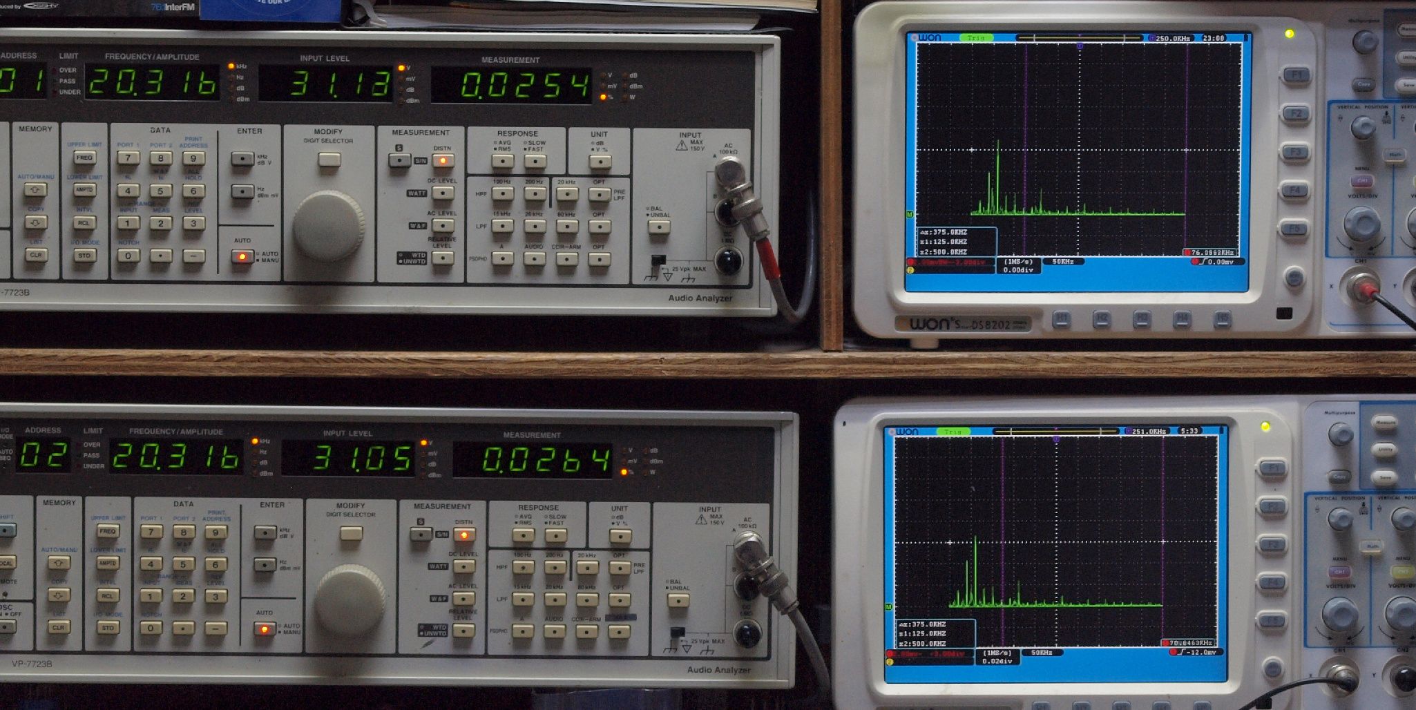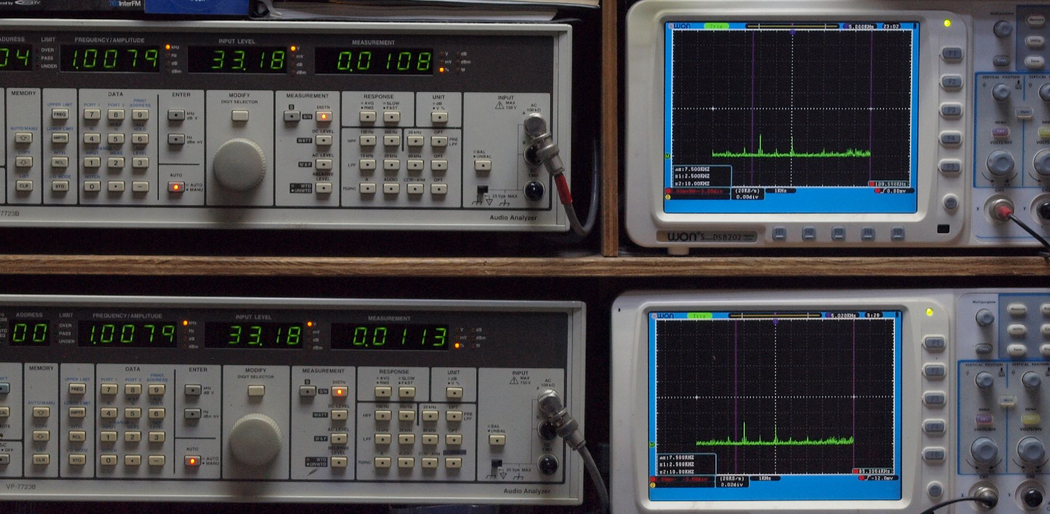 | E. 測定・調整。 画像をクリックすると、大きく(横幅2050ドット)表示されます。 E1. 出力・歪み率測定・調整 「見方」。 上段中 右側SP出力を「Audio Analyzer Panasonic VP−7723B」により測定。 表示LED、 左端=メモリーNo、 中左=周波数測定、 中右=出力電圧測定、 右端=歪み率測定。 上段右端 VP−7723Bの基本波除去出力を「owon SDS8202(200MHZ)」で「FFT分析」表示。 下段中 左側SP出力を「Audio Analyzer Panasonic VP−7723B」により測定。 表示LED、 左端=メモリーNo、 中左=周波数測定、 中右=出力電圧測定、 右端=歪み率測定。 下段右端 VP−7723Bの基本波除去出力を「owon SDS6062(200MHZ)」で「FFT分析」表示。 下段左端 オーディオ発振器 VP−7201A より50Hz〜100kHzの信号を出し(歪み率=約0.003%)、ATT+分配器を通し、AMPに入力。 よって、ダイアル設定出力レベルより低くなります。測定機器の仕様や整備の様子はこちら、「VP−7723B」「VP−7201A」。 FFT画面の見方はこちら。 |