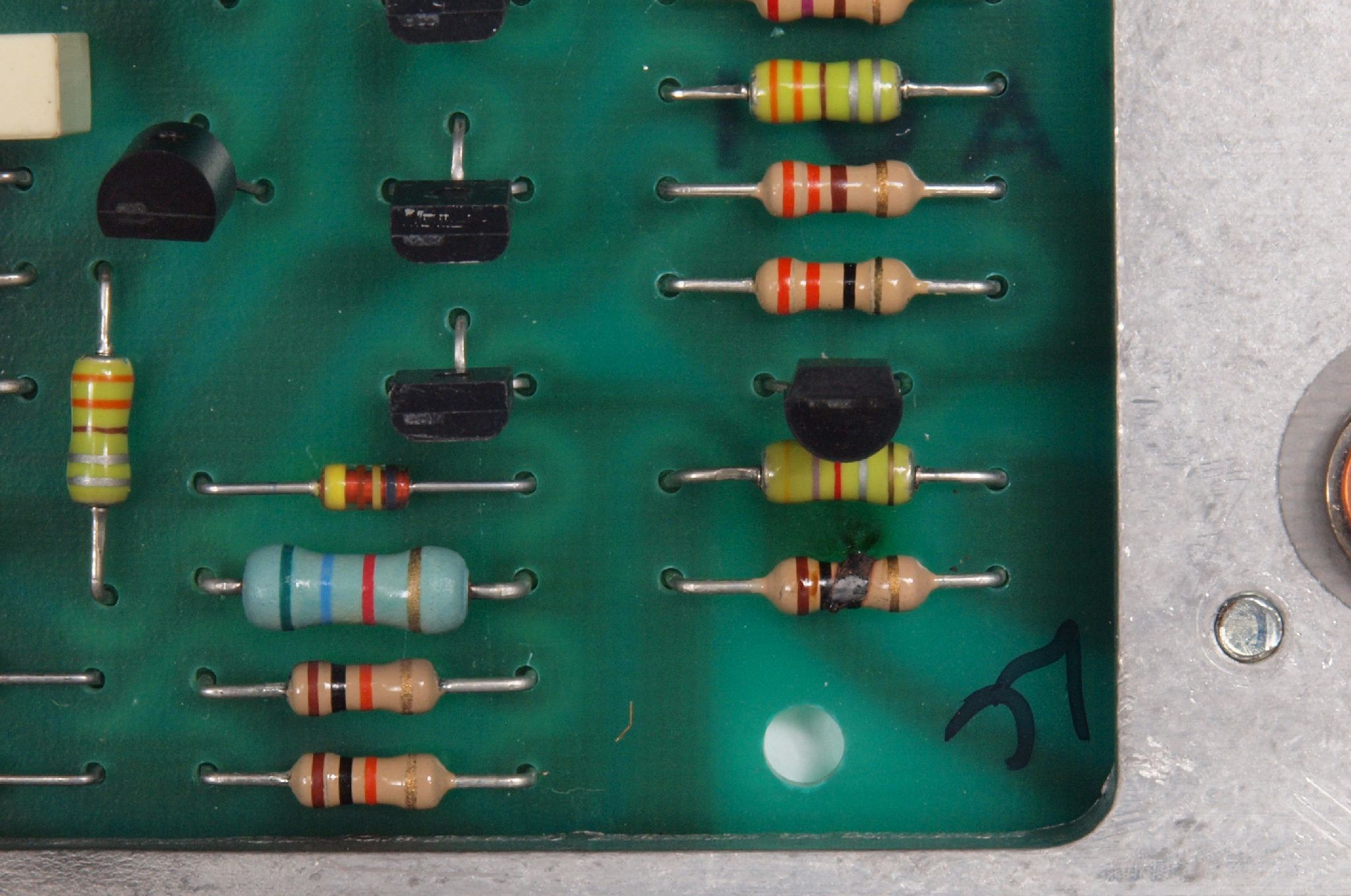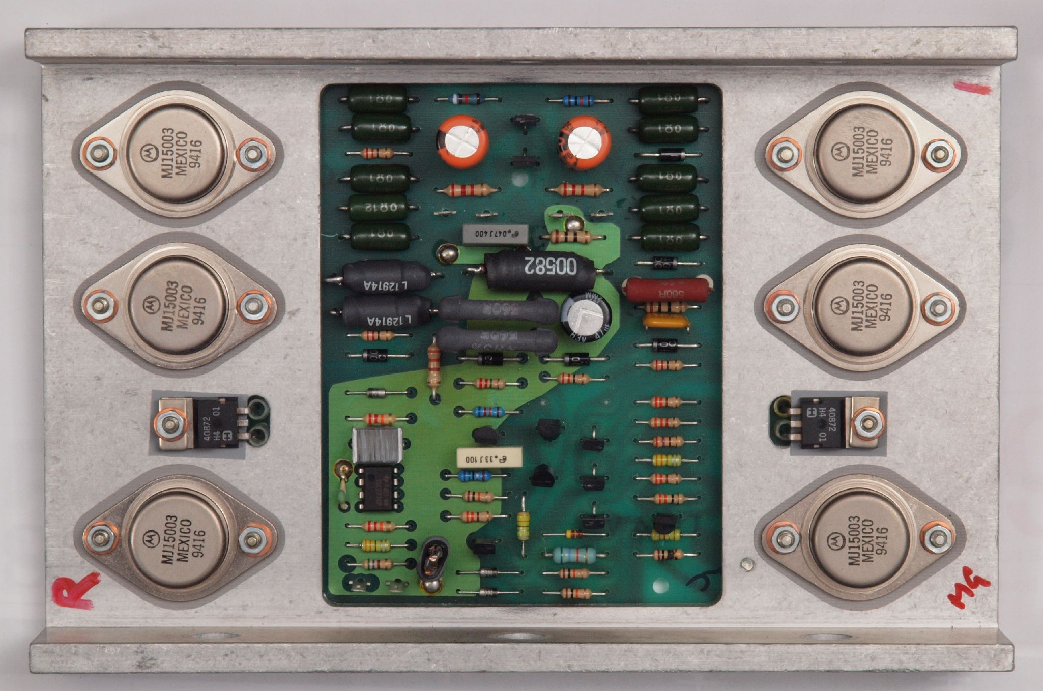 | C112. 修理中 R側AMP基板。 焼けたアース接続抵抗。 電源コードのアース線の回り込みで起こる。 | ||||||||||||||||||||||||||||