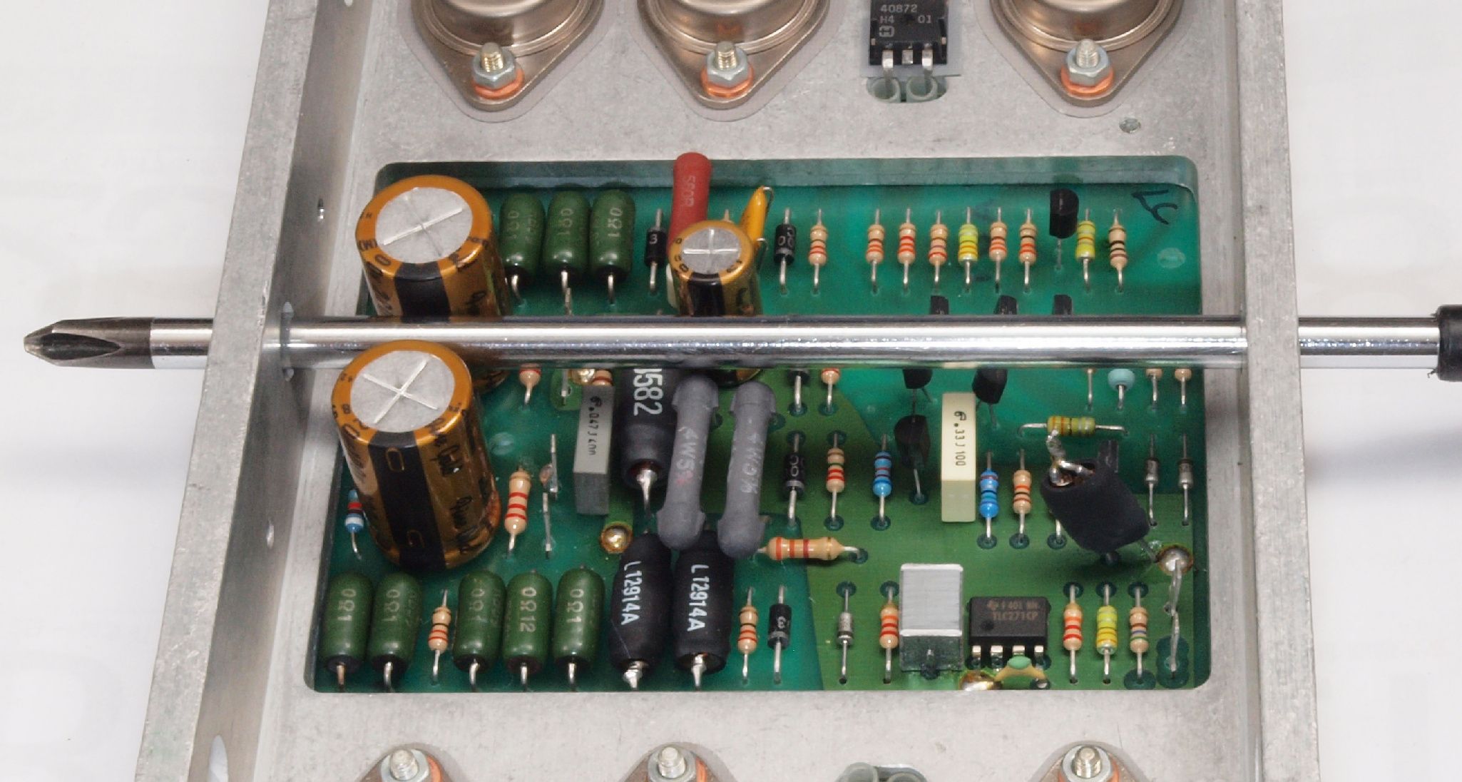 | C12. 修理後 R側AMP基板。 電解コンデンサー3個、抵抗1個、OP−AMP交換 | ||||||||||||||||||||||||||||