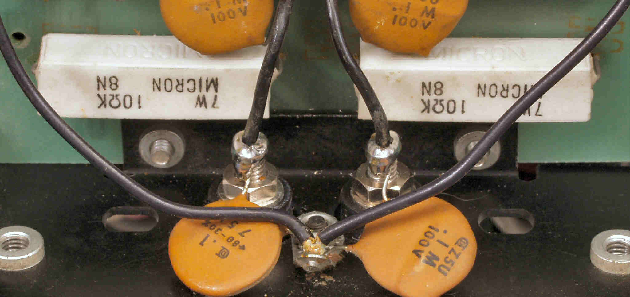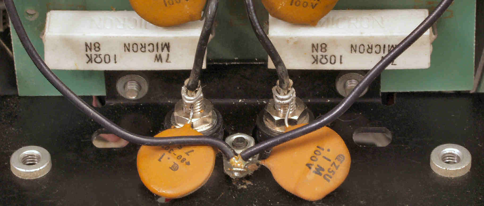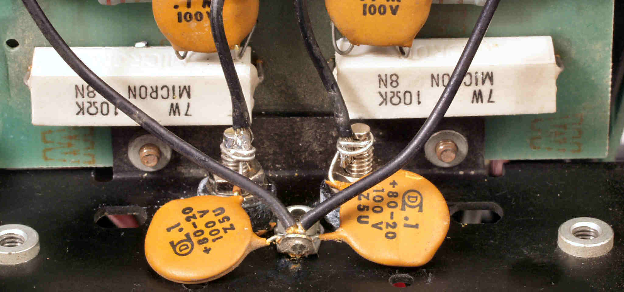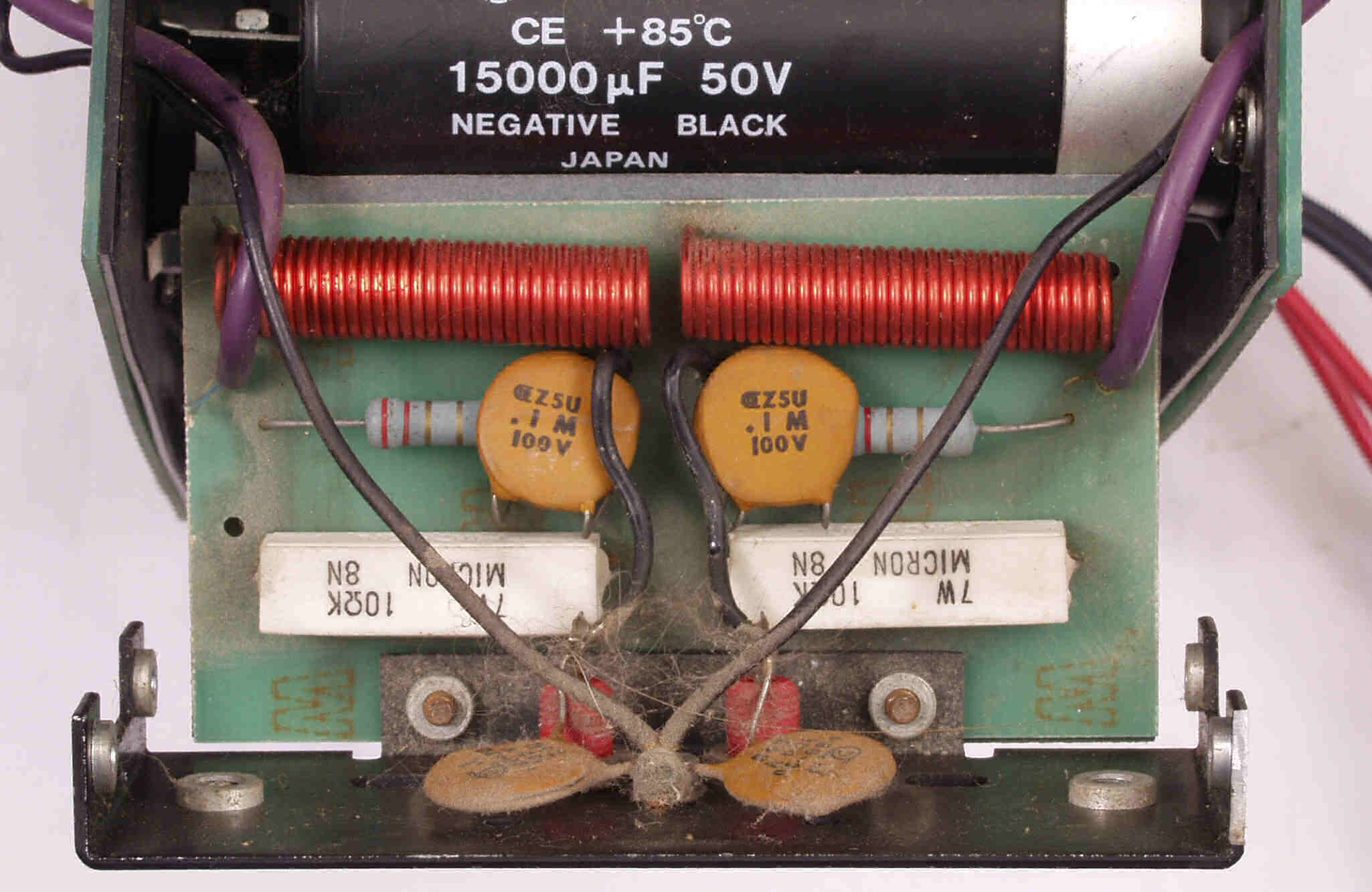 CA1. 修理前 R側SP端子・フルター基板、 上の電解コンデンサーの下に入るので大型のSP端子は使用出来ない