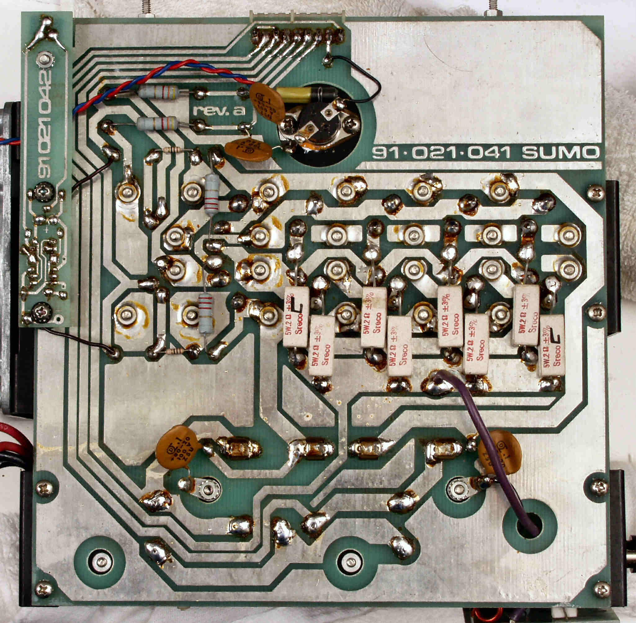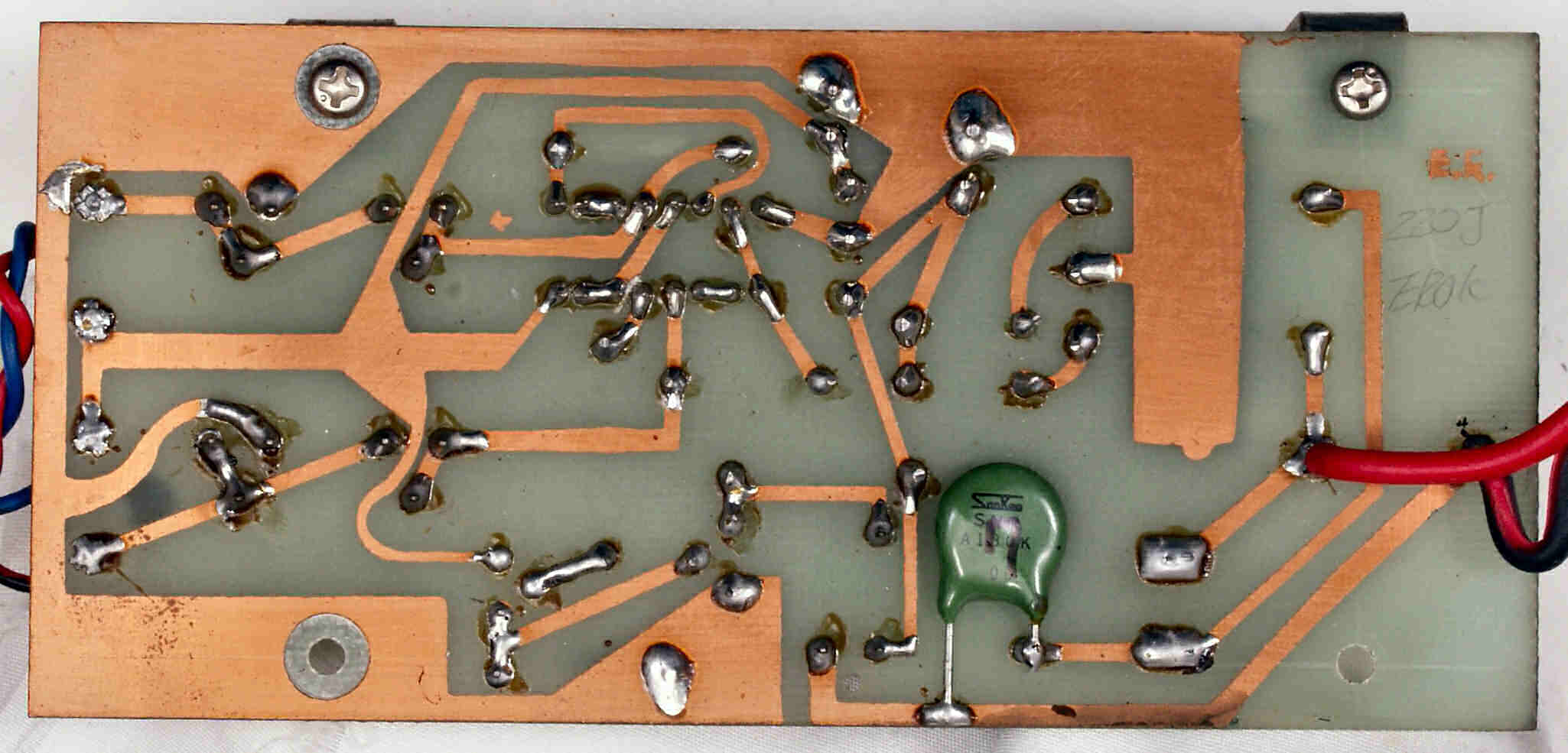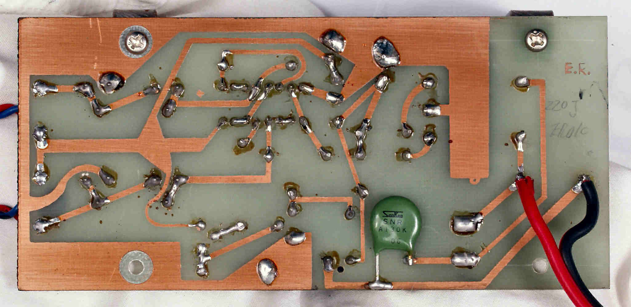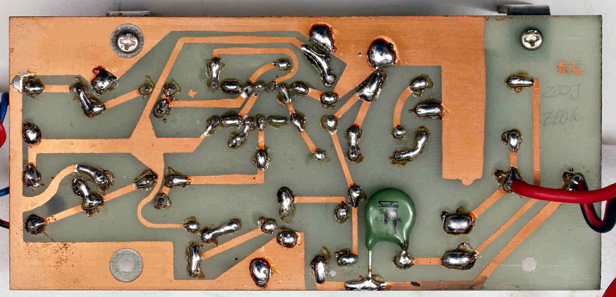 C59. 修理(半田補正)後 R「−」側−終段TR(トランジスター)基板裏、 半固定VR1個交換
