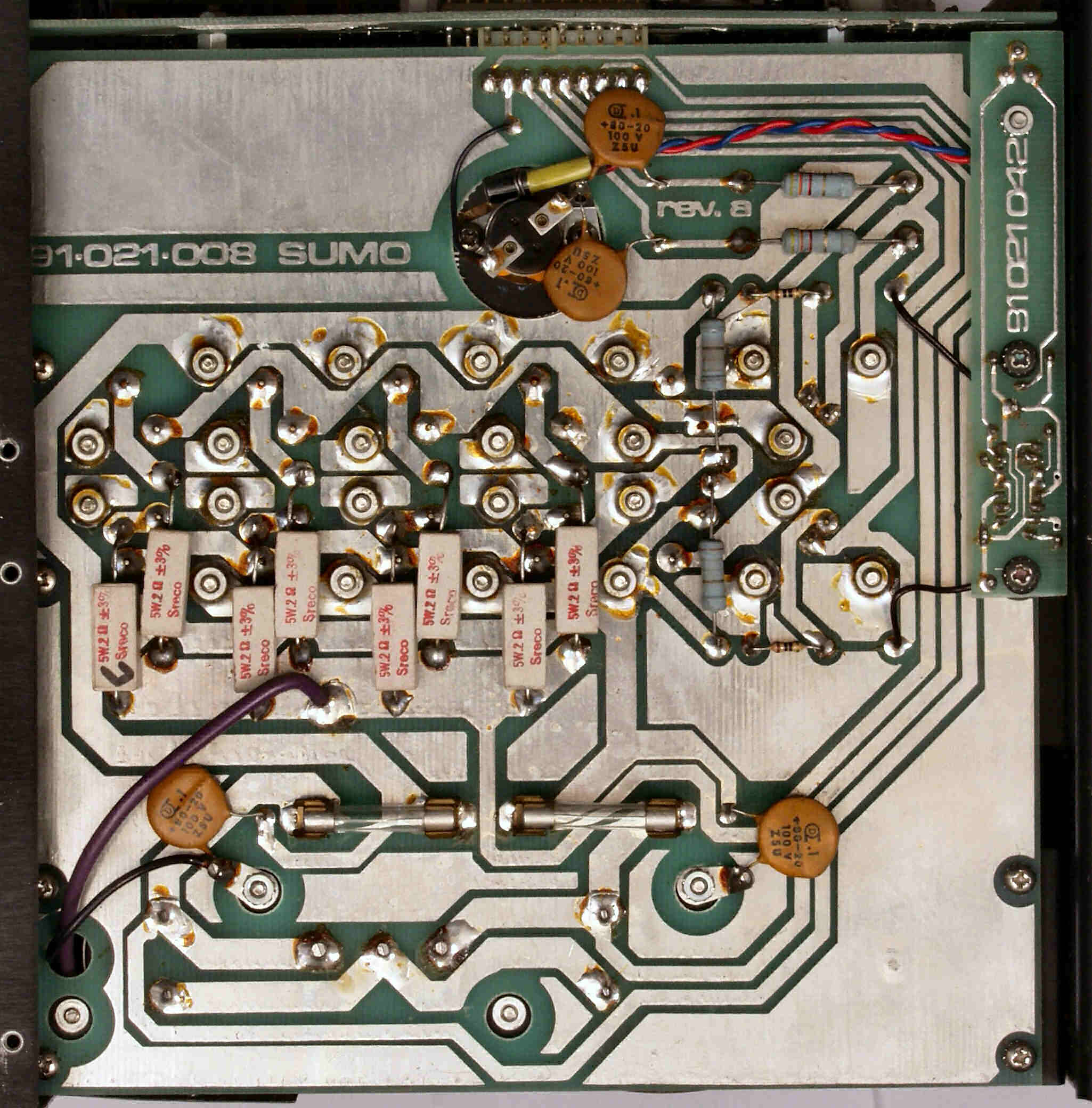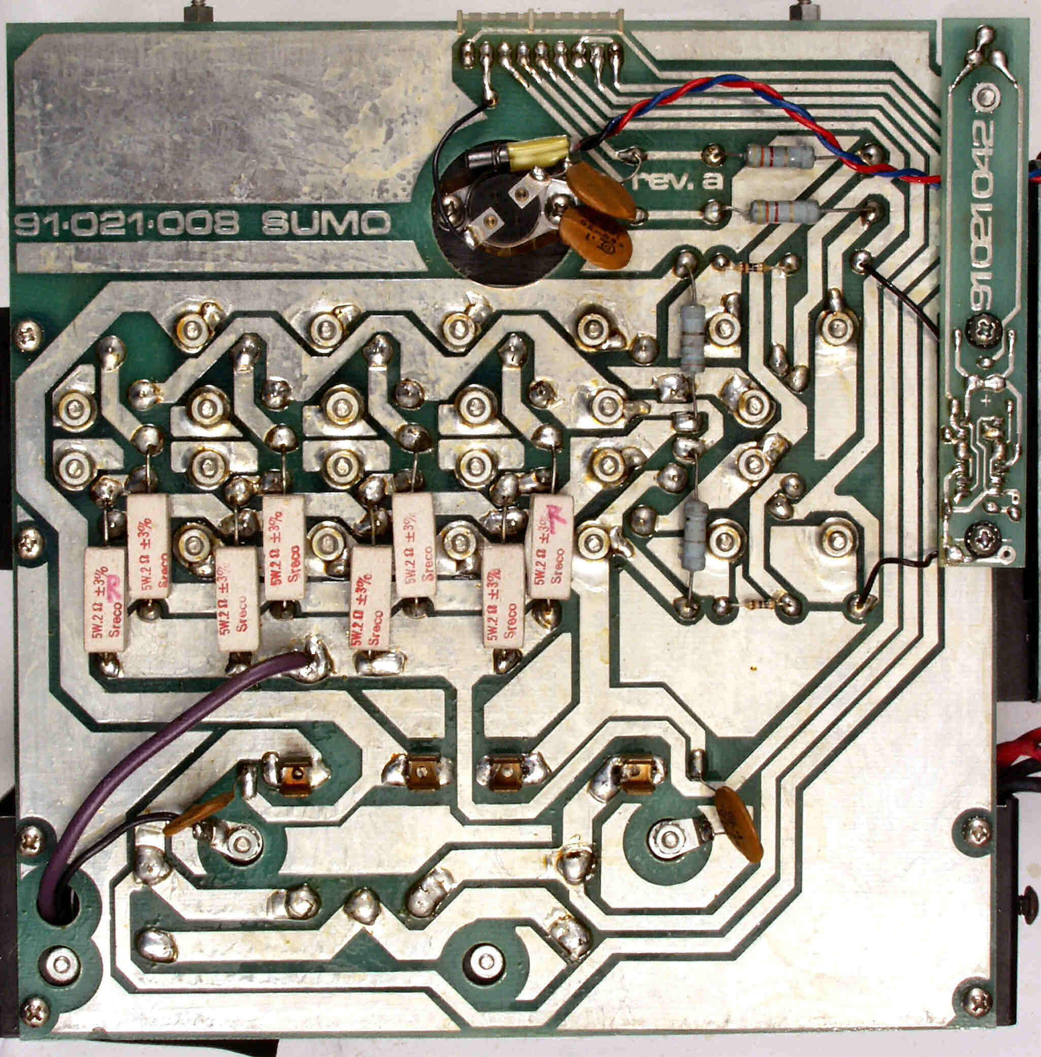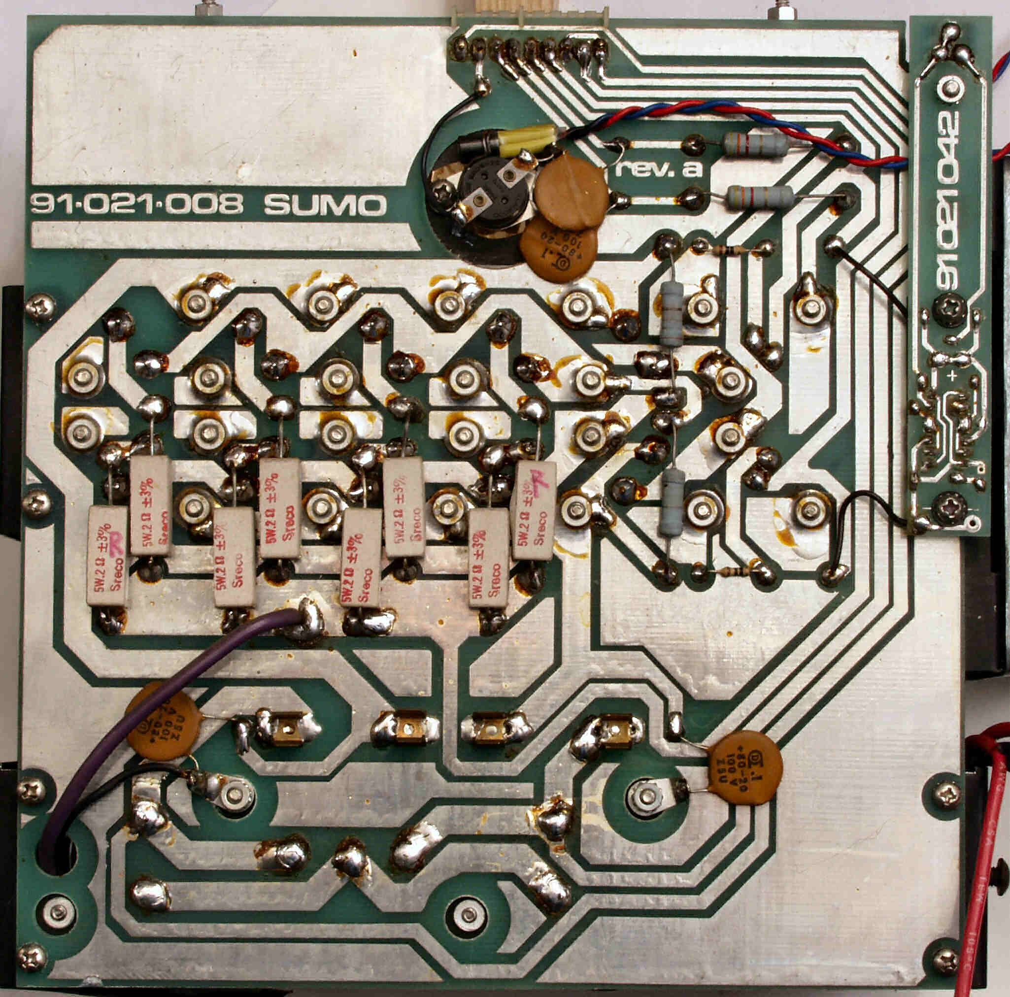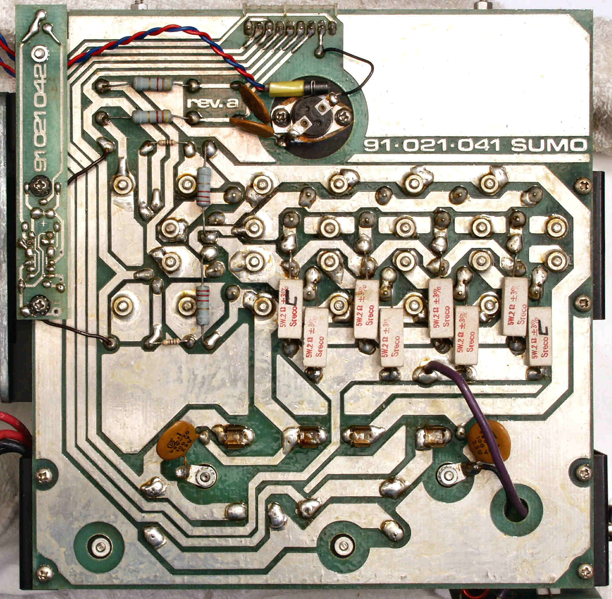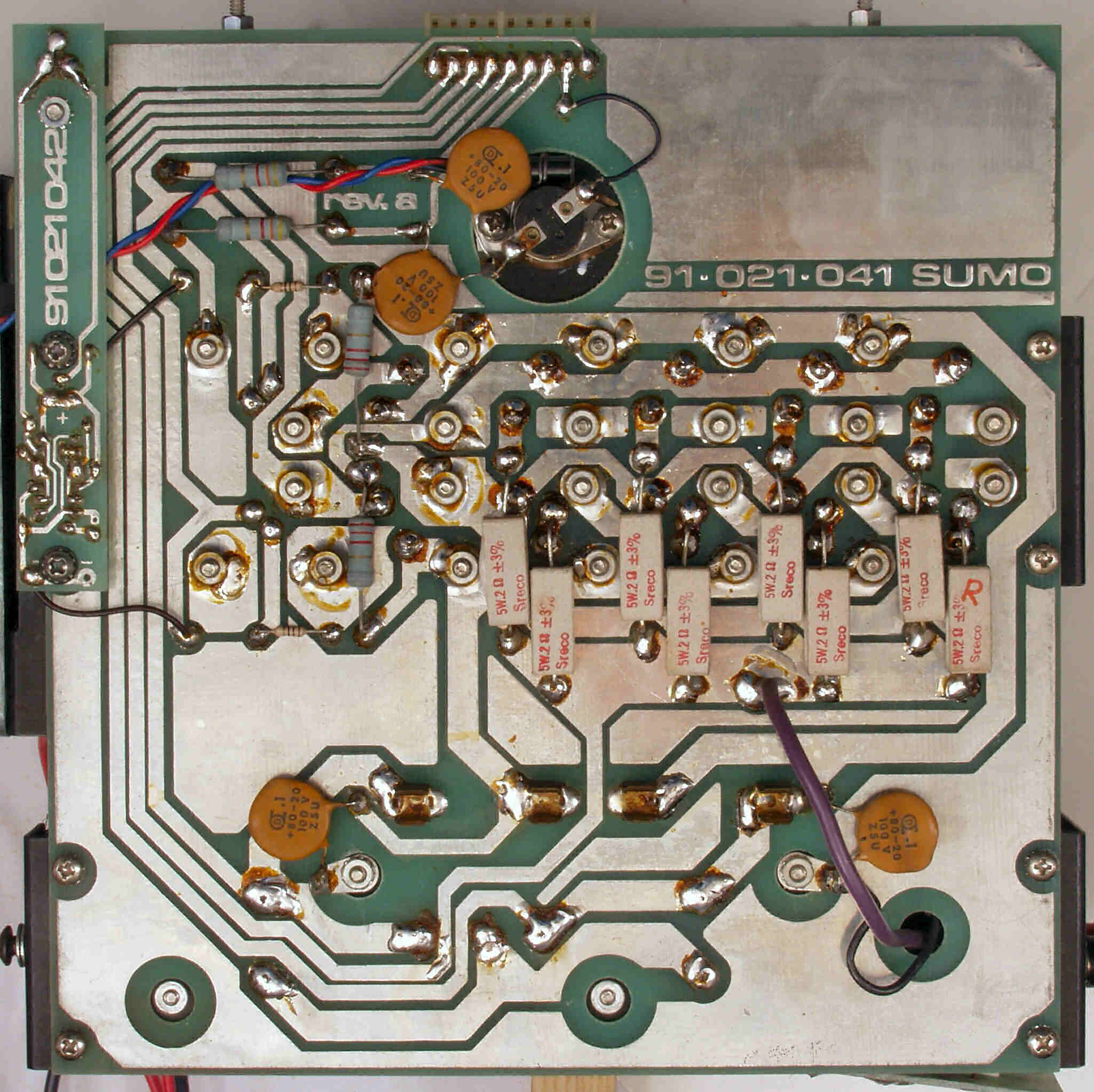 C59. 修理(半田補正)後 R「−」側−終段TR(トランジスター)基板裏、 半固定VR1個交換