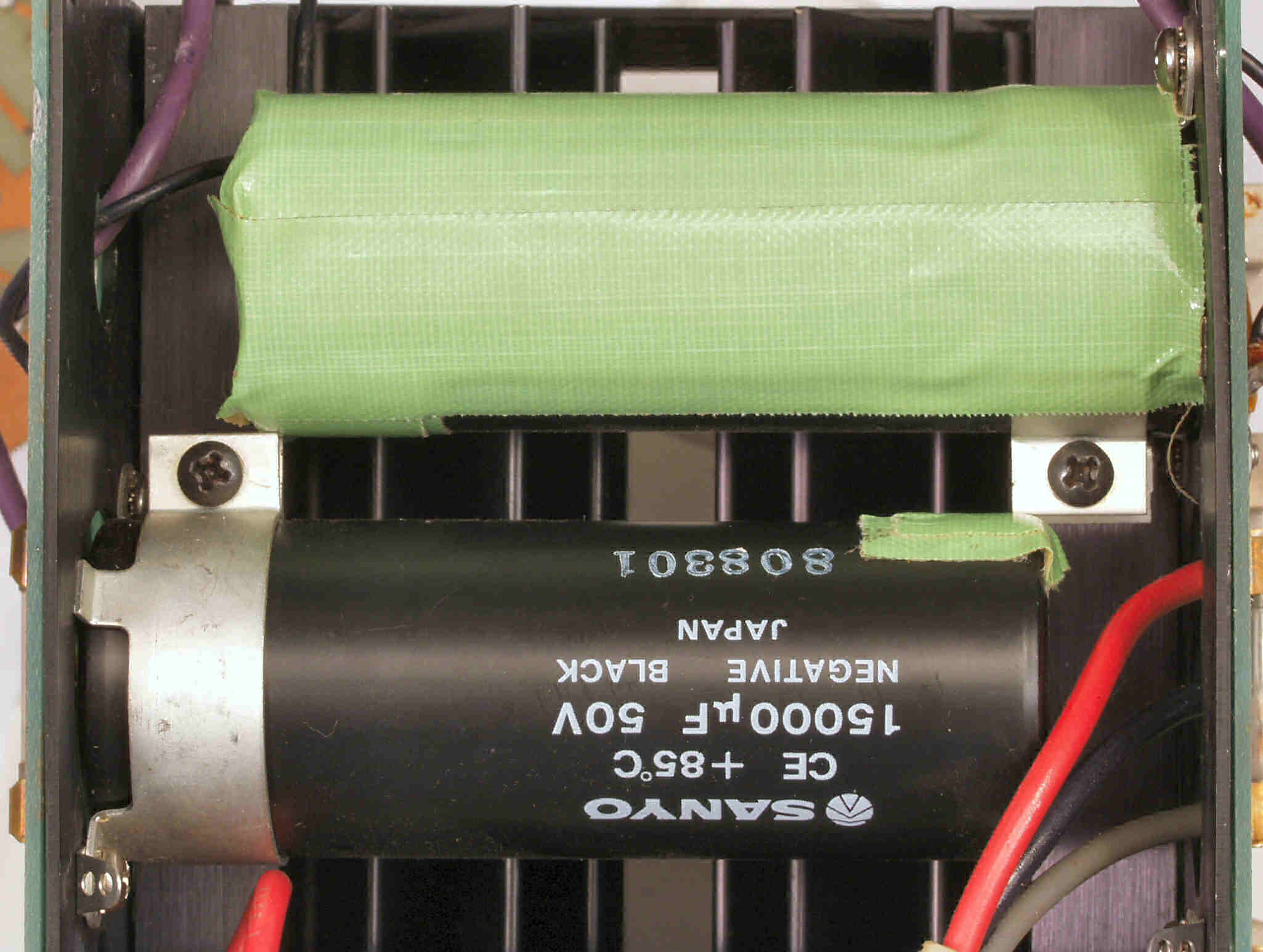 CD1. 修理前 L側電解コンデンサー取り付け(固定)。 設計が悪く、取り付けアングル金具が当たる!