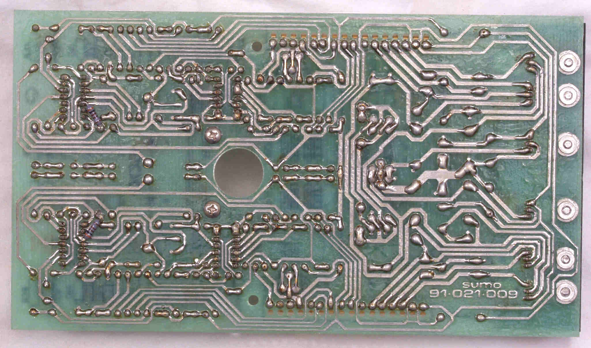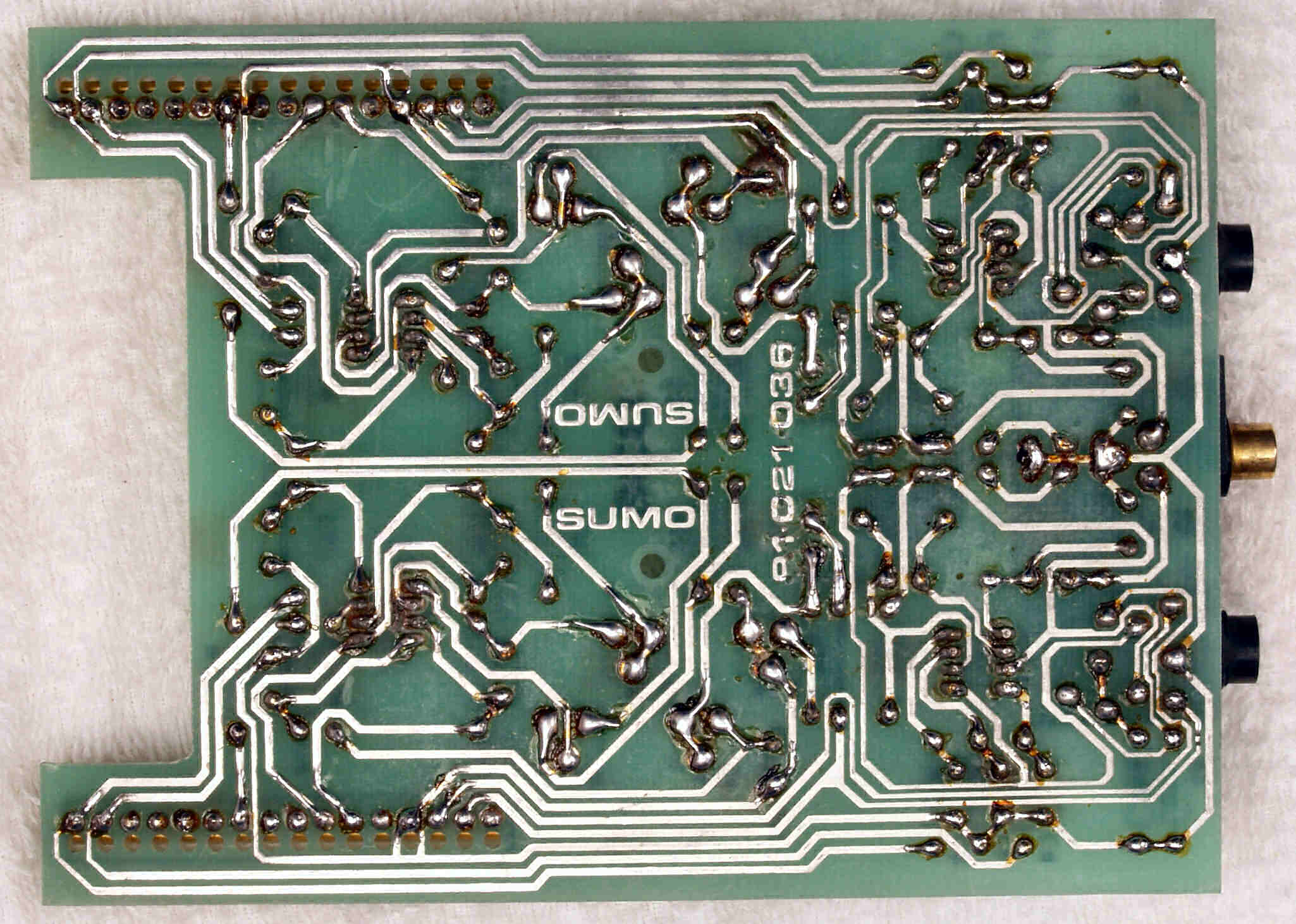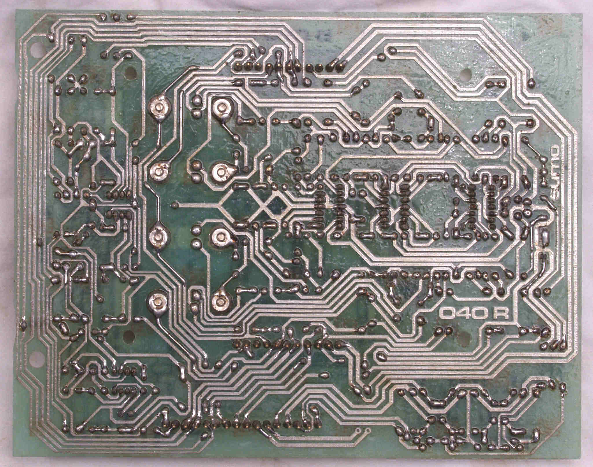 C64. 修理(半田補正)後 L「+」側−終段TR(トランジスター)基板裏、 半固定VR1個交換