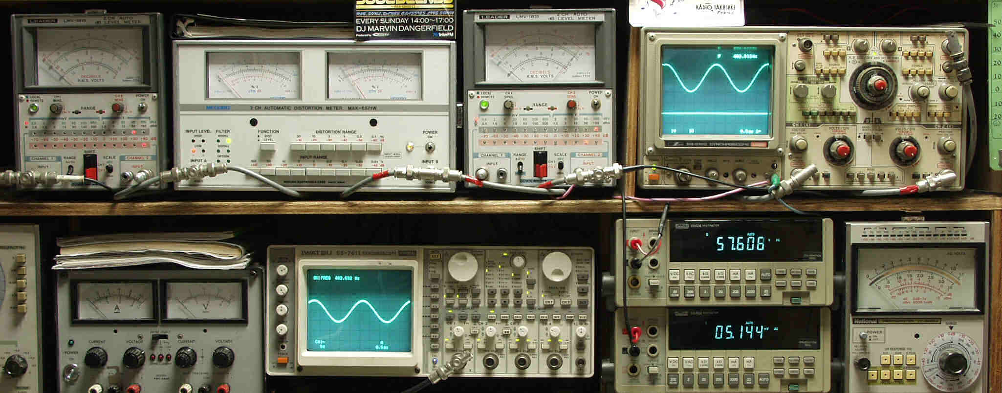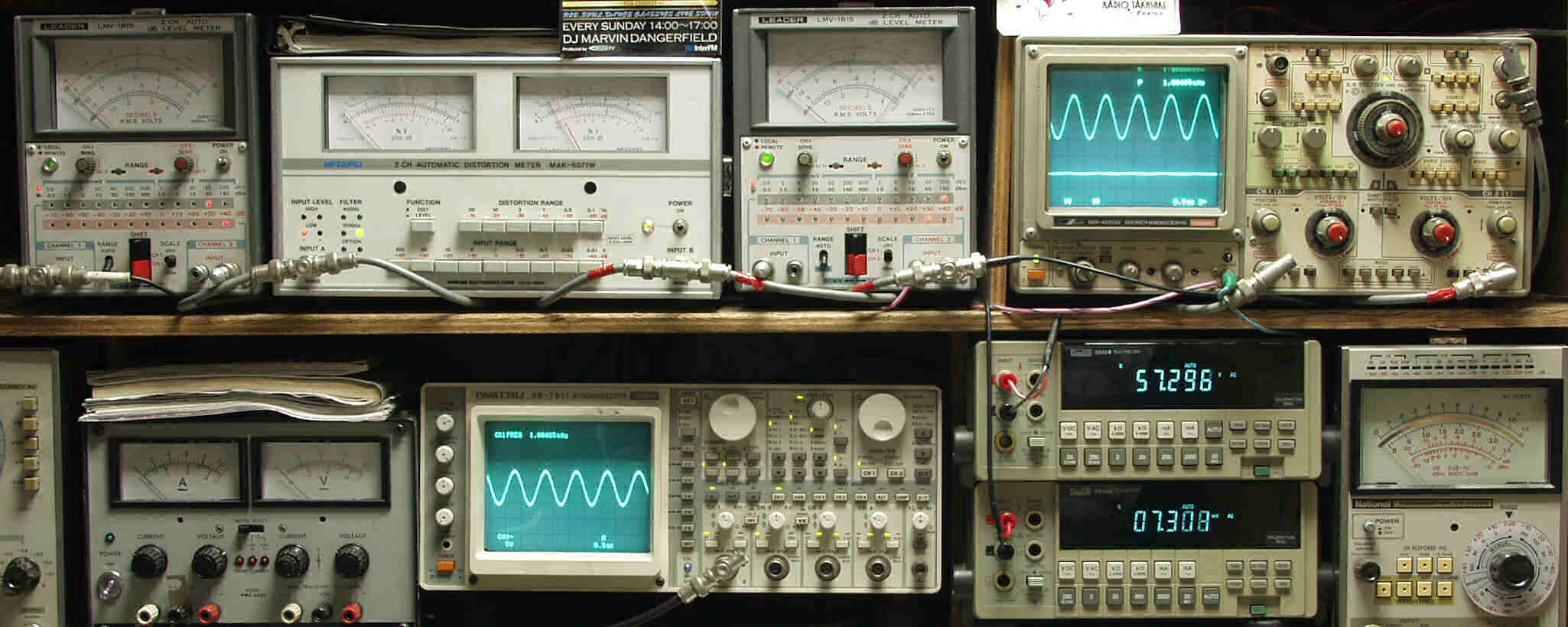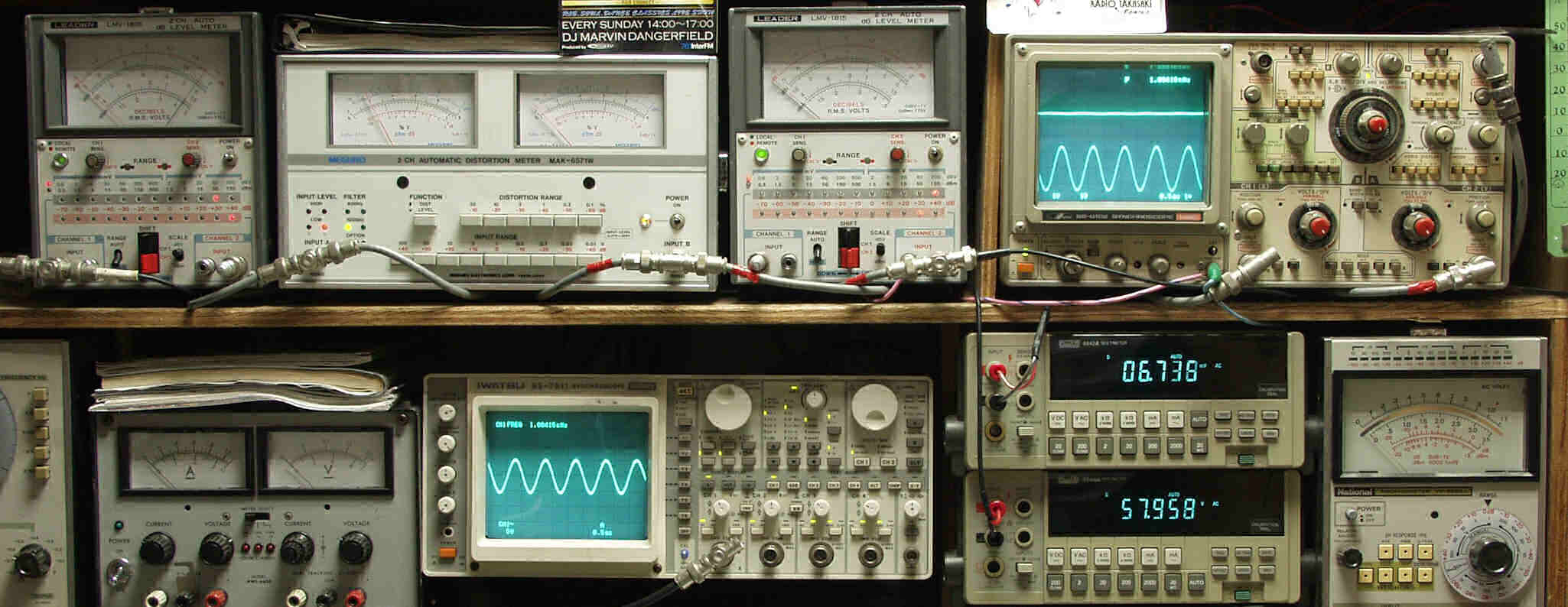 上段中左 歪み率計=出力の歪み率測定 左メータ=L出力、右メータ=R出力