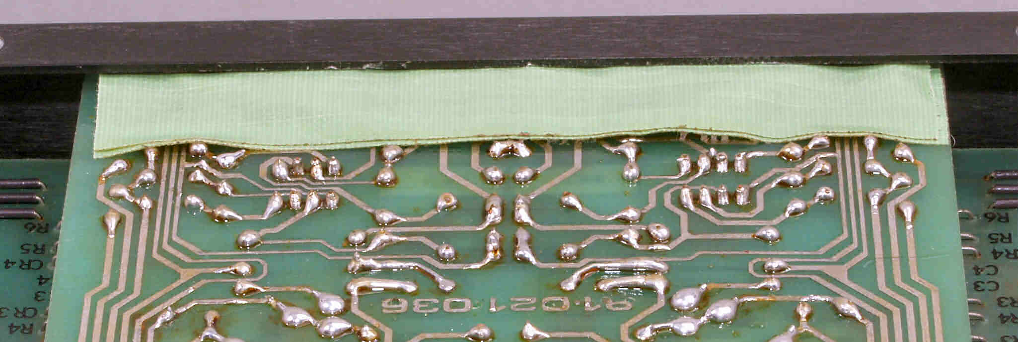 CE8. 修理後 設計が悪くシャーシに基板裏の配線が当たりそう!。 シートをガムテープで包み挿入する