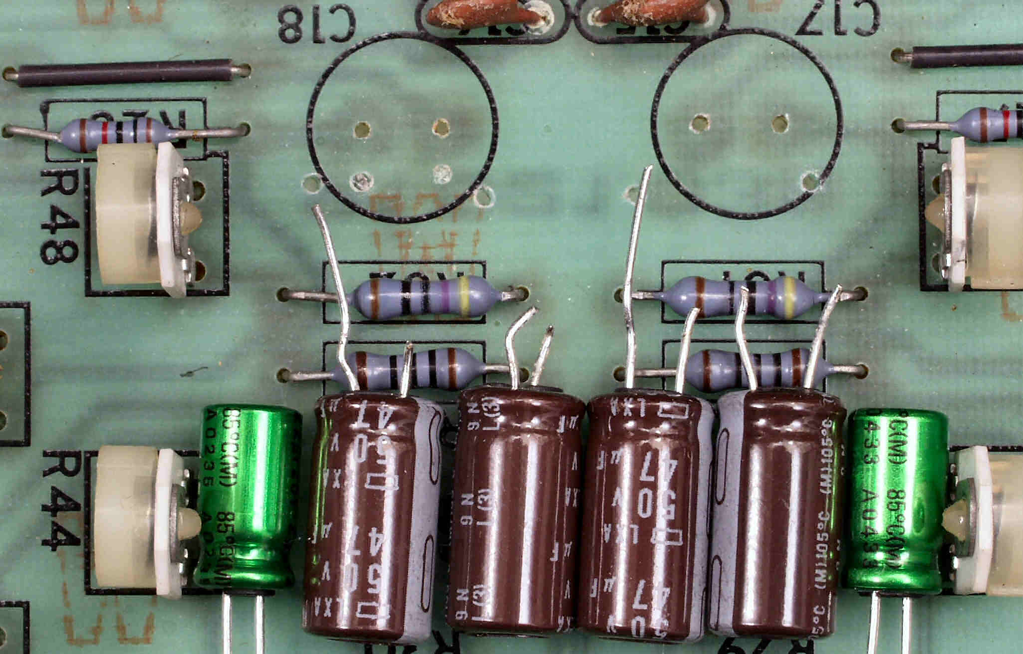 C22. 修理前 入力AMP基板。 本来はバイポーラだったのを、前回の修理で通常の電解コンデンサーに交換している