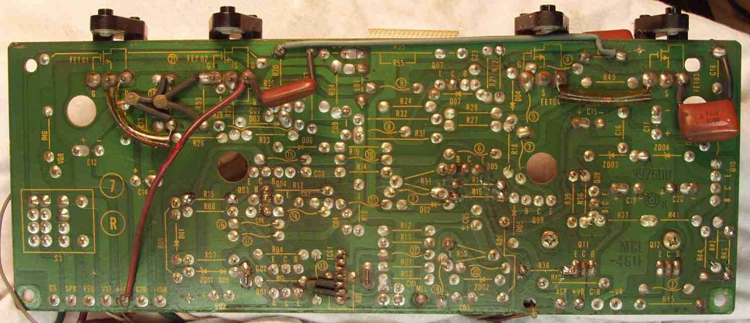 C1B. 修理後 Rドライブ基板 初段FET(電界効果トランジスター)、バランス/バイアス調整用半固定VR、SP接続リレー交換