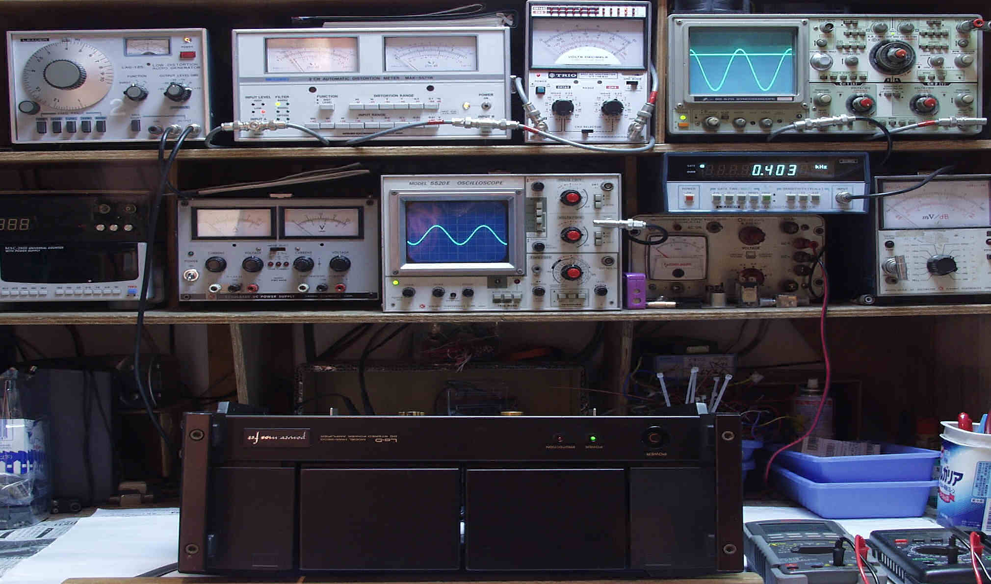 | E. 調整・測定 E1. 出力/歪み率測定・調整 <見方> 上左オーディオ発振器より400HZ・1KHZの信号を出す(歪み率=約0.003%) 下中=入力波形(オーディオ発振器のTTLレベル) 下右=周波数計 上左=SP出力の歪み率測定 左メータ=L出力、右メータ=R出力 上中=SP出力電圧測定器、赤針=R出力、黒針=L出力 上右=SP出力波形オシロ 上=R出力、下=L出力(出力電圧測定器の出力) |