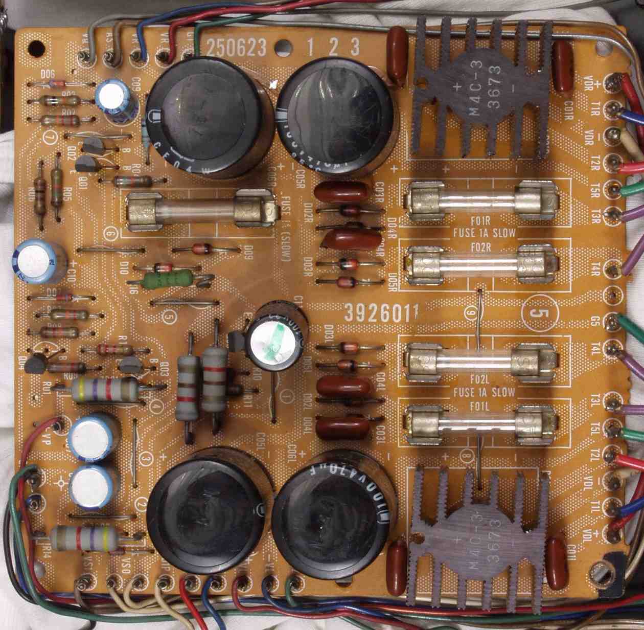 | C4B. 修理後 電源基盤 電解コンデンサー9個、フューズ入り抵抗交換 |