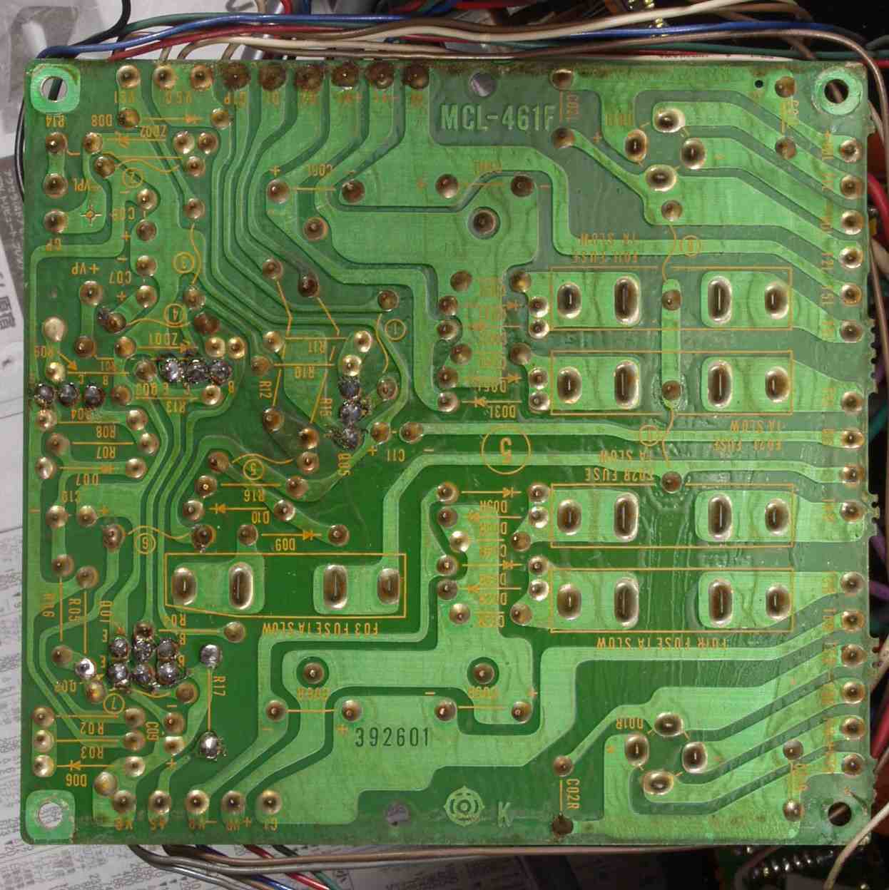 | C5E. 修理(半田補正)後 修理後 入力RCA端子基盤裏、洗浄後 |