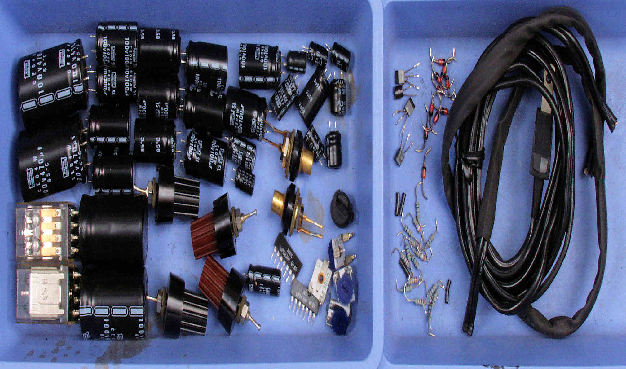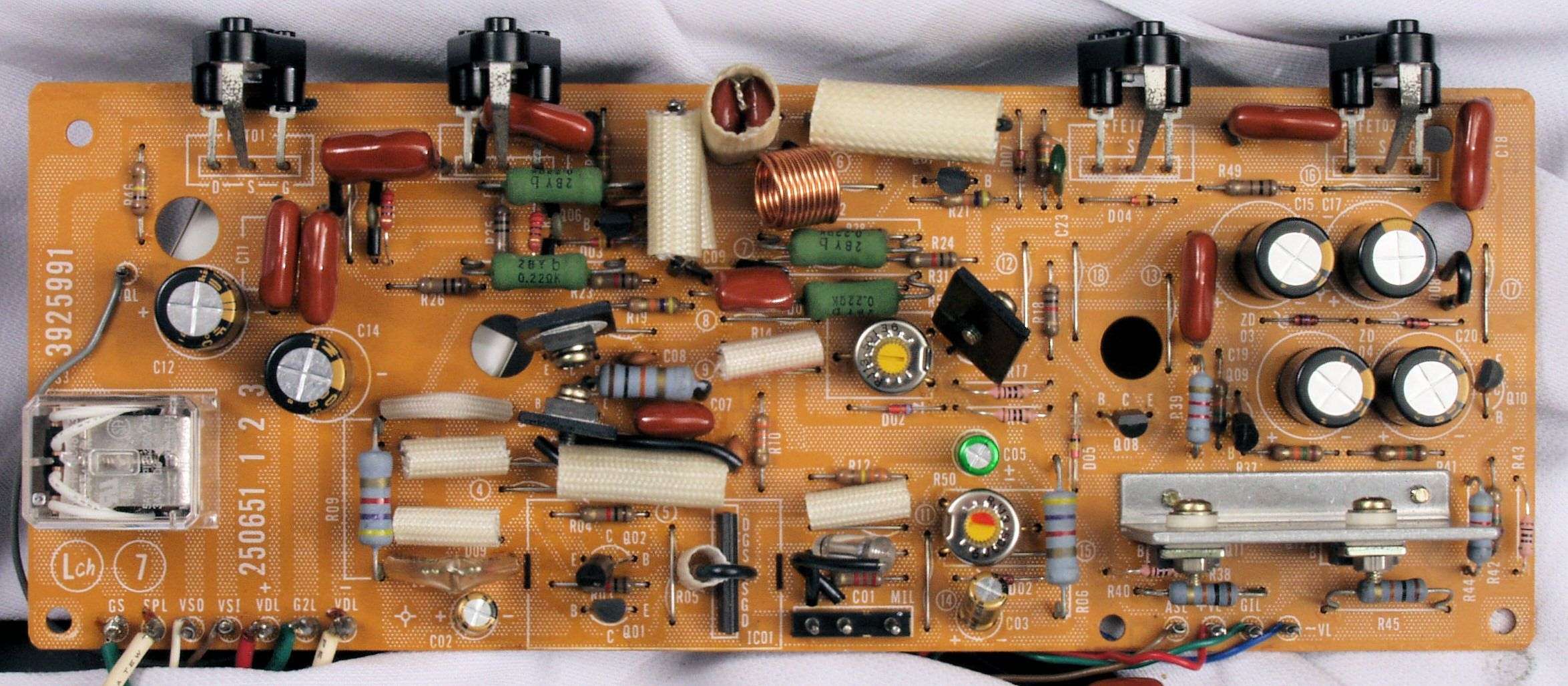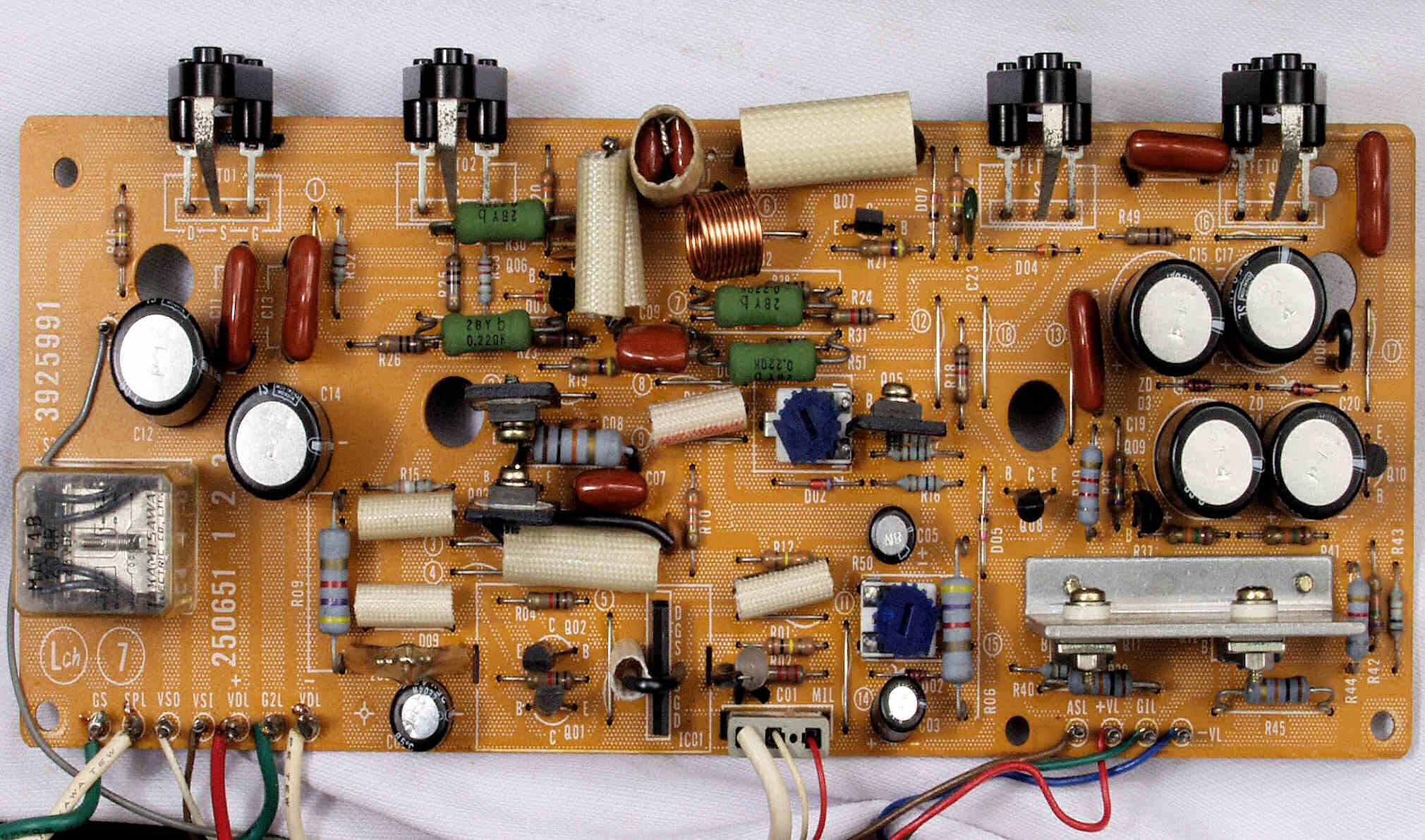 | C22. 修理後 L側ドライブ基板 初段FET(電界効果トランジスター)、バランス/バイアス調整用半固定VR3個、SP接続リレー交換 フューズ入り抵抗全部、電解コンデンサー11個、TR(トランジスター)2個交換 |