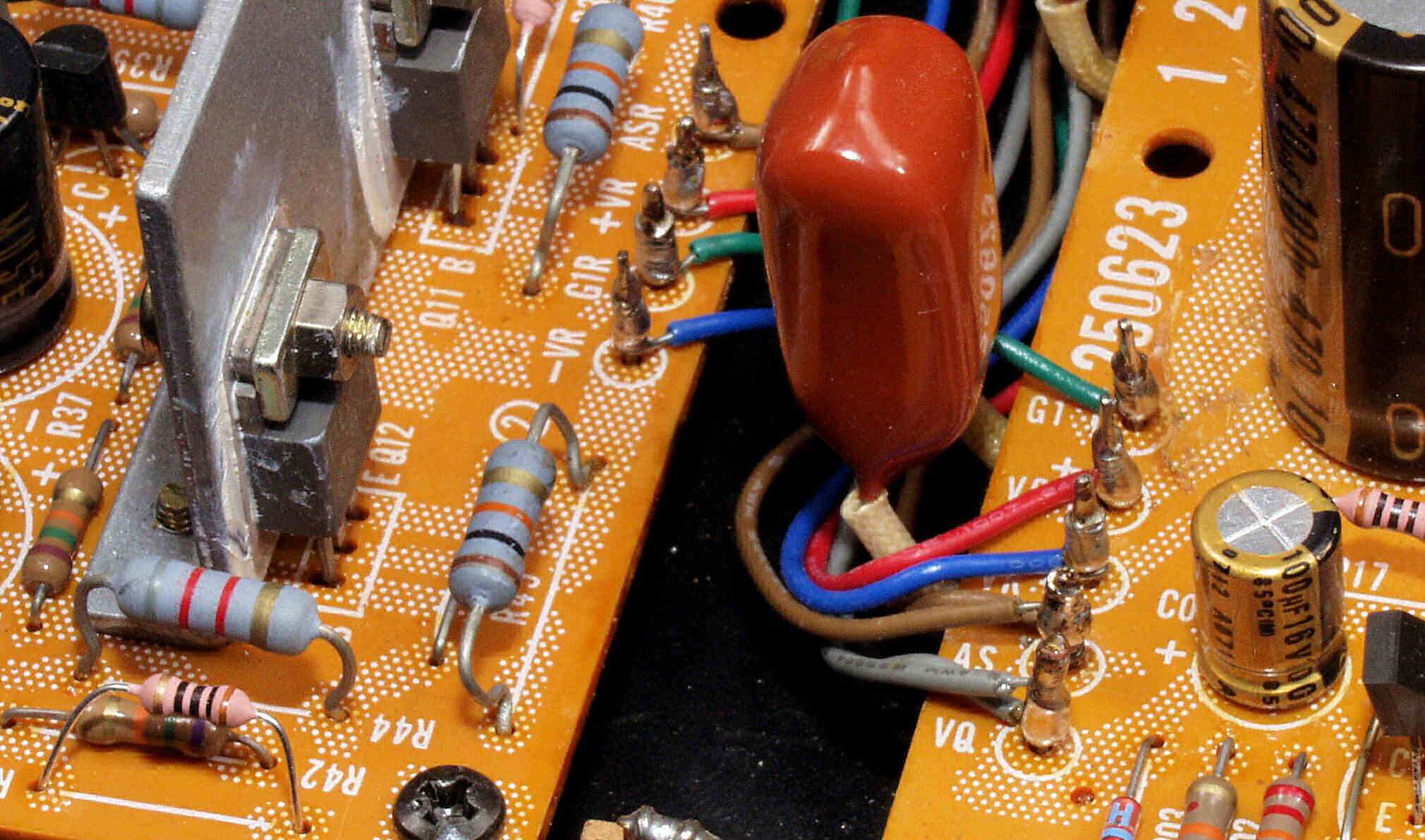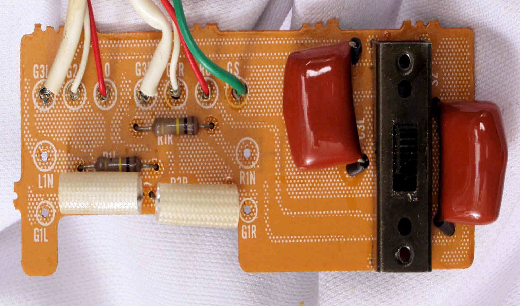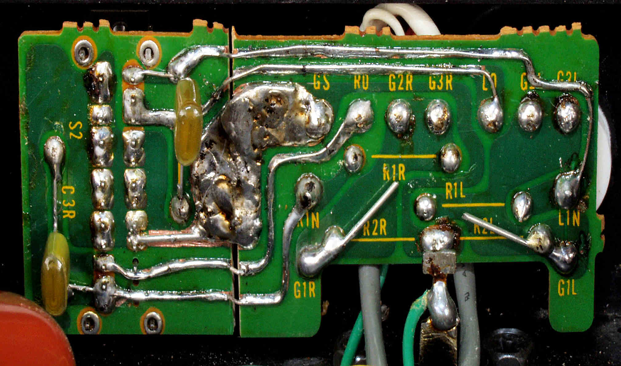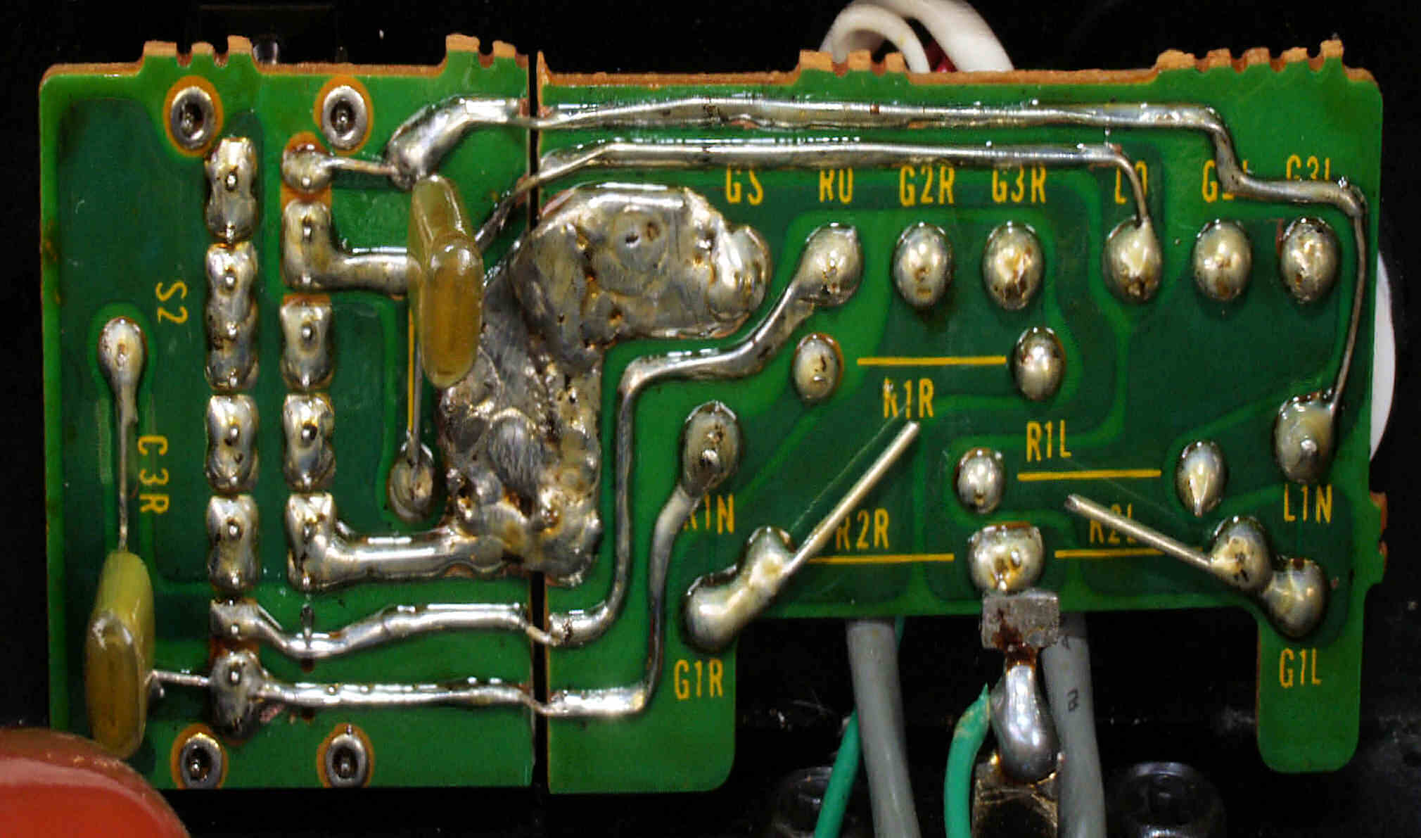 | C67. 修理(半田補正)後 RCA端子基板裏 半田を全部やり直す フイルムコンデンサー2個交換、2個増設 |