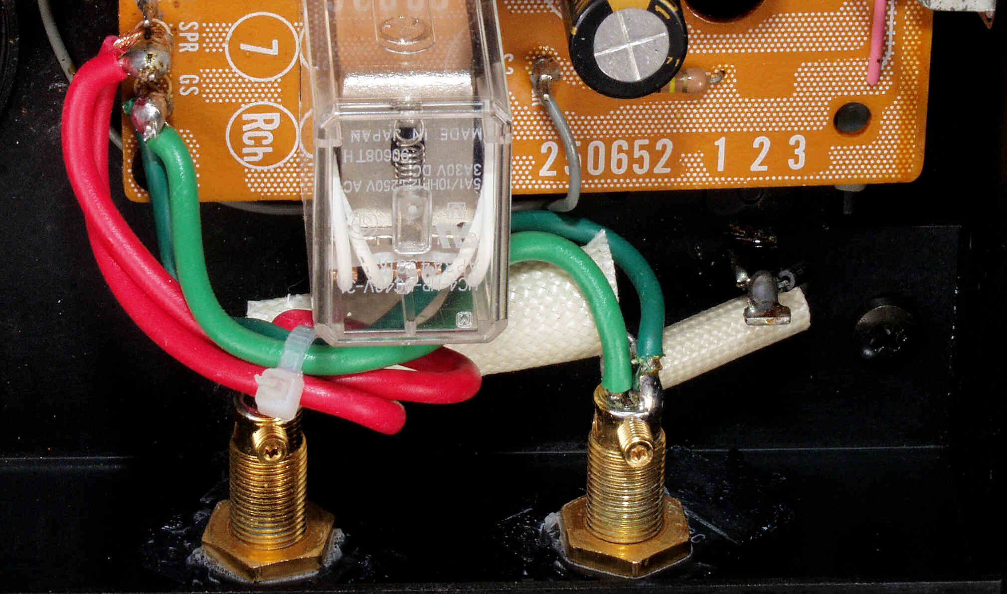 | C85. 修理後 R−SP端子への接続 WBTのネジ止めを生かし、ネジ止め接続+半田接続のW配線にした 理由はこちら参照 |