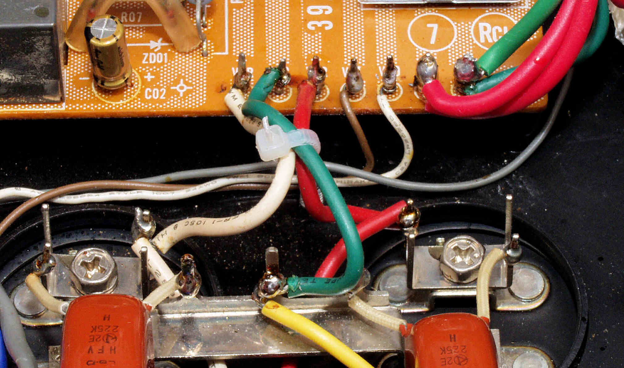 | A51. 点検中 R側ドライブ基板−電源基板への配線バインドはそのまま。過去に修理履歴が無いの証。 |