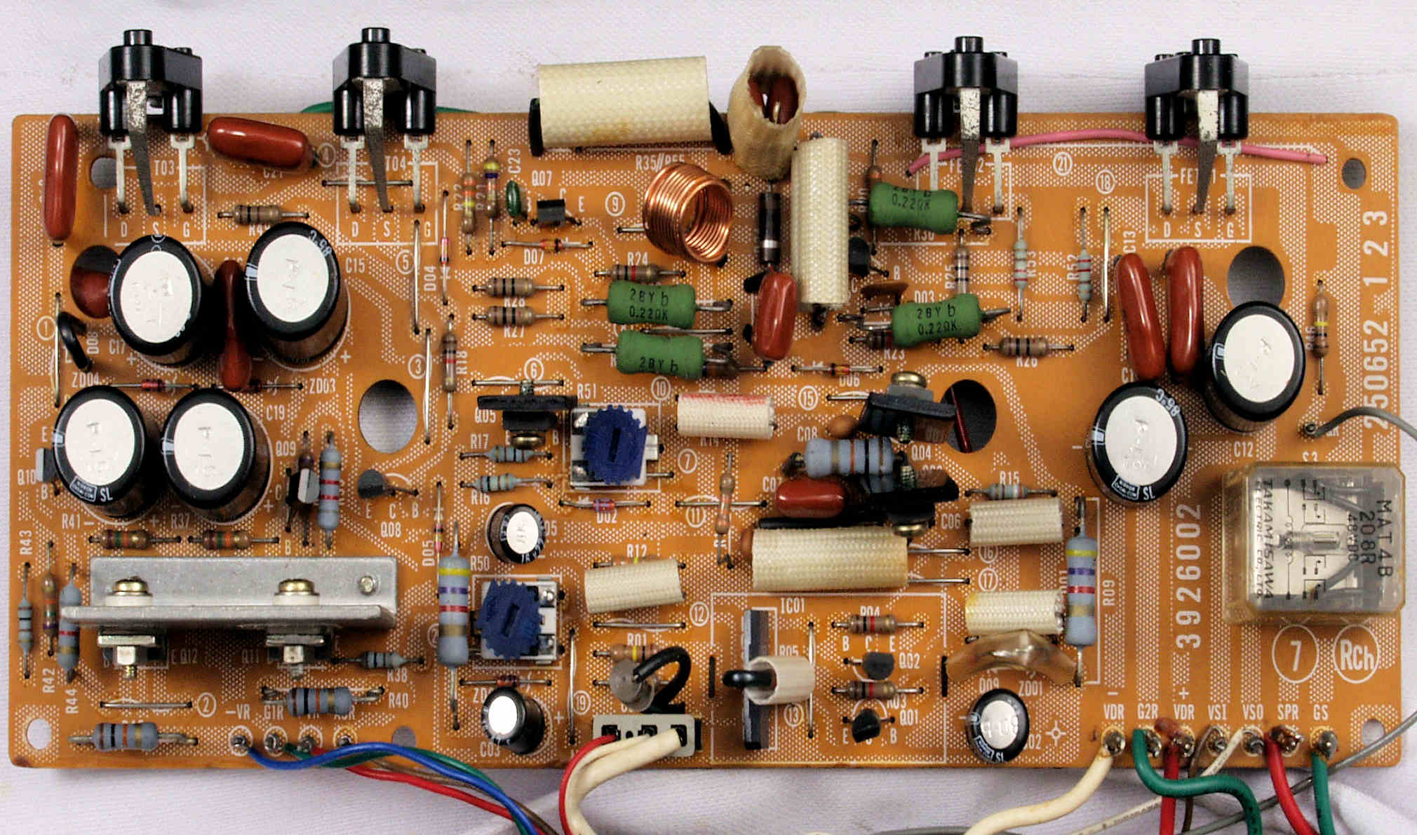 | C52. 修理後 電源基板 フューズ入り抵抗全部、電解コンデンサー9個、整流ダイオード10個交換。 |