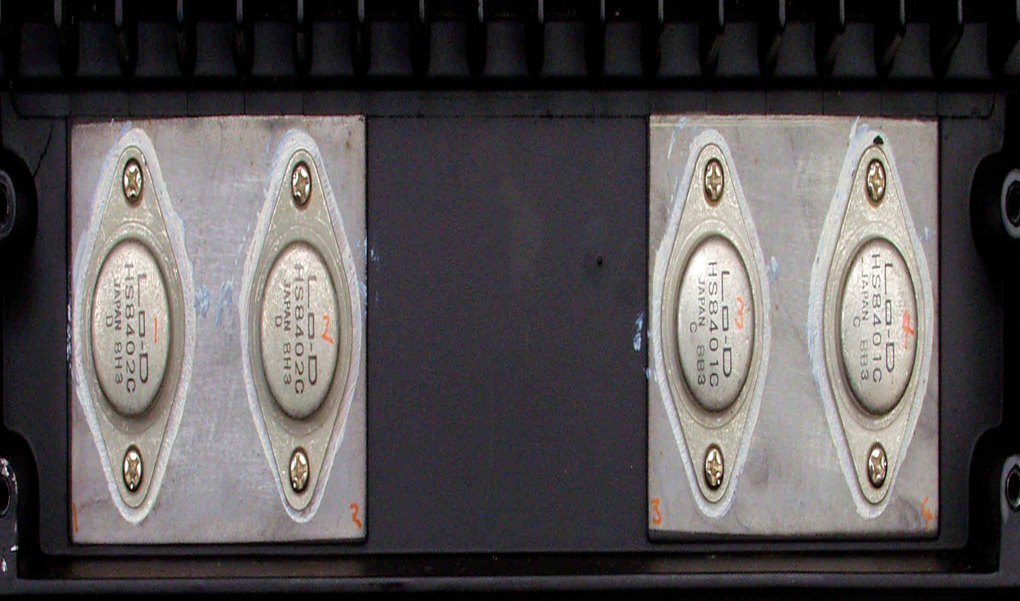 | A62. 点検中 L側終段FET(電界効果トランジスター)の絶縁マイカーの穴は小さい、シリコングリスも湿気有り。 熱伝導の良い「シリコン製絶縁シート」は比誘電率が、シリコーンオイル=2.60〜2.75、雲母=5〜8と、 2倍の開きがあり、高域特性に影響が出るので、現在は未採用。 |