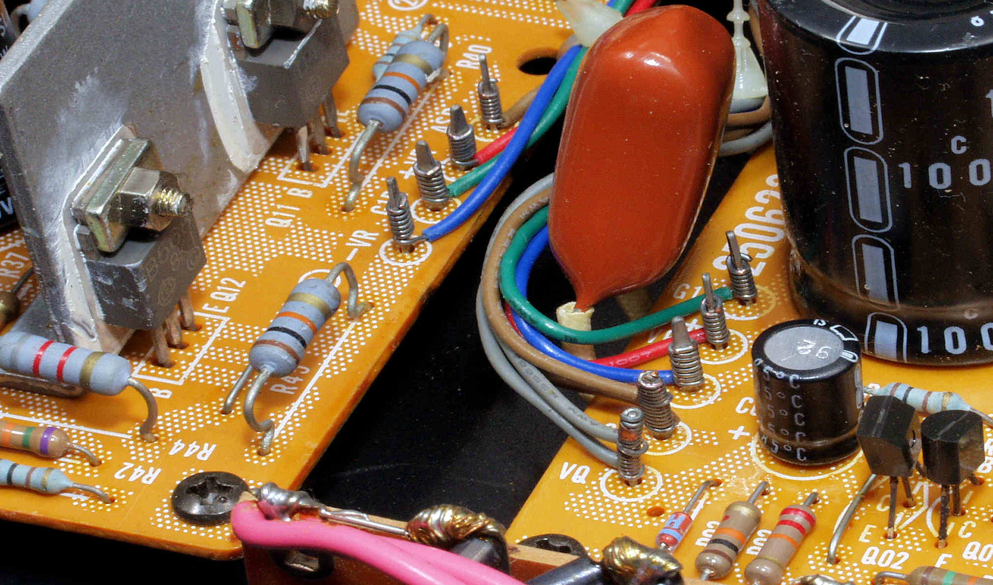 | A31. 点検中 下蓋を取り、下から見る。 右側基板の電解コンデンサーの頭のビニールが少し剥けている。 |