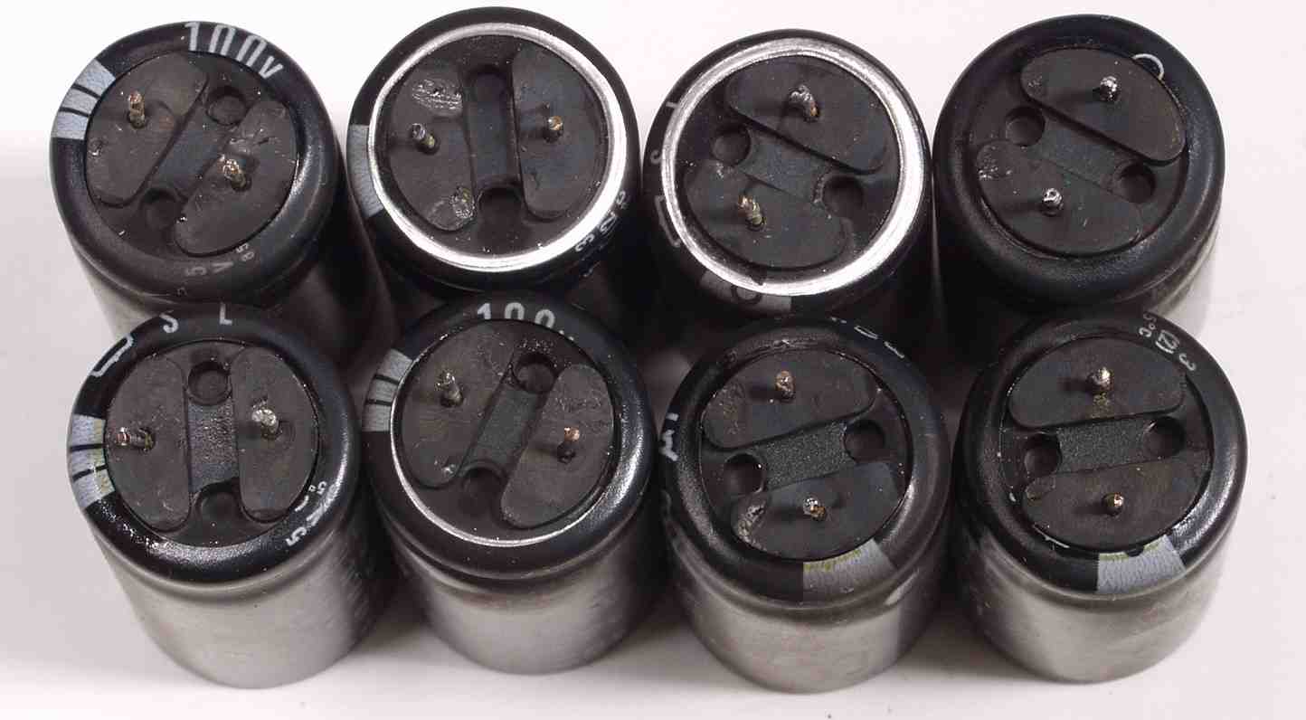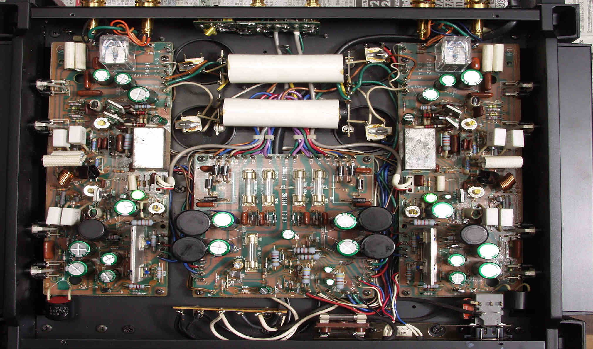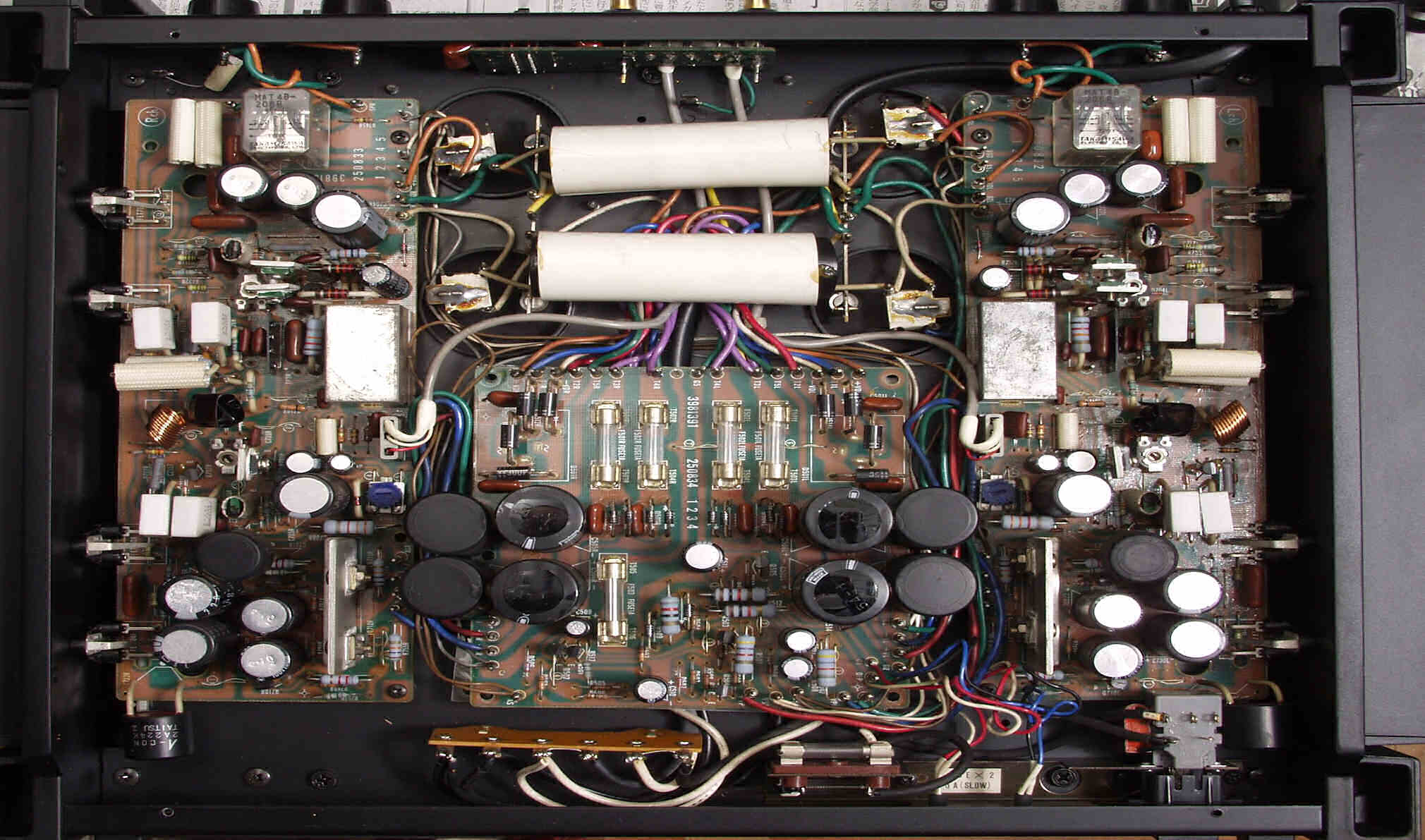 | A. 修理前の状況 A1. 修理前点検中 下から見る、非常に綺麗です AMP部の電解コンデンサーのビニールの後退は左が多い |