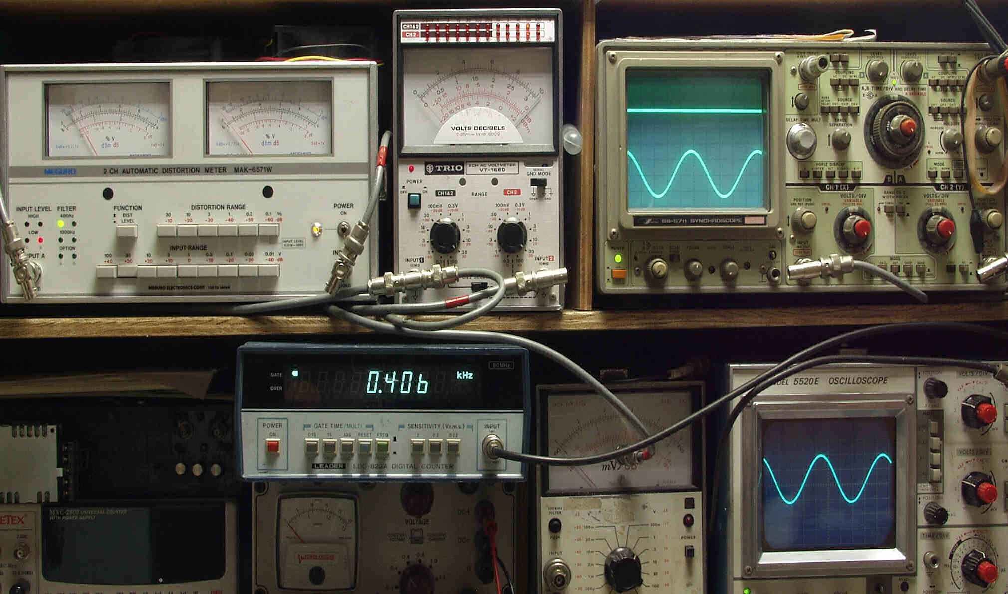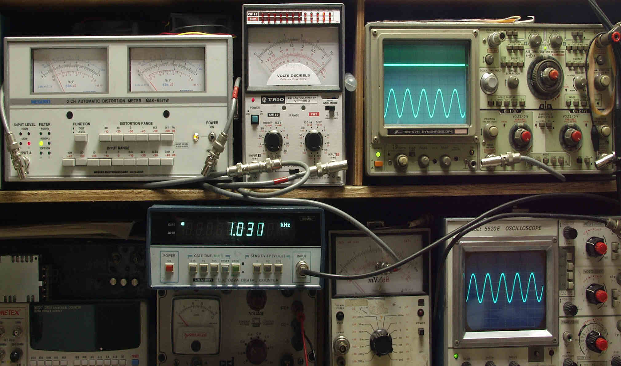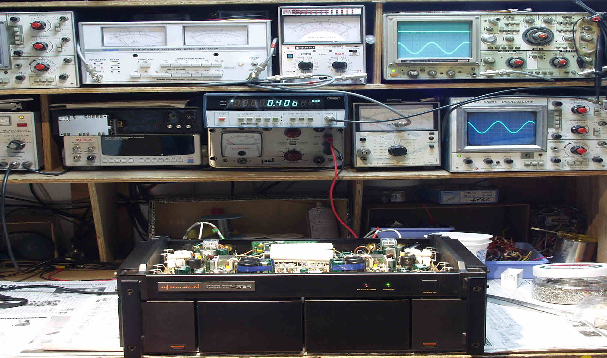 | E. 調整・測定 E1. 出力/歪み率測定・調整 <見方> 下左オーディオ発振器より400HZ・1KHZの信号を出す(歪み率=約0.003%) 下中=入力波形(オーディオ発振器のTTLレベル) 下右=周波数計 上左=SP出力の歪み率測定 左メータ=L出力、右メータ=R出力 上中=SP出力電圧測定器、赤針=R出力、黒針=L出力 上右=SP出力波形オシロ 上=R出力、下=L出力(出力電圧測定器の出力) |