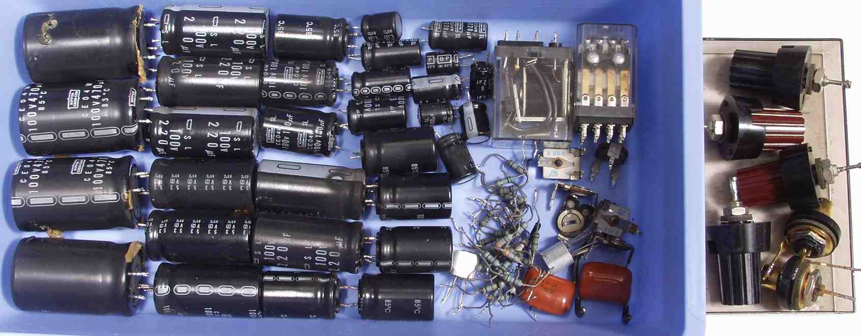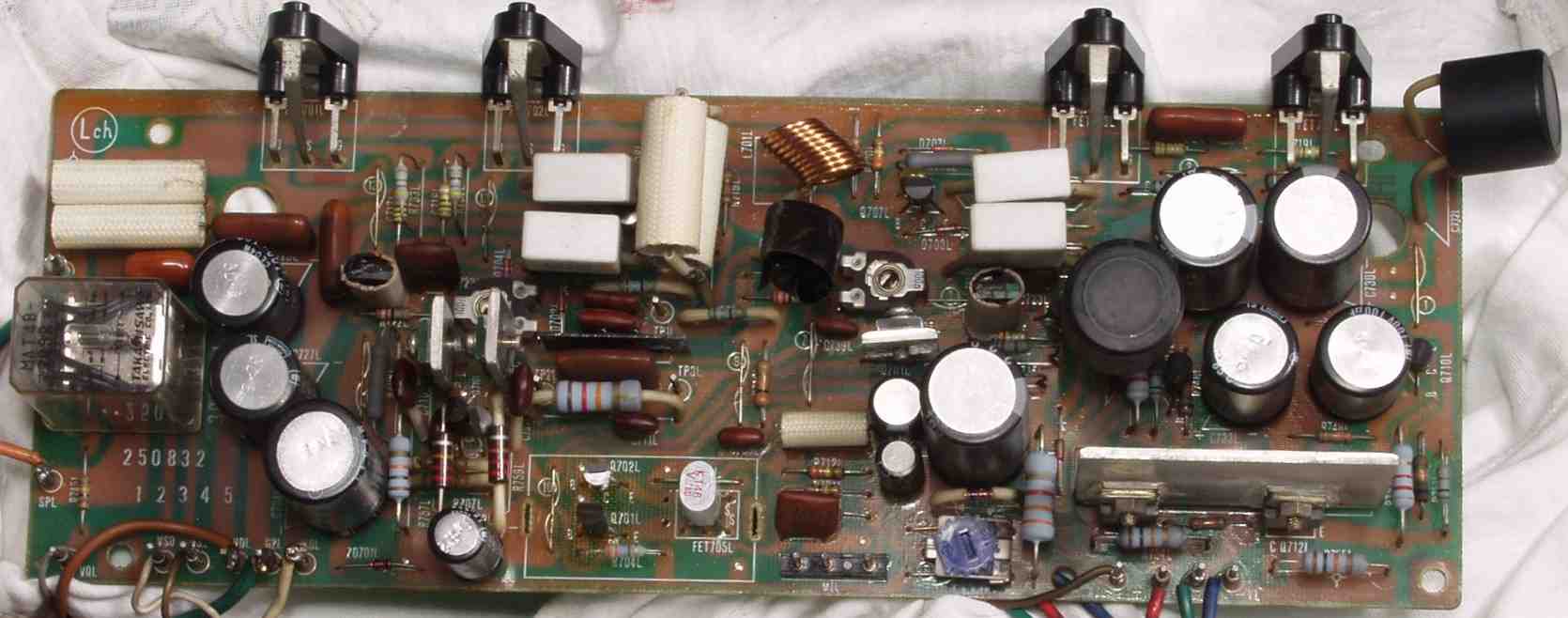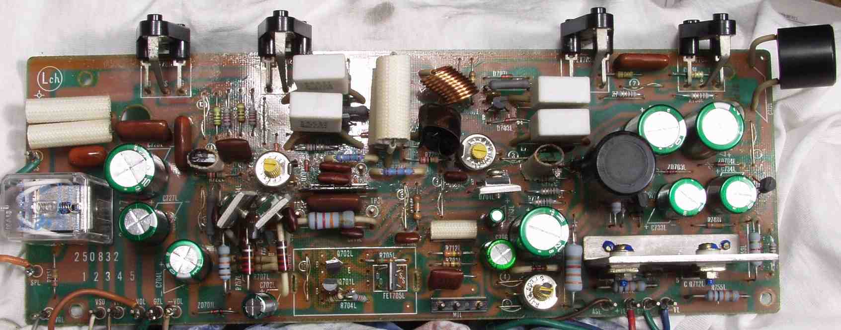 | C2B. 修理後 Lドライブ基板 初段FET、バランス/バイアス調整用半固定VR3個、SP接続リレー交換 フューズ入り抵抗全部、電解コンデンサー11個交換 モジュール点検 |