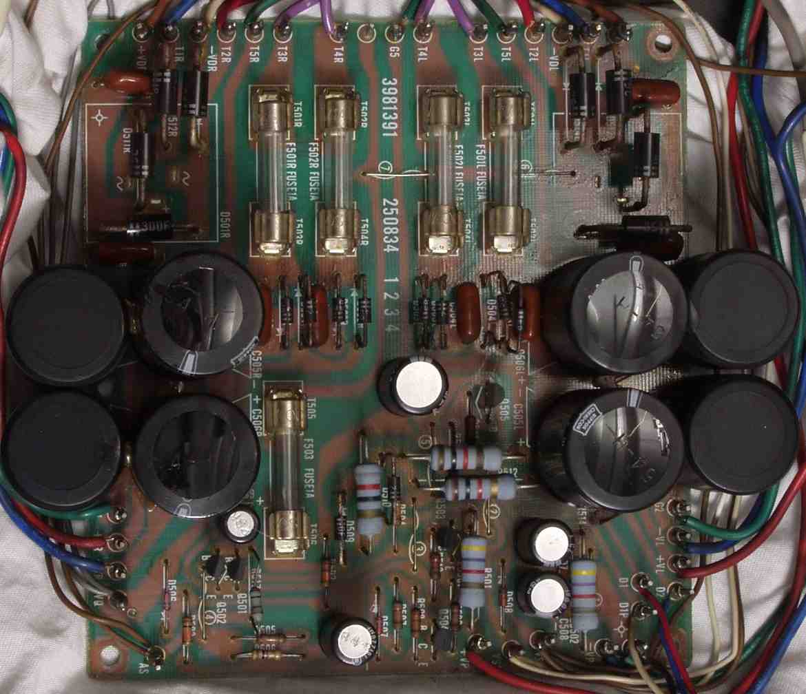 | C3B. 修理後 電源基盤 フュ−ズ入り抵抗全部、電解コンデンサー9個交換 ジャンパー線も半田を浸み込ませる |