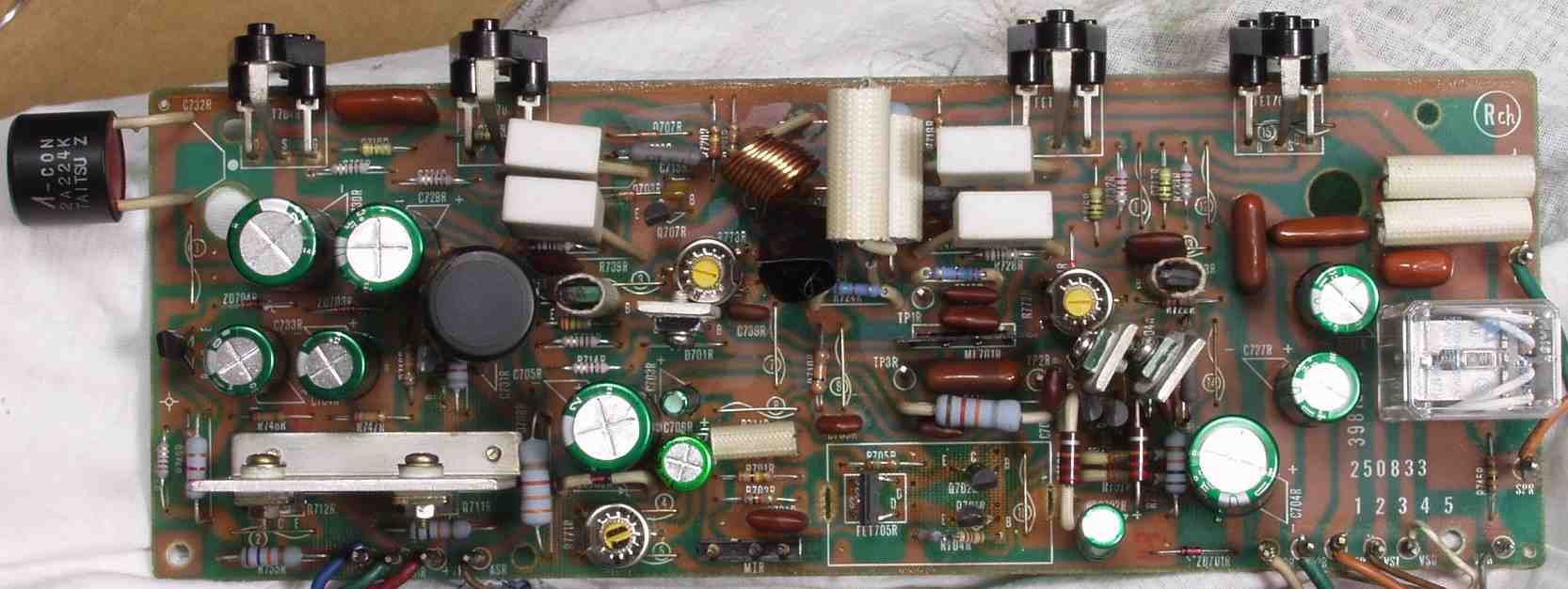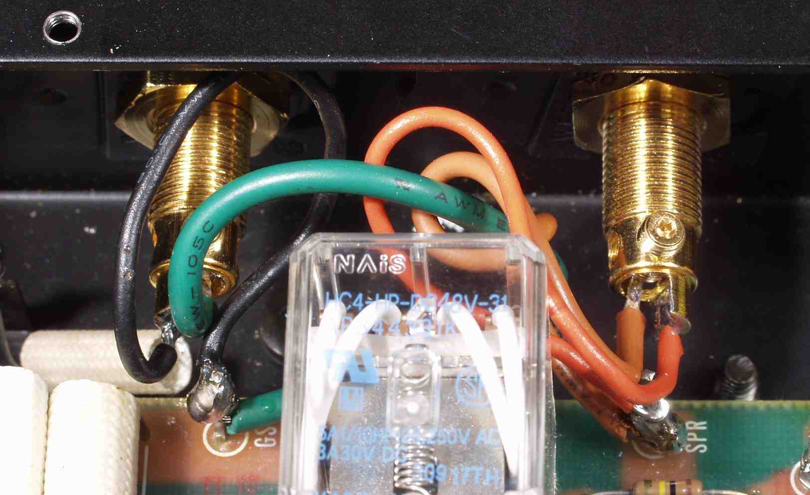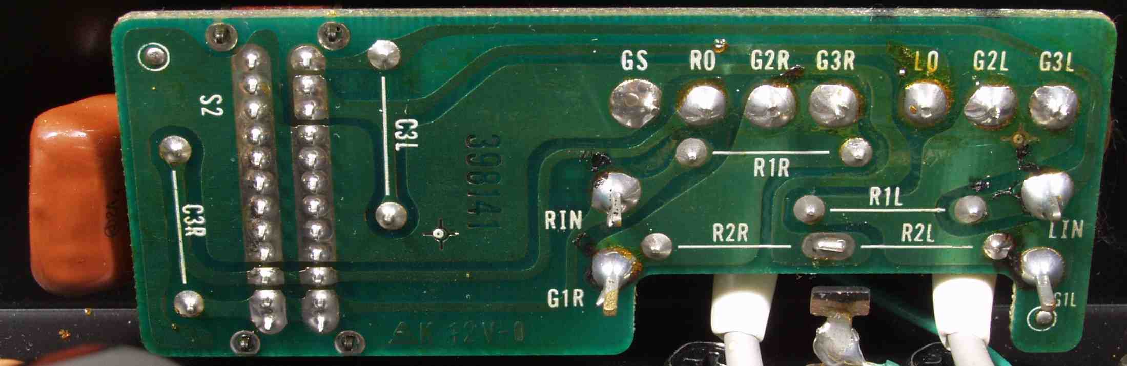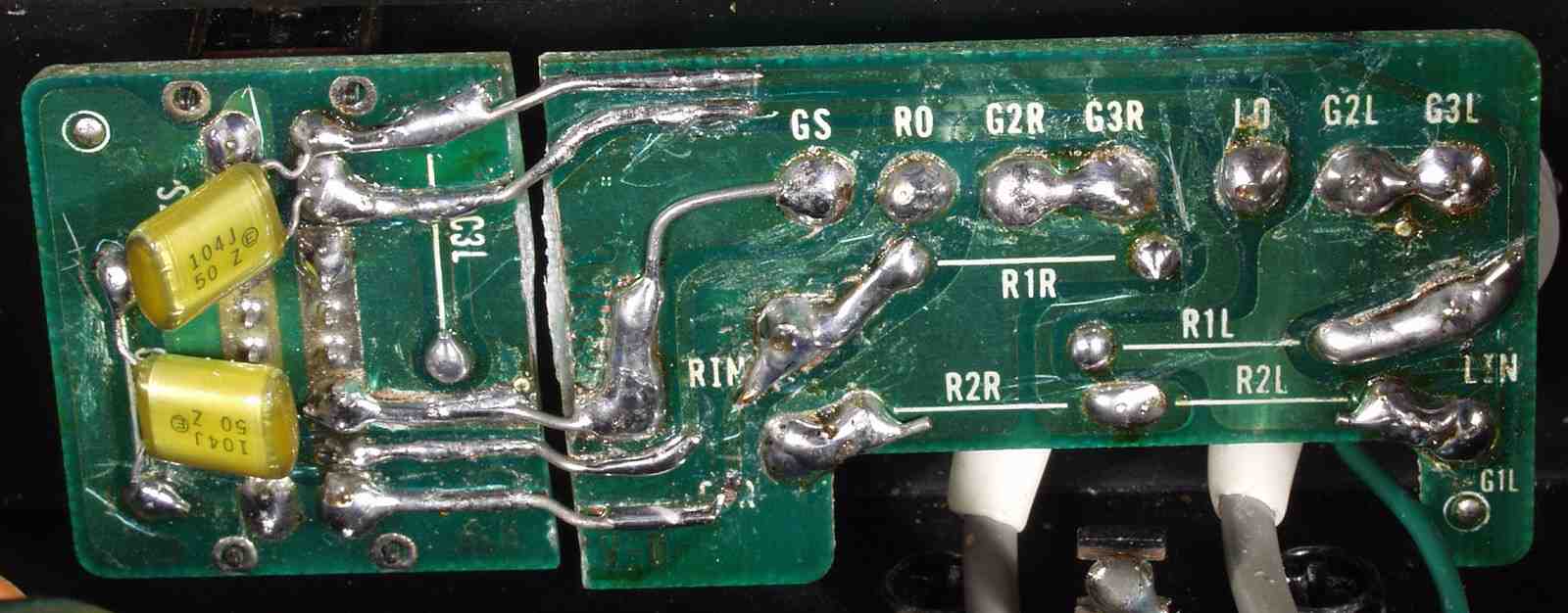 | C5D. 修理(半田補正)後 RCA端子 裏 半田を全部やり直す フイルムコンデンサー2個交換、2個増設 |