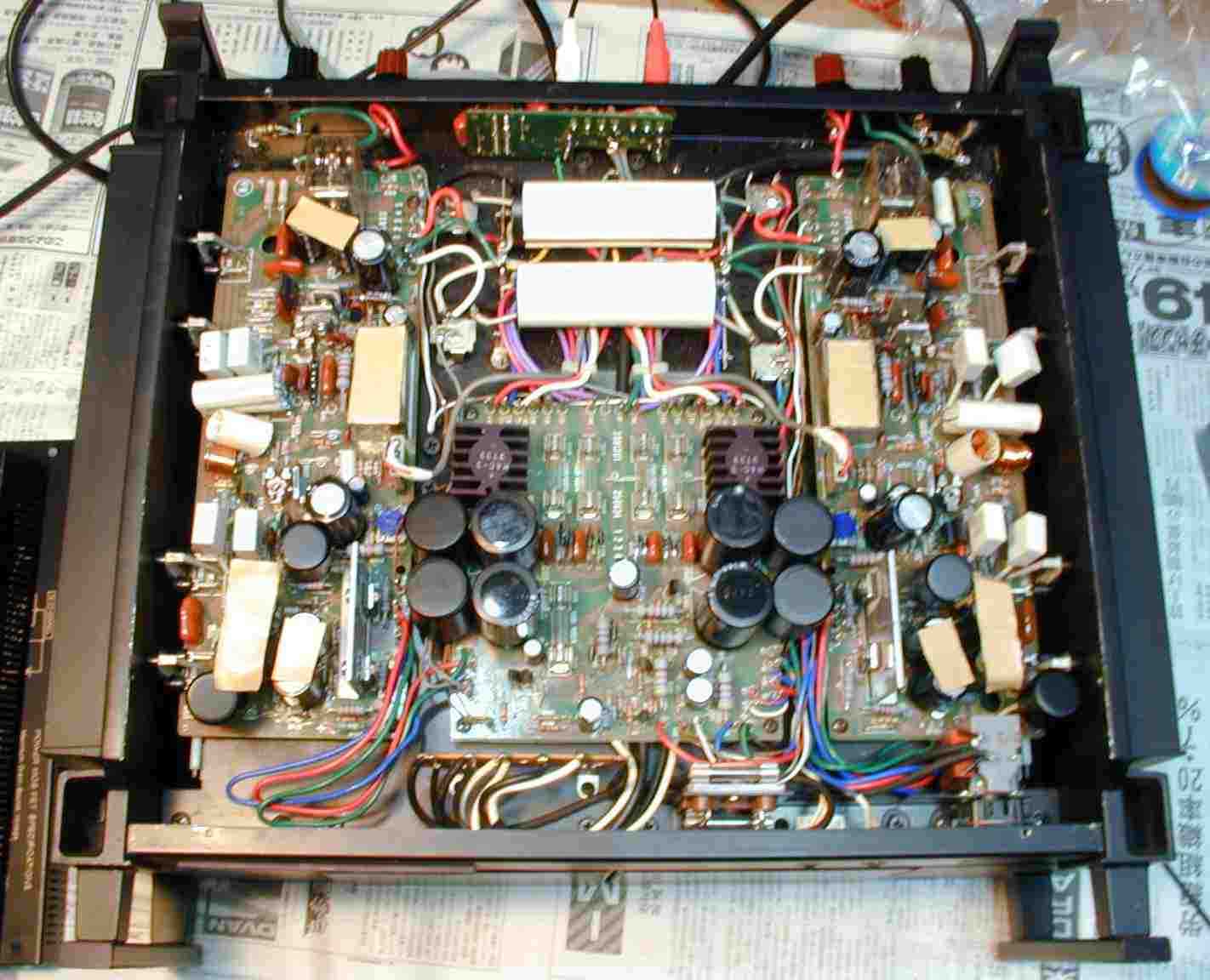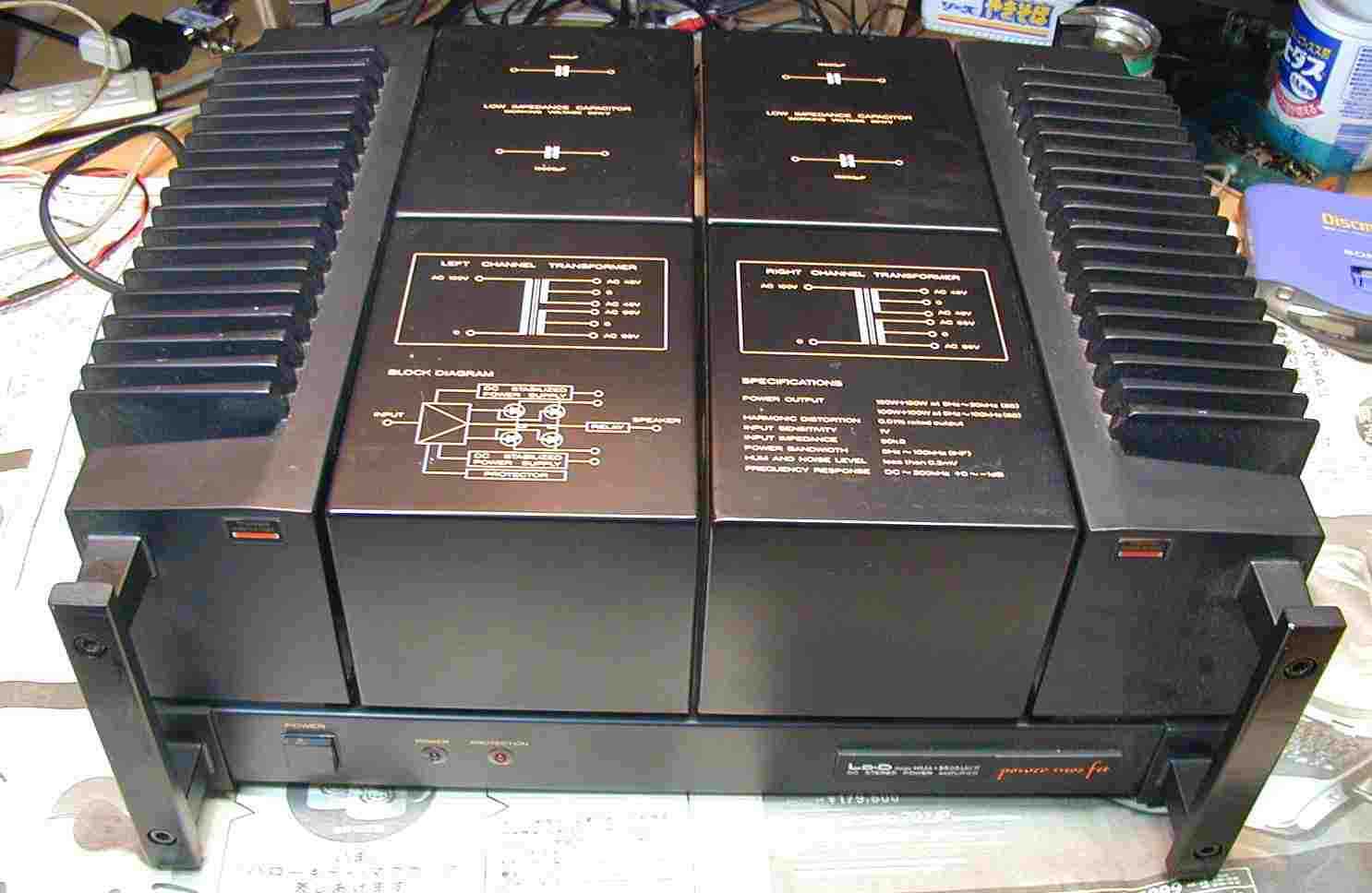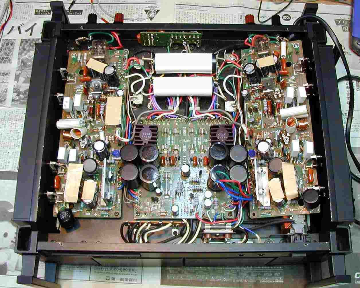 | A. 修理前の状況 左側の放熱器の異常発熱に気がつき、さらに大音量時に歪む。 メーカーに修理の問い合わせをしたのですが、部品がないとのことで断られました。 そこでインターネットで回路図を手に入れ、自分で直すことにしました。 回路図を見ながら抵抗値等を確認していたところ、回路をショートさせてしまったのです。 電源が入りません。 B.原因 短絡(ショート)による基板剥離、抵抗焼損、TR(トランジスター)破損。 C. 修理状況 RL AMPのTR(トランジスター)交換 RL ICモジュール、修理・製作 プリント基板補修 配線手直し、補強 D.使用部品 終段FET(電界効果トランジスター) 持参20個の中から選別して、使用 TR(トランジスター) 20個 電解コンデンサー 12個 抵抗 10個 E. 修理費 45,000円 「通常修理」 終段FET(電界効果トランジスター)は別途支給。 S. HITACHI Lo−D HMA−9500mkU の仕様(マニアルより) |