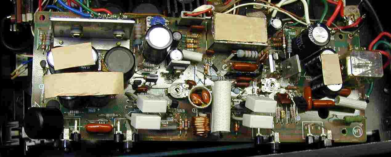 | 寸評 このAMPは今回の修理依頼者の、前持ち主が、かなり修理している=いじくり回している。 抵抗、TR(トランジスター)、コンデンサーを、何回も、何回も取り外した様です 取り外しが下手な為、基板の銅箔の剥離多数発生しています。 終段FET何回も焼損したらしく、フューズ入り抵抗は、殆ど、普通の抵抗に、取り替えられていた。 よって、使用には、このAMPの下には、燃える物を置かない等、注意が必要です。 修理方法もいい加減で、その時、既にモジュールは壊されており、 自分でバイアスの抵抗を強引に替えて、辛うじて「B級動作」させていました。 |