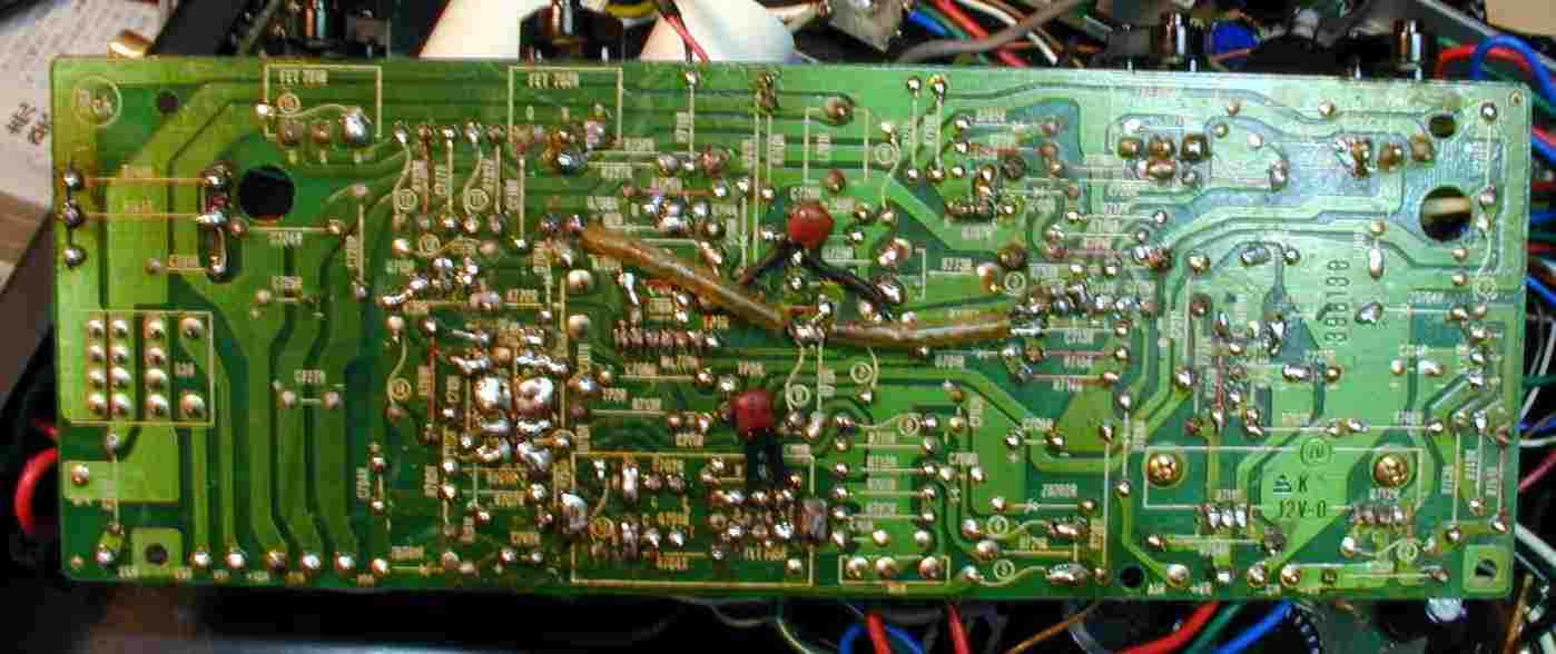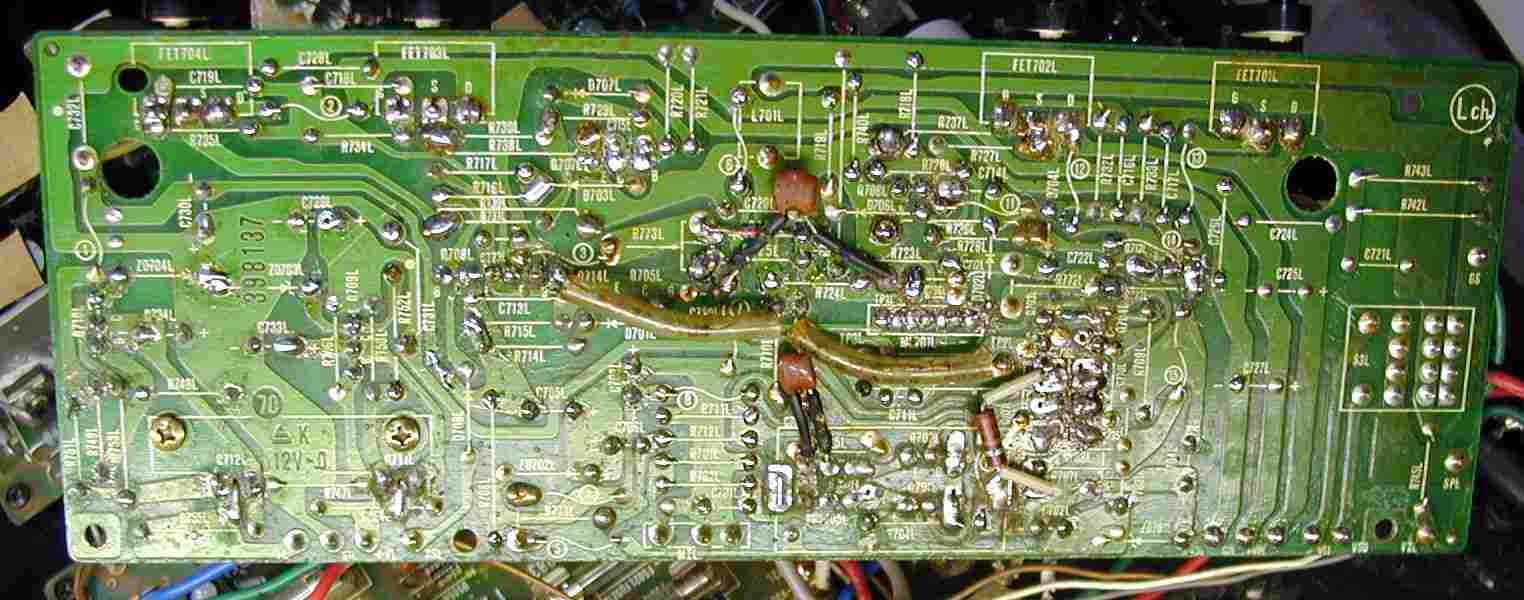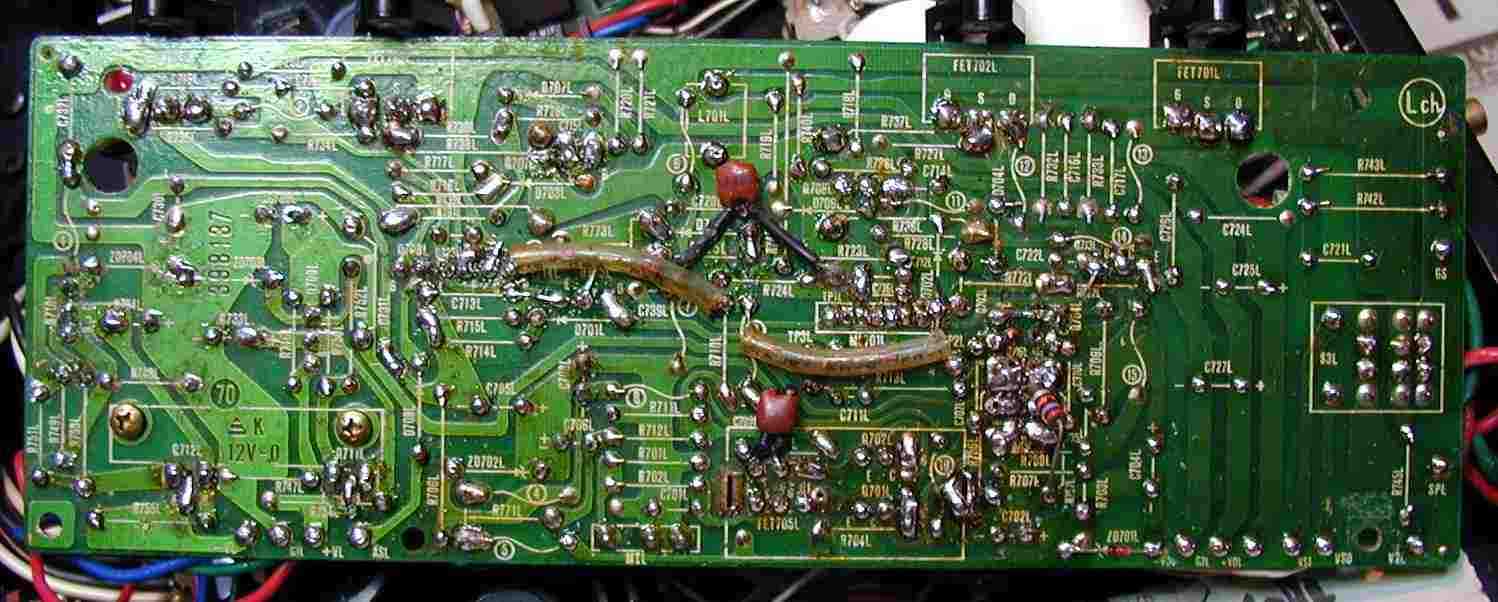 | 4. L側、ドライブ基板裏、何回も部品を取り替えたらしく、銅箔がかなりの数、剥離している。 部品を取るには、半田吸い取り器、又は、ハンダ吸い取り線を使用すること。 |