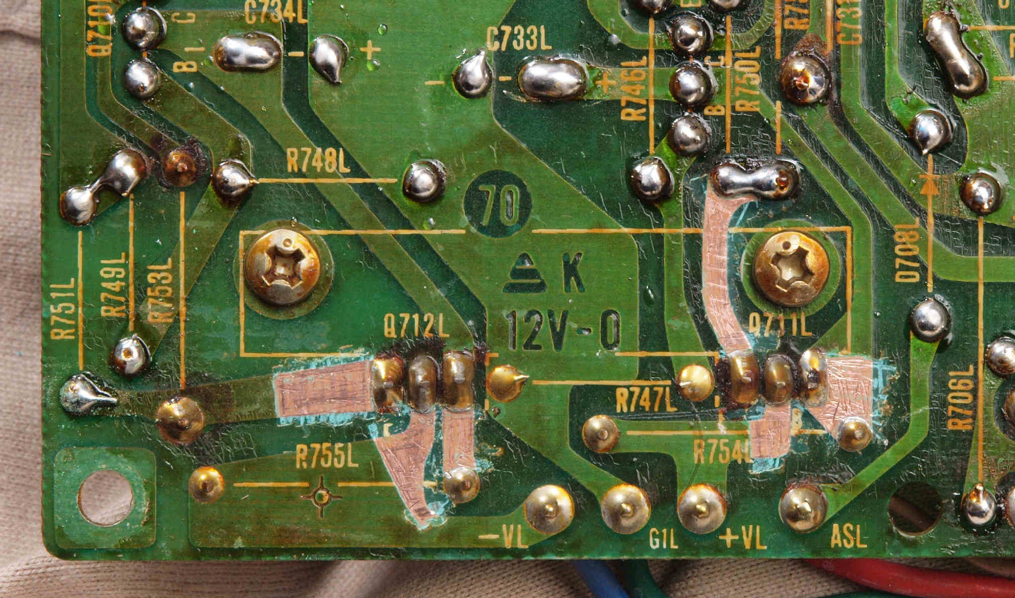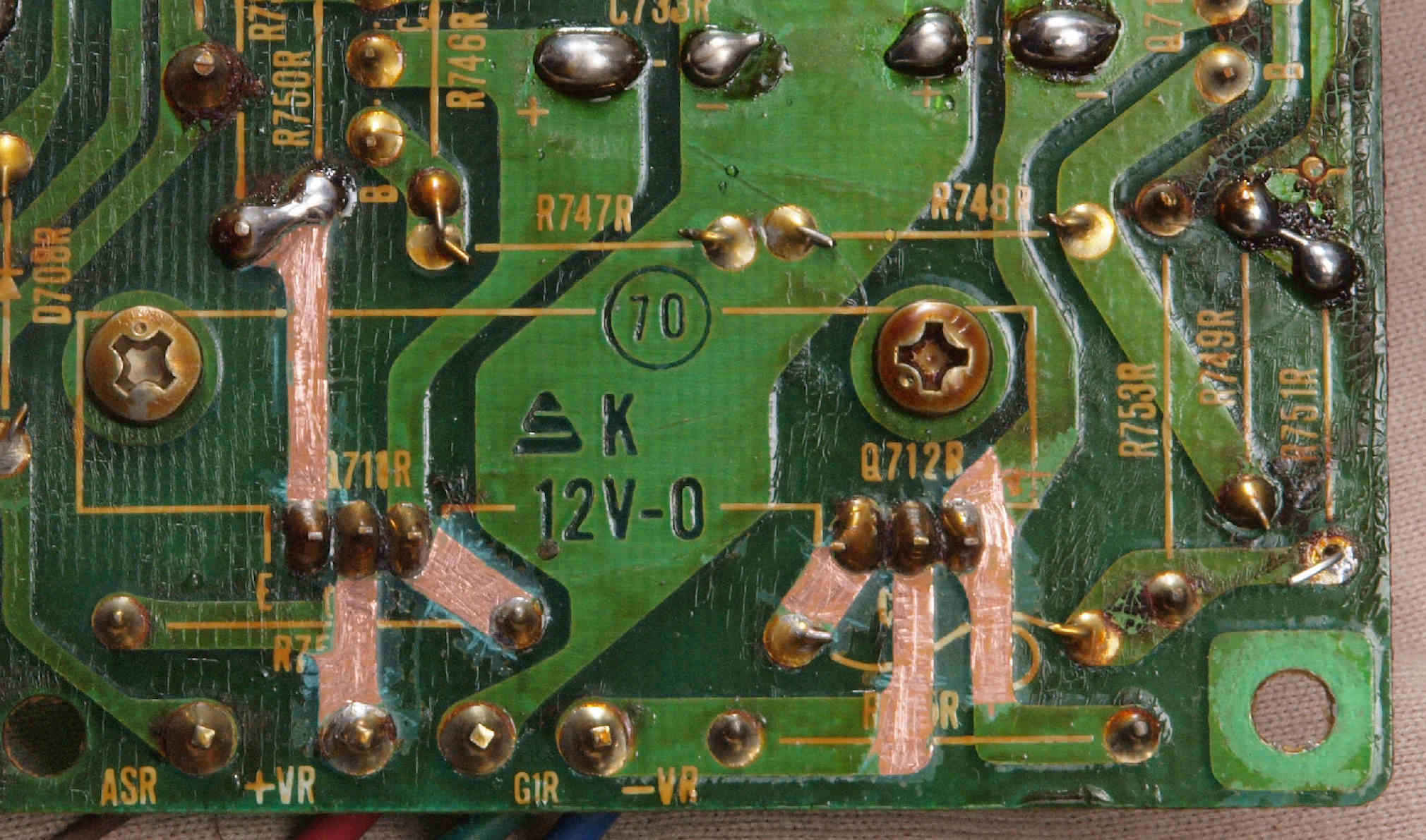 C14. 修理中 R側ドライブ基板裏 定電圧TR(トランジスター)の足の銅箔を広げる。