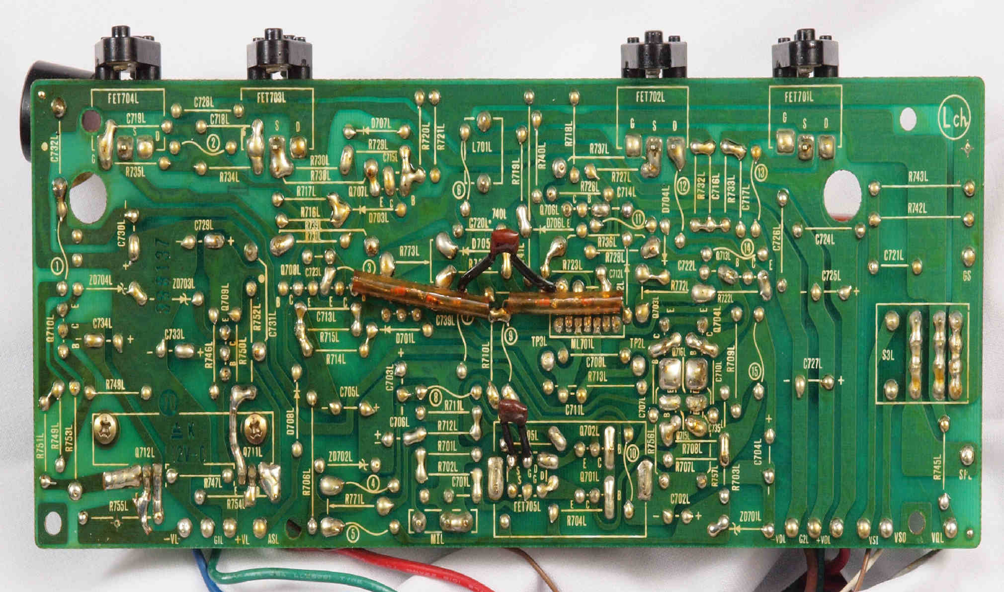 C22. 修理後 L側ドライブ基板 初段FET、バランス/バイアス調整用半固定VR3個、SP接続リレー交換