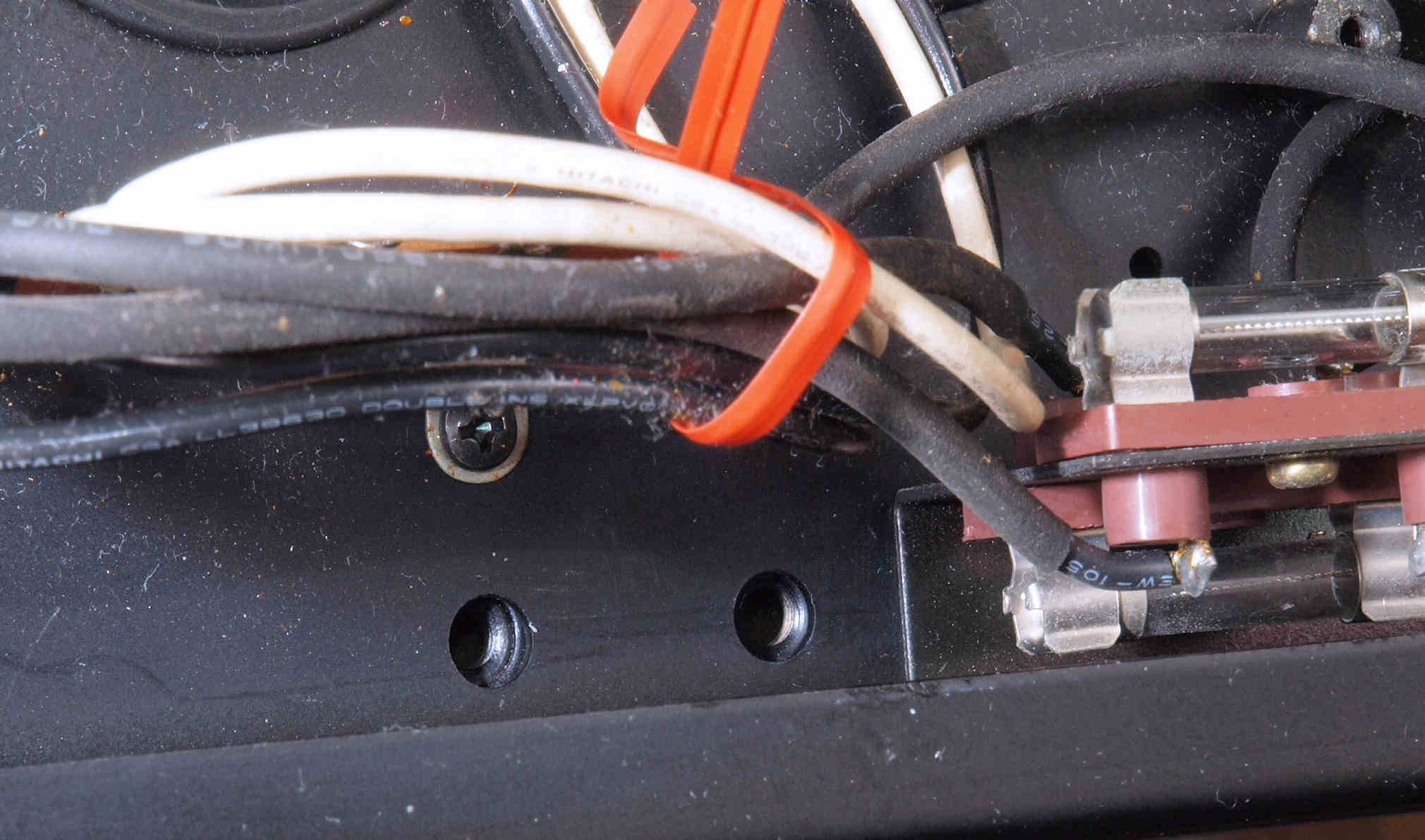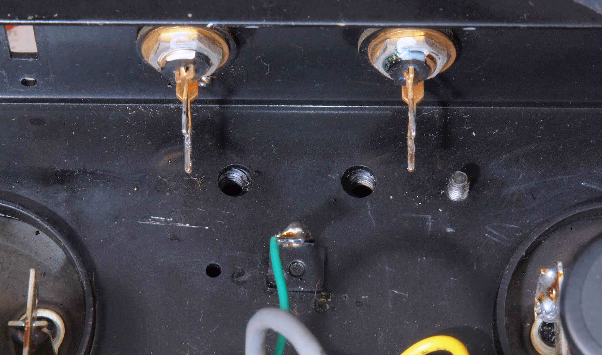 | A. 修理前の状況 A11. 点検中 電解コンデンサー・カバー取り付けビス(後)が無い! シャシがキズ付いていないのと、ネジ山の塗装が取れて以内ので、製造時から? |