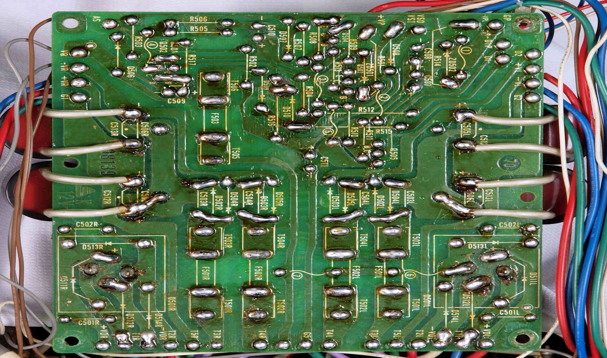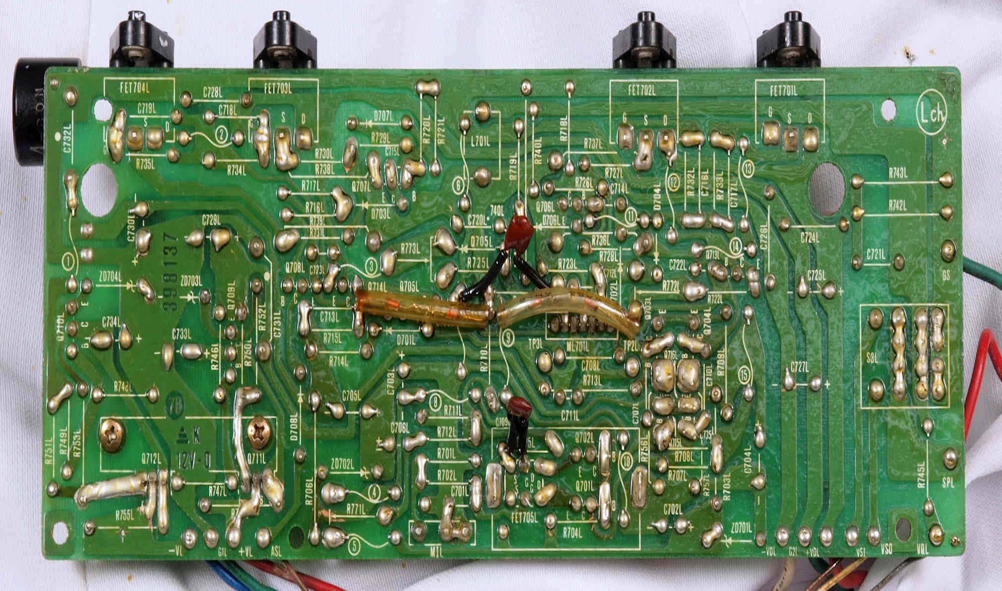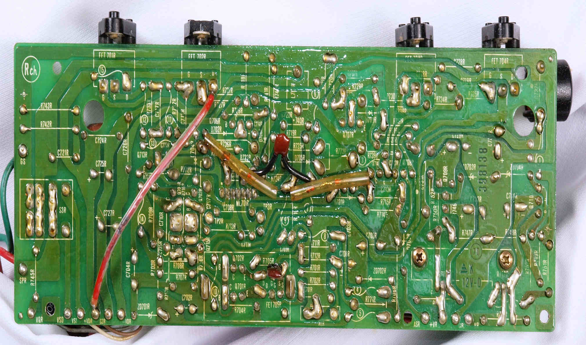| C67. 修理(半田補正)後 RCA端子基板裏 半田を全部やり直す フイルムコンデンサー2個交換+2個増設 |