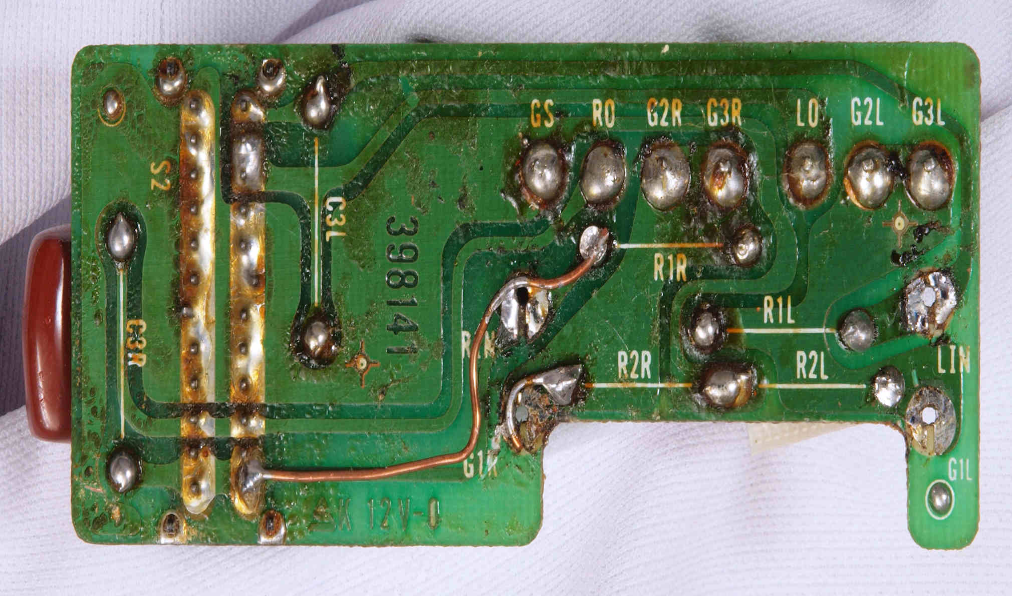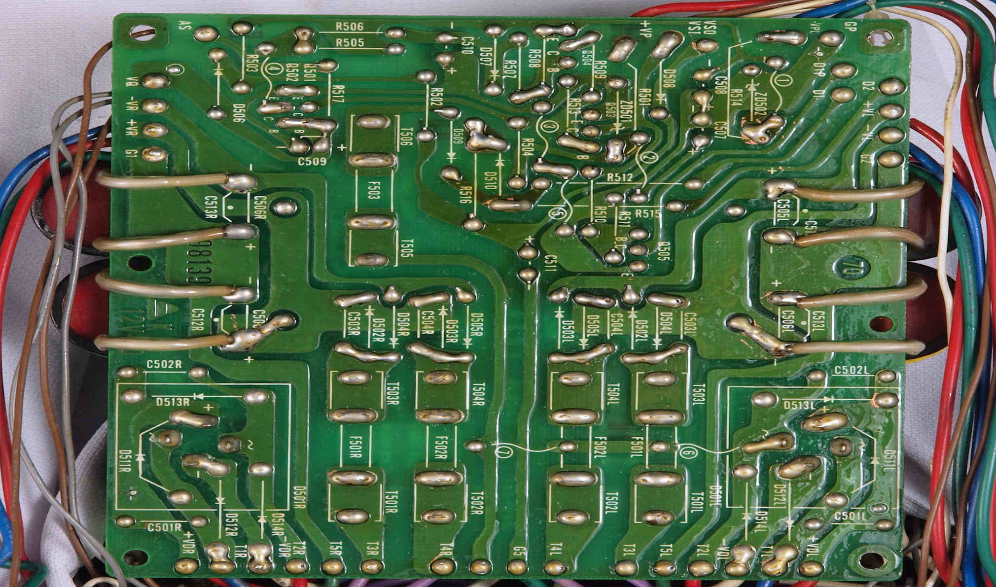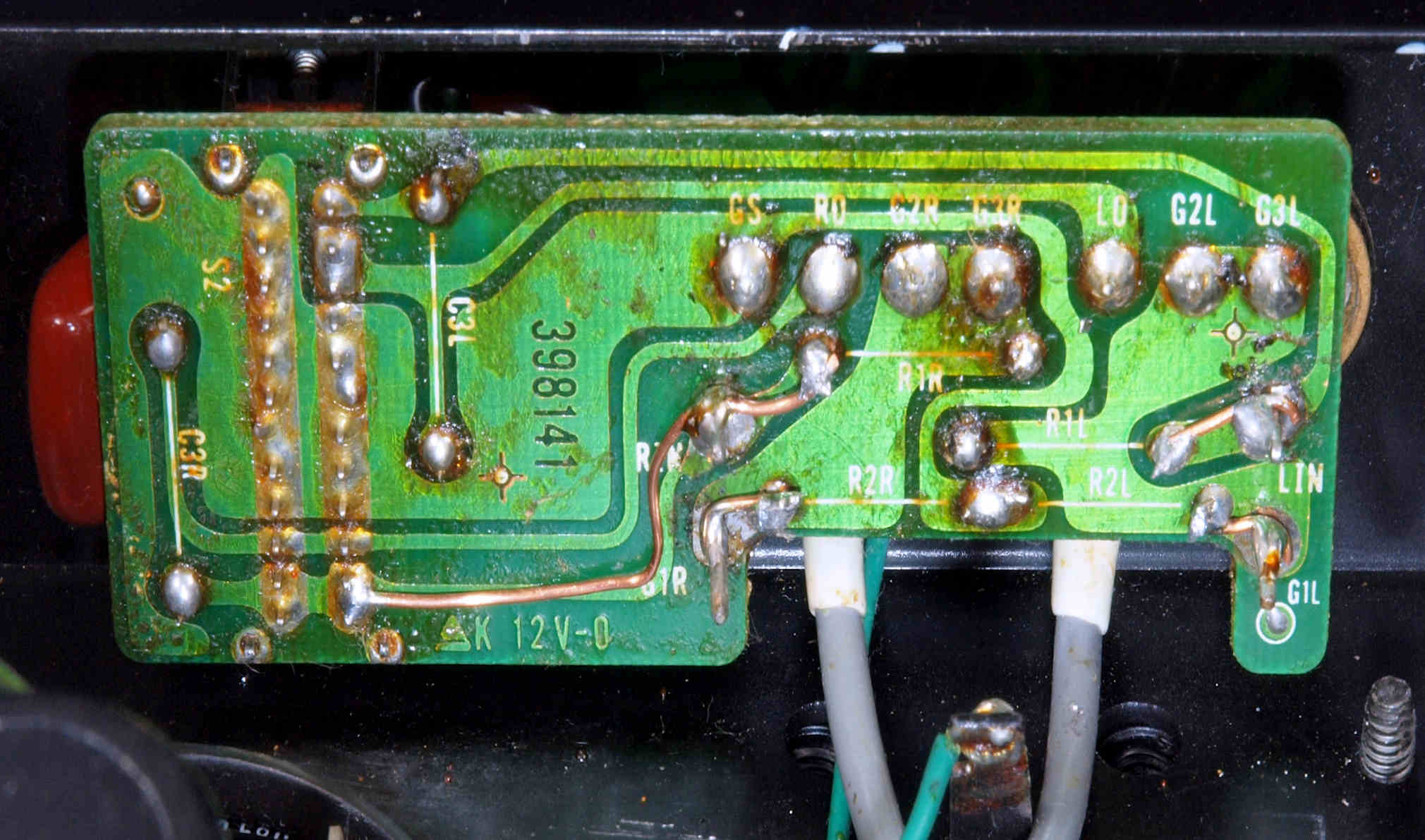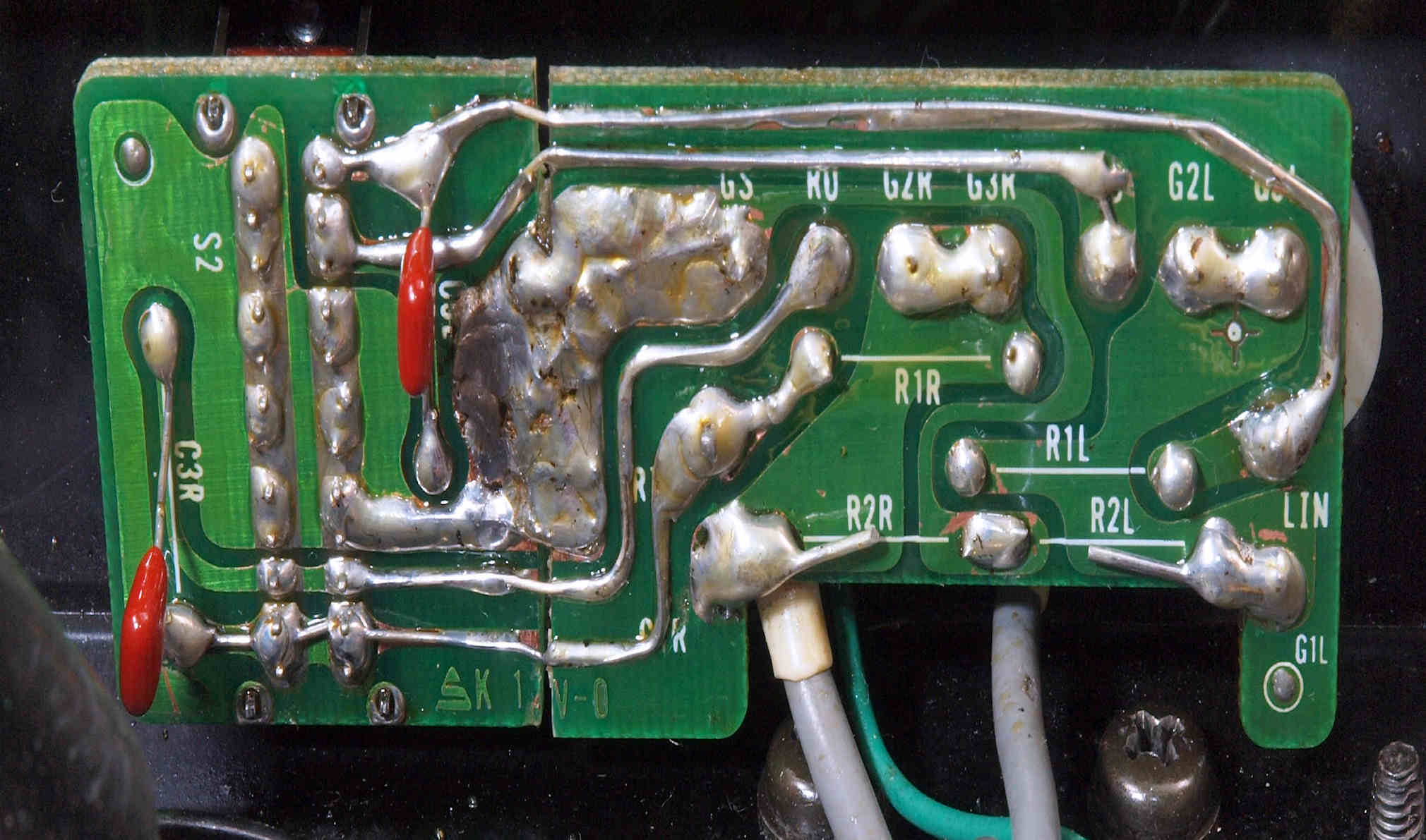| C67. 修理(半田補正)後 RCA端子基板裏 半田を全部やり直す フイルムコンデンサー2個交換+2個増設 |