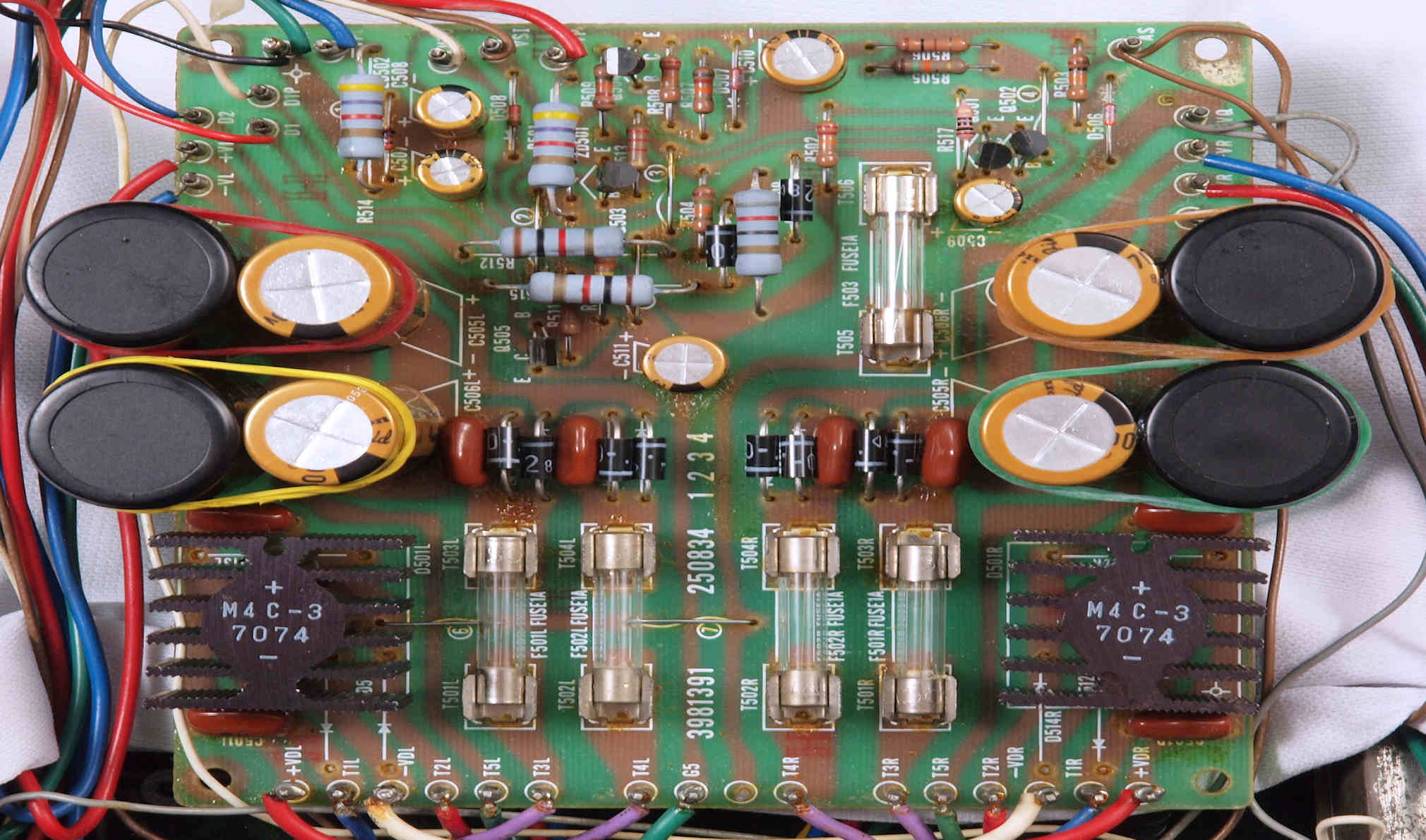 | C54. 修理後 電源基板 フューズ入り抵抗全部、電解コンデンサー9個、 整流ダイオード10個交換。 輪ゴムは接着材が硬化するまで固定する。 |