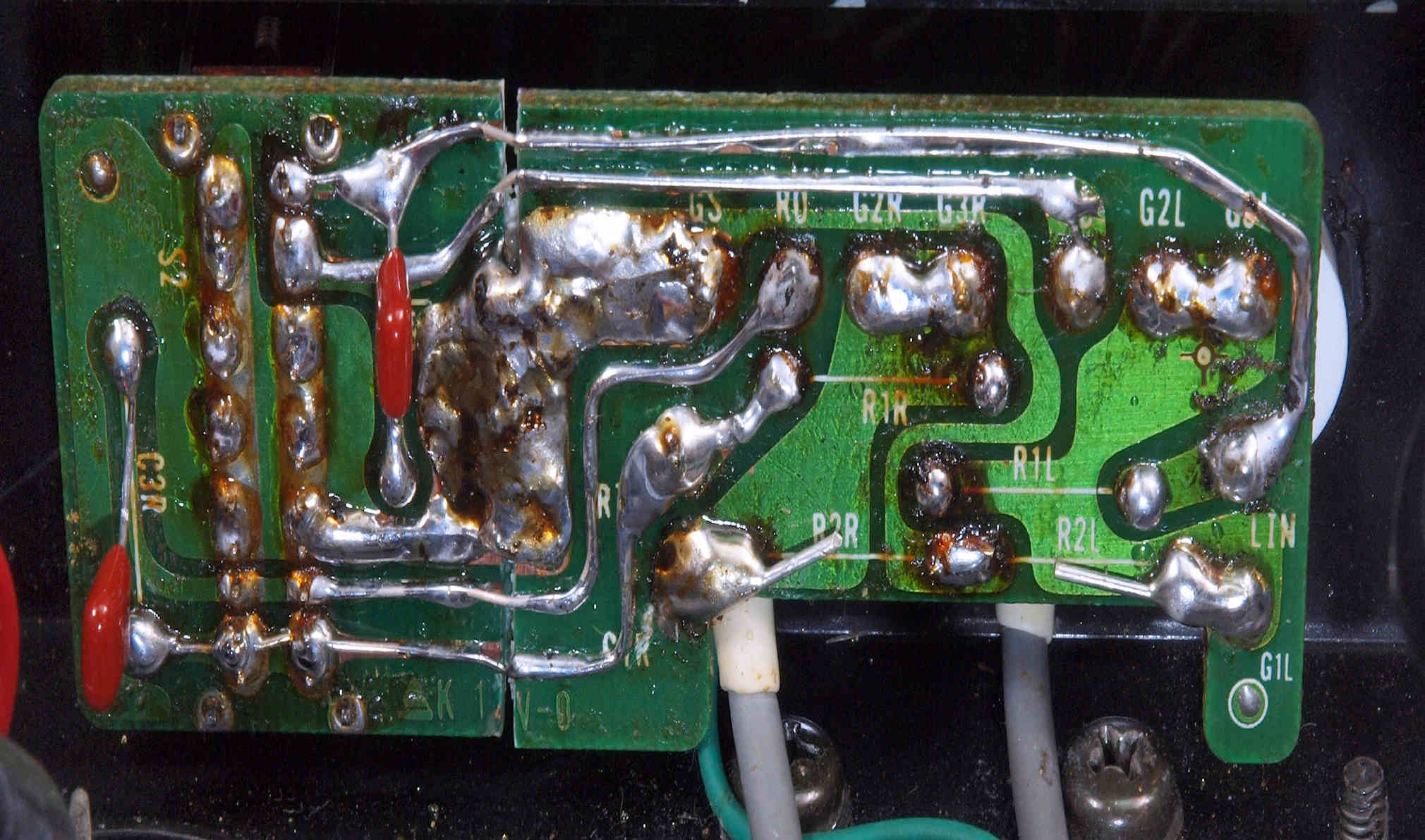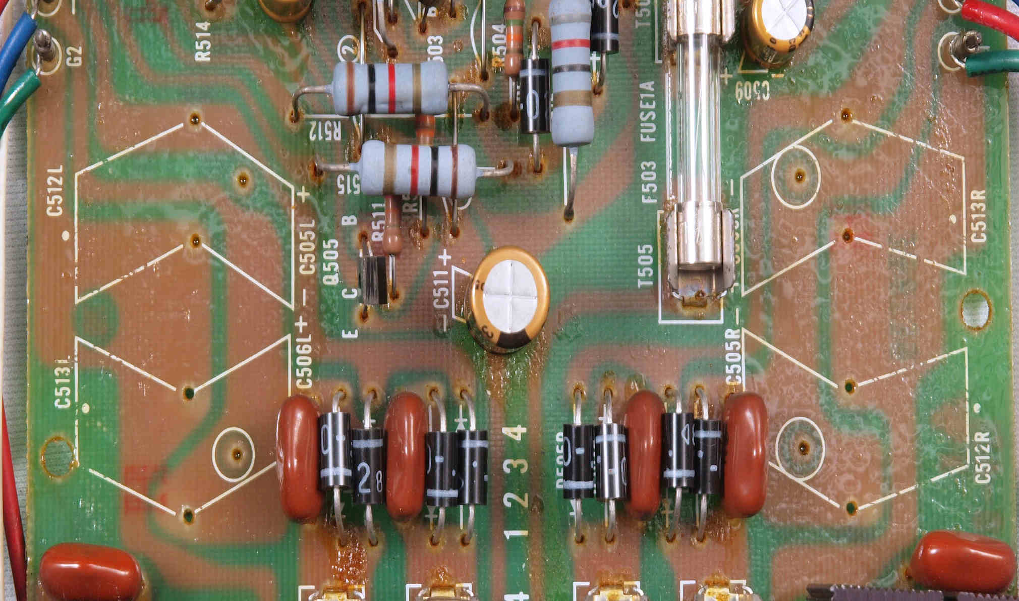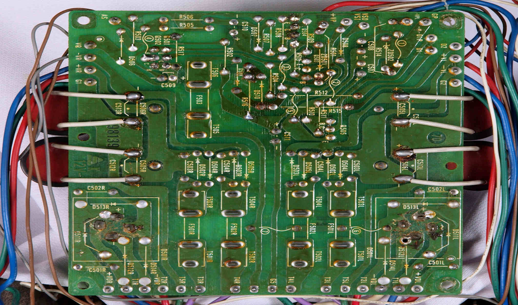 | C52. 修理中 電源基板、電解コンデンサー固定用の接着材が取り除かれていない、当時は溶媒にトルエンが使用されており、銅を腐食する。 |