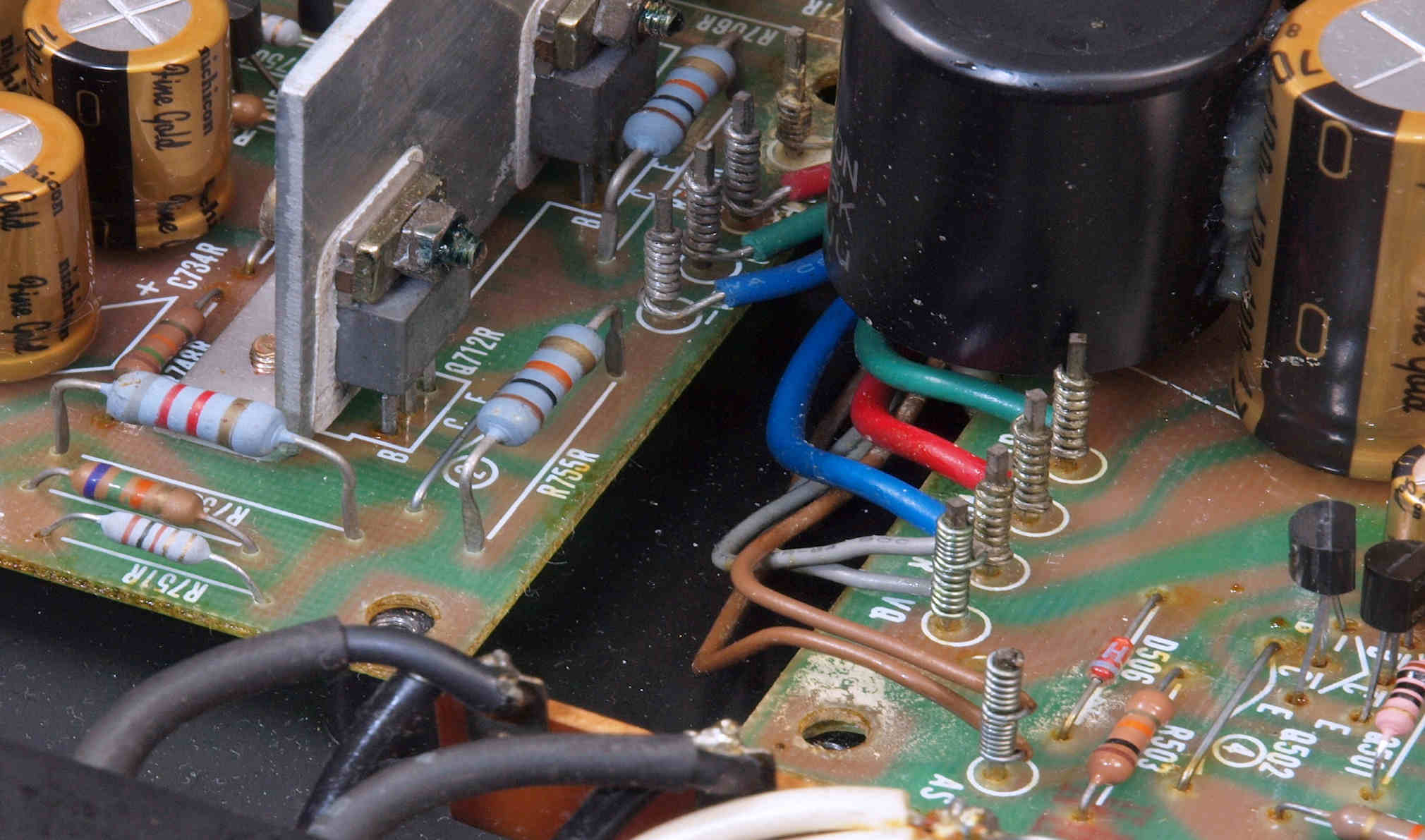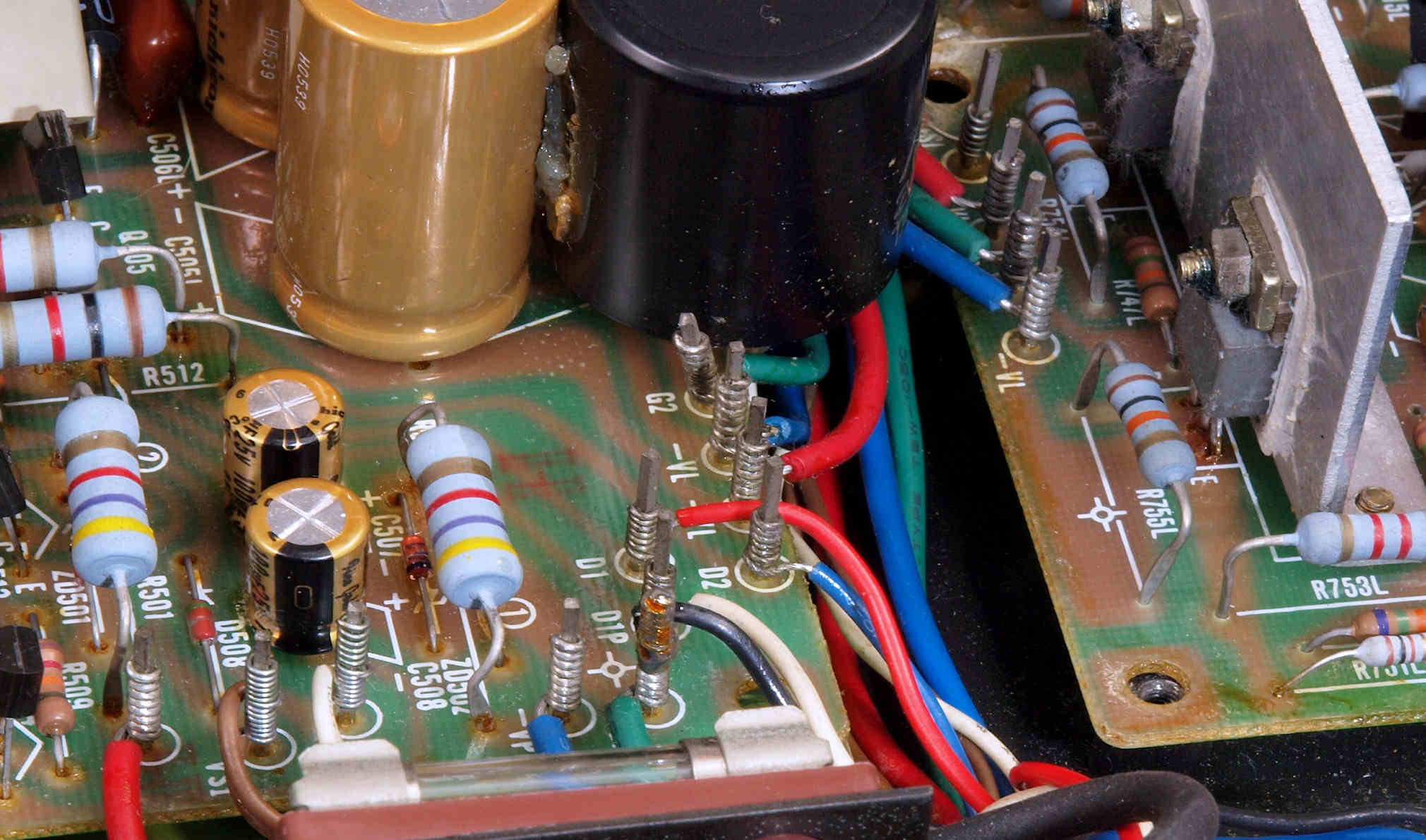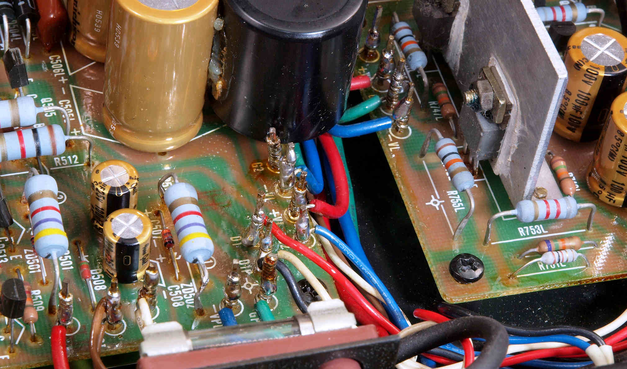 | C52. 修理中 電源基板、電解コンデンサー固定用の接着材が取り除かれていない、当時は溶媒にトルエンが使用されており、銅を腐食する。 |