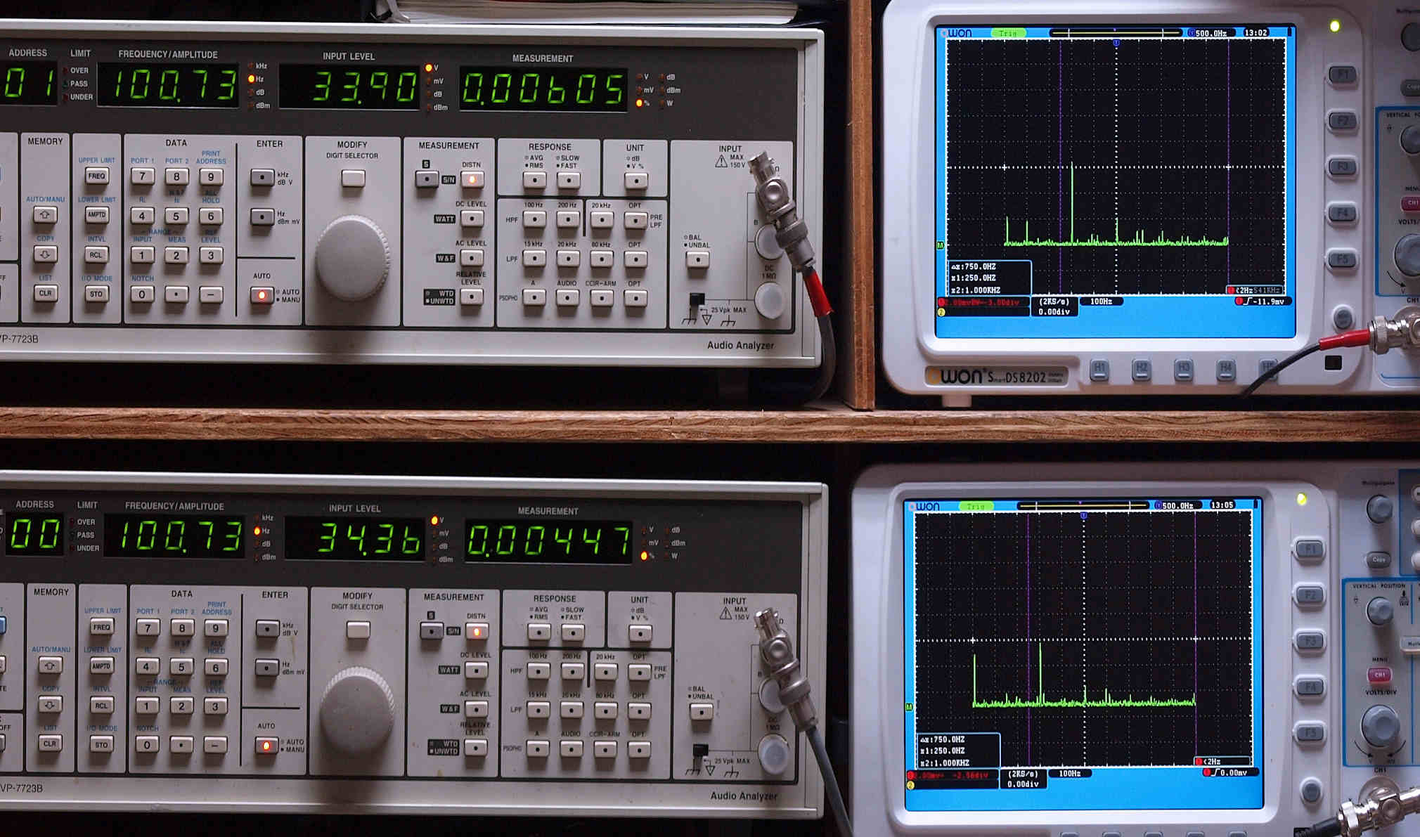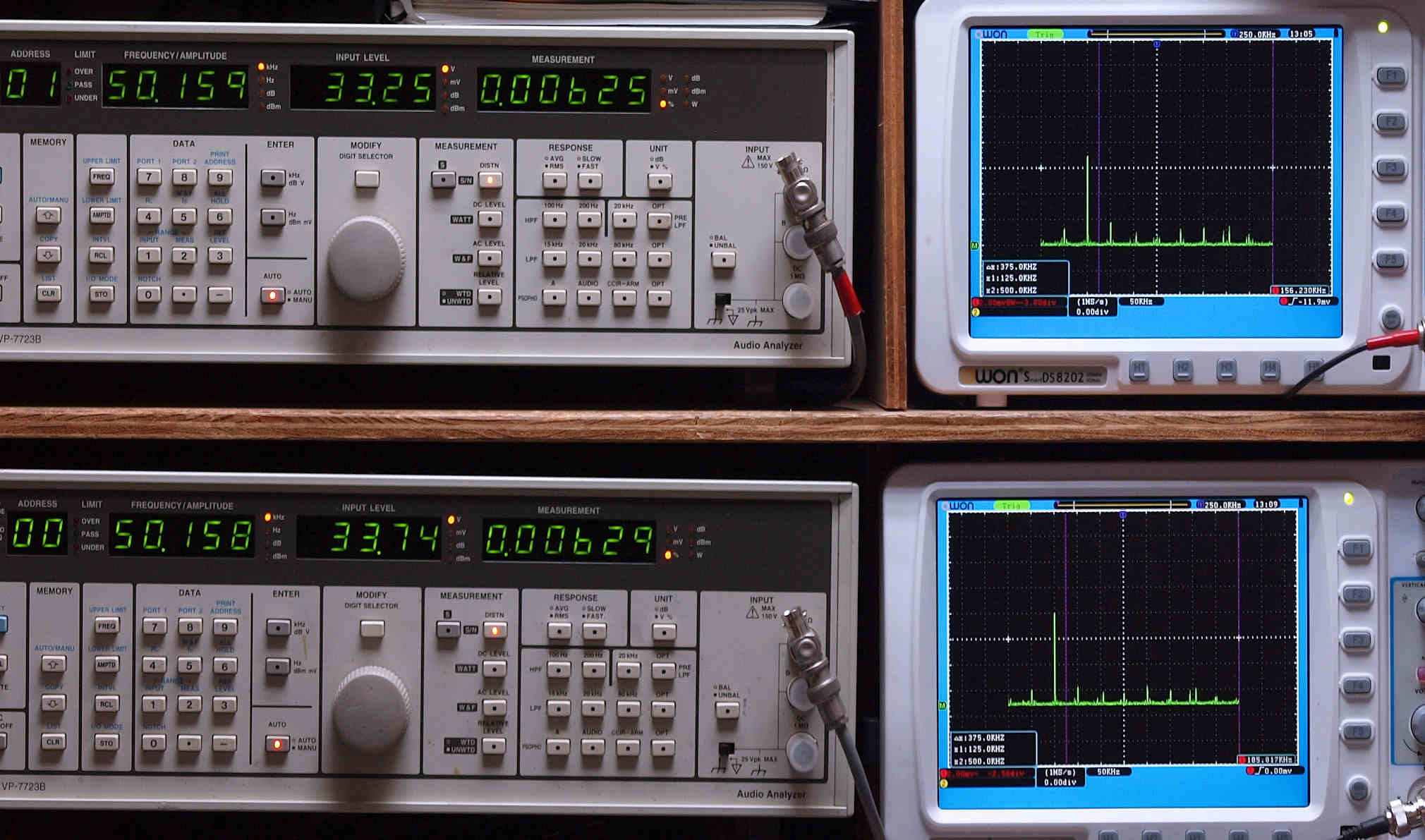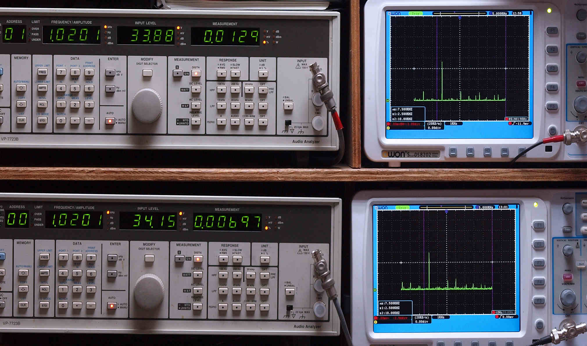 | E. 測定・調整 E1. 出力・歪み率測定・調整 「見方」。 上段中 右側SP出力を「Audio Analyzer Panasonic VP−7723B」により測定。 表示LED、 左端=メモリーNo、 中左=周波数測定、 中右=出力電圧測定、 右端=歪み率測定。 上段右端 VP−7723Bの基本波除去出力を「owon SDS8202(200MHZ)」で「FFT分析」表示。 下段中 左側SP出力を「Audio Analyzer Panasonic VP−7723B」により測定。 表示LED、 左端=メモリーNo、 中左=周波数測定、 中右=出力電圧測定、 右端=歪み率測定。 下段右端 VP−7723Bの基本波除去出力を「owon SDS6062(200MHZ)」で「FFT分析」表示。 下段左端 オーディオ発振器 VP−7201A より50Hz〜100kHzの信号を出し(歪み率=約0.003%)、ATT+分配器を通し、AMPに入力。 よって、ダイアル設定出力レベルより低くなります。測定機器の仕様や整備の様子はこちら、「VP−7723B」「VP−7201A」。 FFT画面の見方はこちら。 |