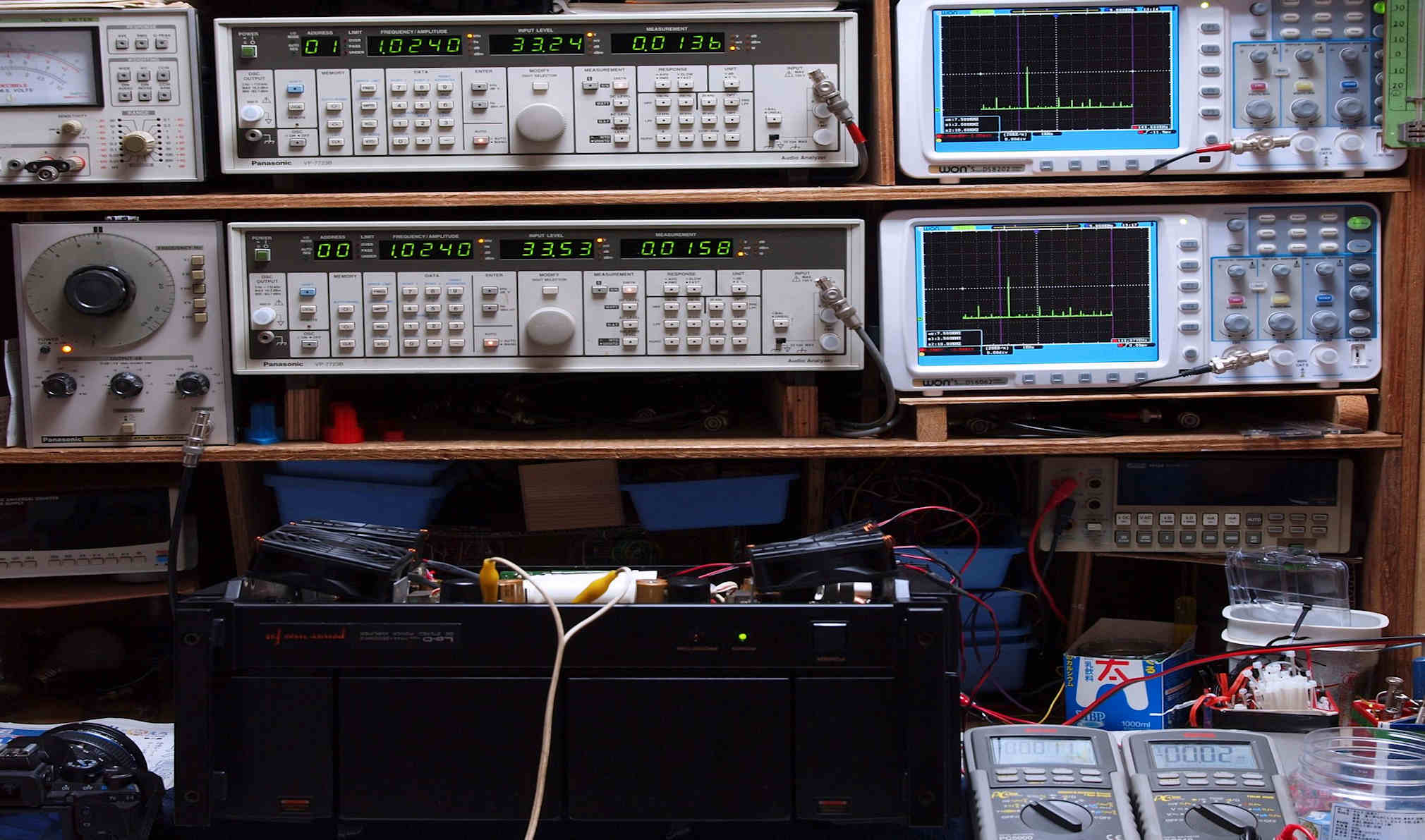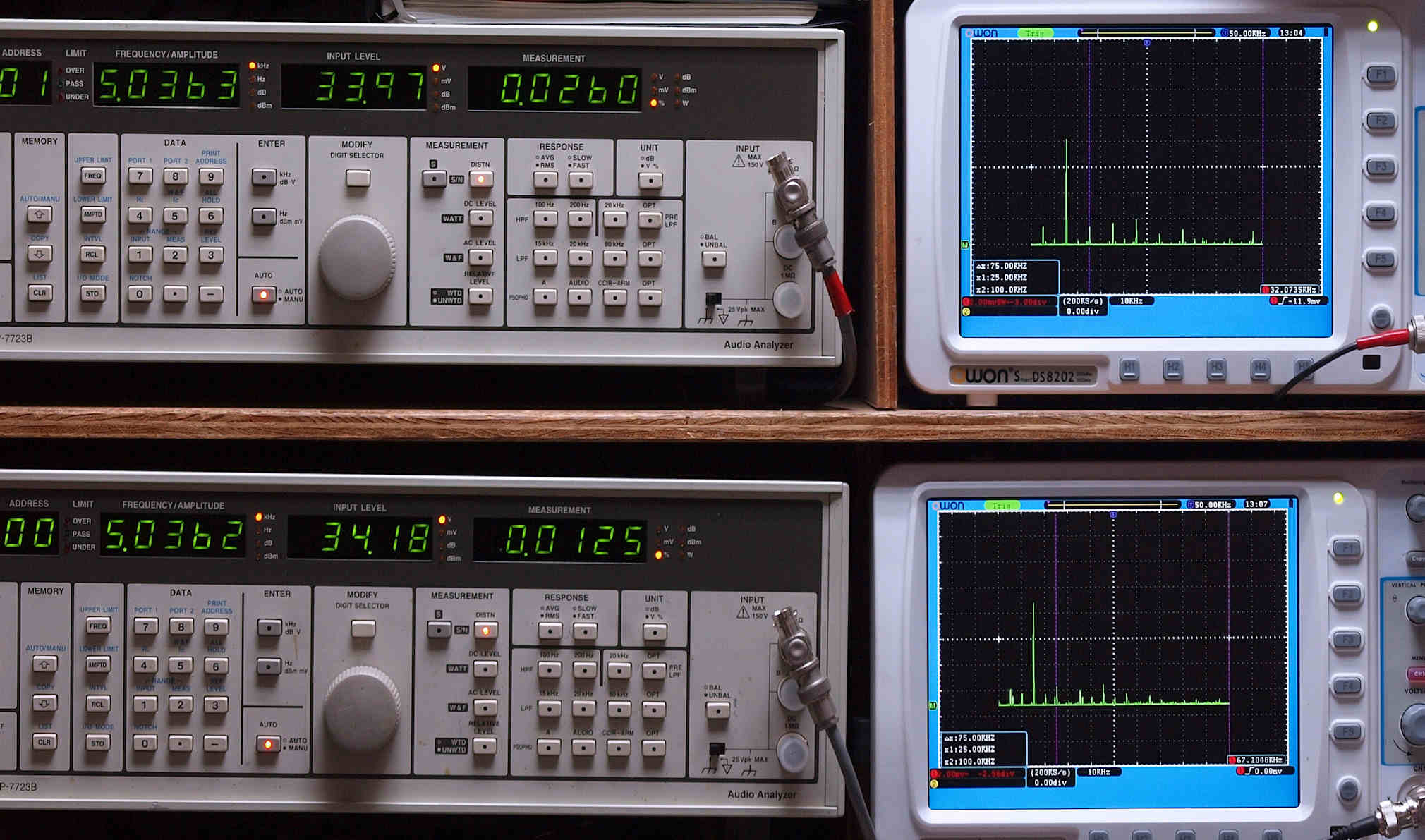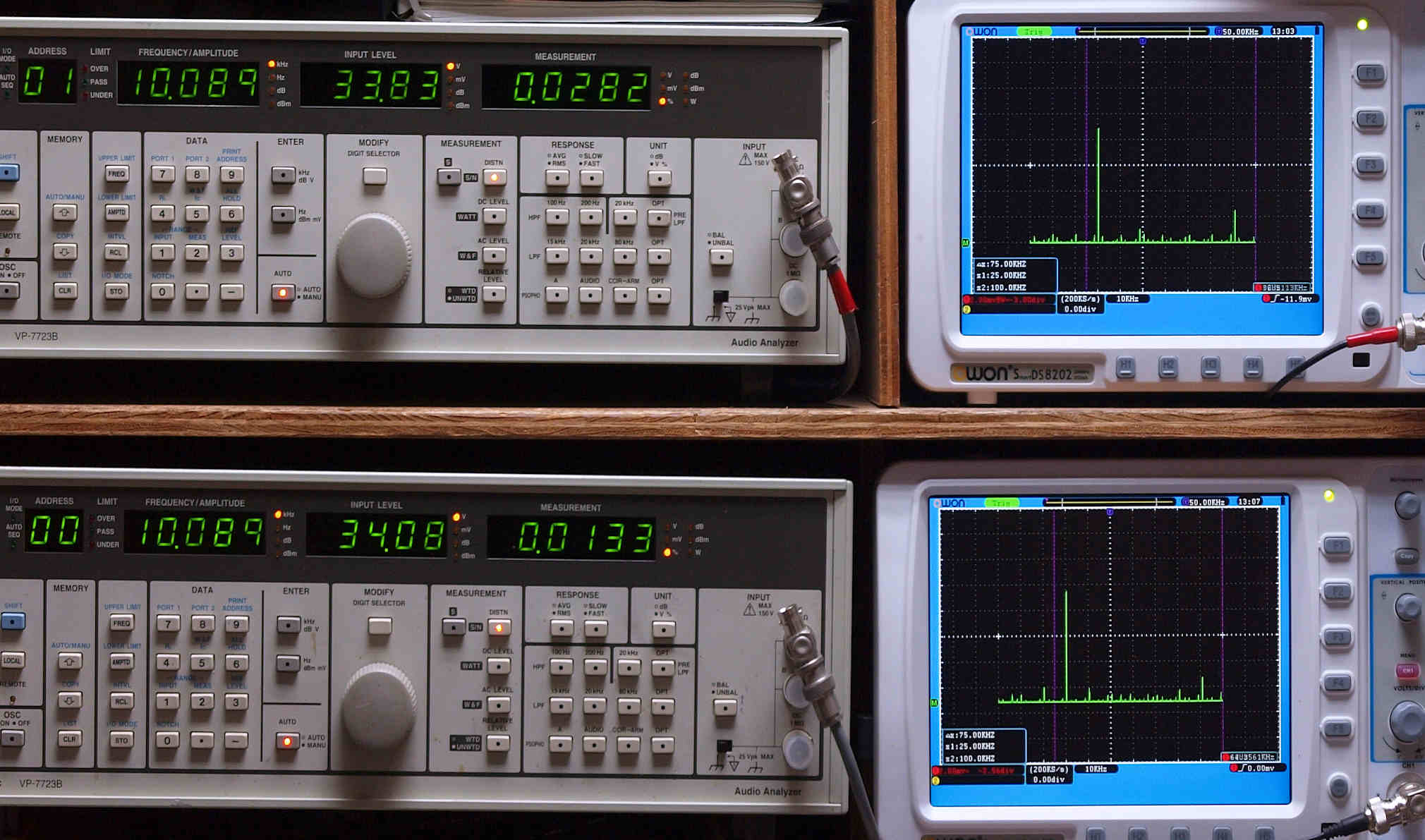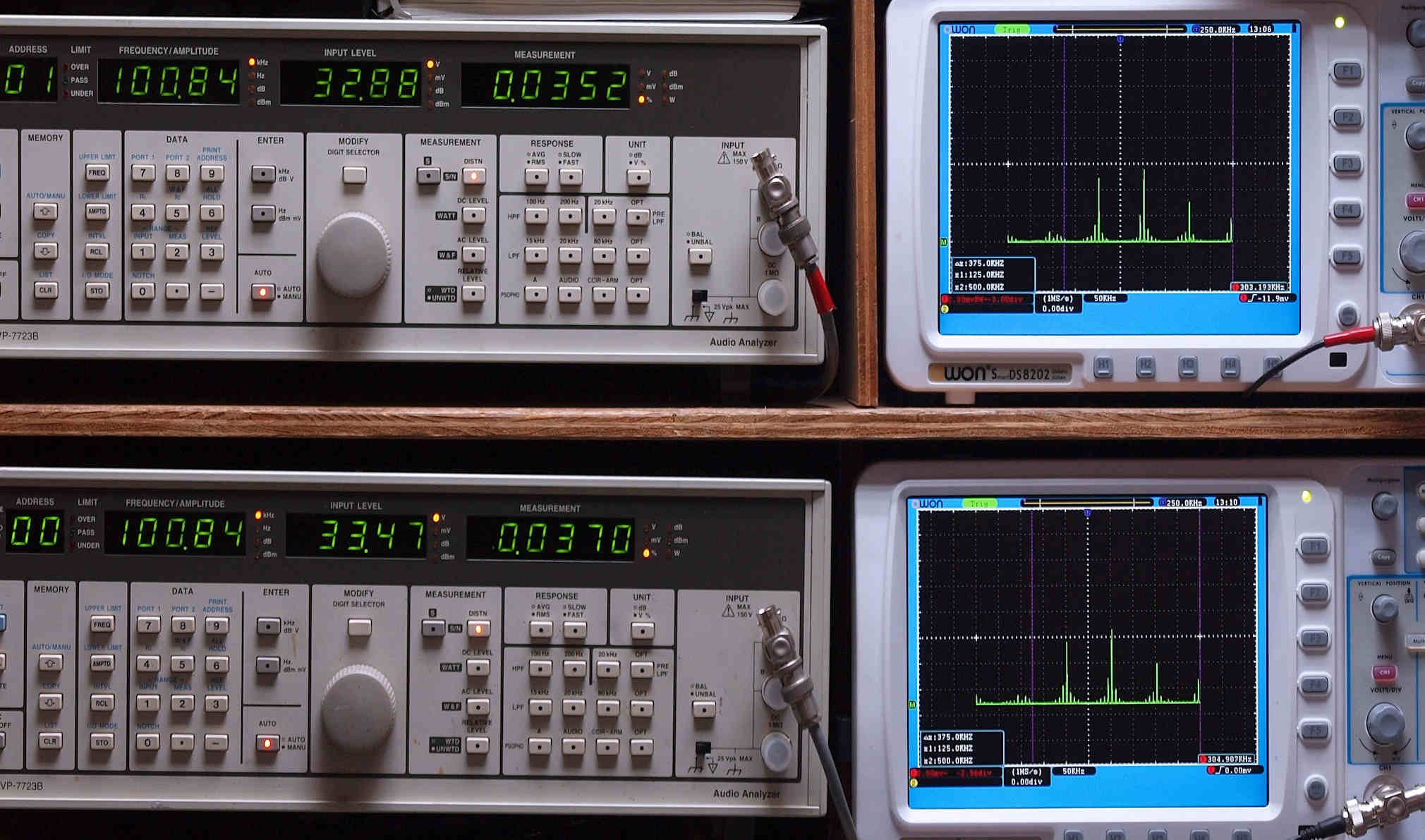 | E. 測定・調整 E1. 出力・歪み率測定・調整 「見方」。 上段中 右側SP出力を「Audio Analyzer Panasonic VP−7723B」により測定。 表示LED、 左端=メモリーNo、 中左=周波数測定、 中右=出力電圧測定、 右端=歪み率測定。 上段右端 VP−7723Bの基本波除去出力を「owon SDS8202(200MHZ)」で「FFT分析」表示。 下段中 左側SP出力を「Audio Analyzer Panasonic VP−7723B」により測定。 表示LED、 左端=メモリーNo、 中左=周波数測定、 中右=出力電圧測定、 右端=歪み率測定。 下段右端 VP−7723Bの基本波除去出力を「owon SDS6062(200MHZ)」で「FFT分析」表示。 下段左端 オーディオ発振器 VP−7201A より50Hz〜100kHzの信号を出し(歪み率=約0.003%)、ATT+分配器を通し、AMPに入力。 よって、ダイアル設定出力レベルより低くなります。測定機器の仕様や整備の様子はこちら、「VP−7723B」「VP−7201A」。 FFT画面の見方はこちら。 |