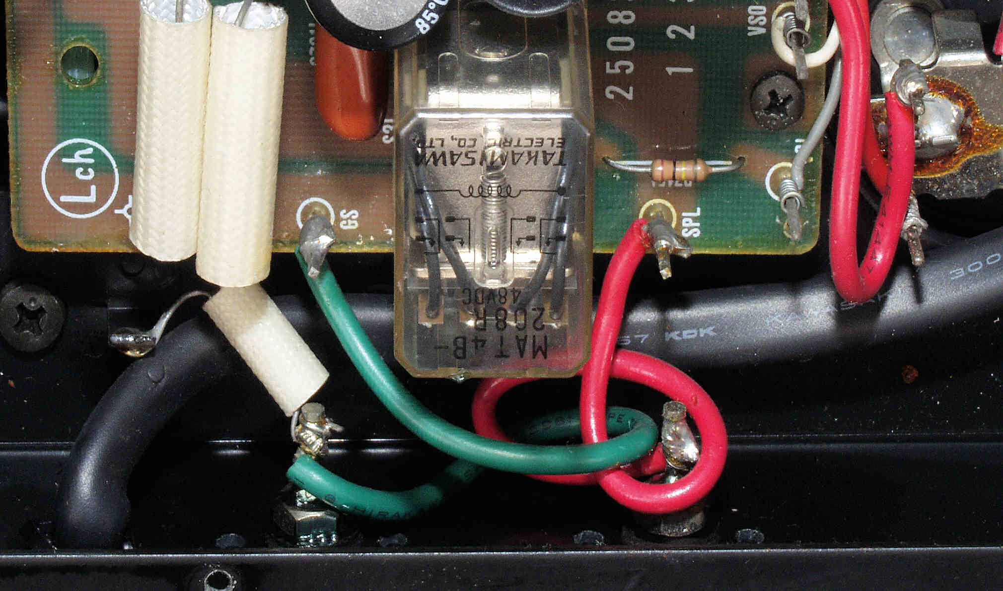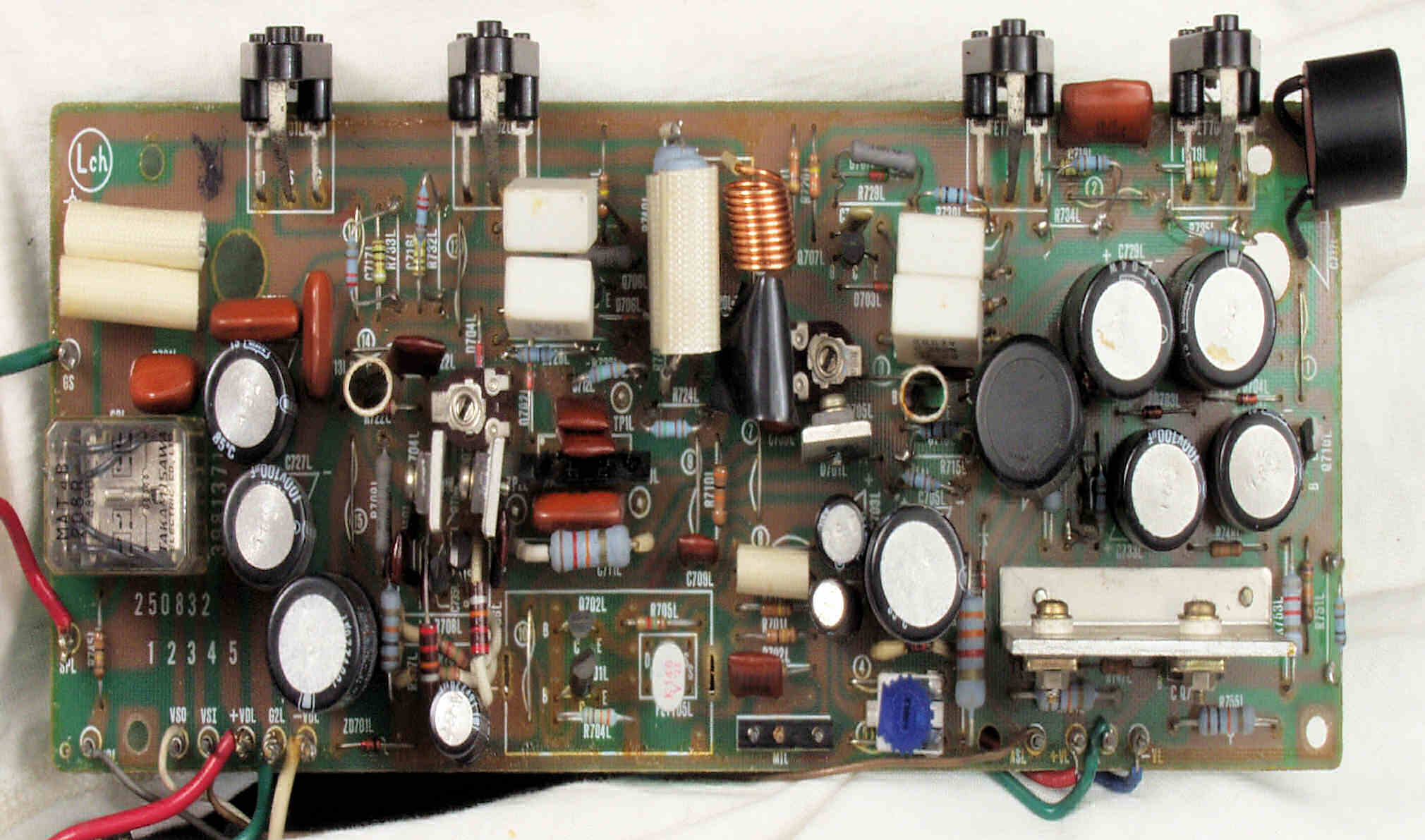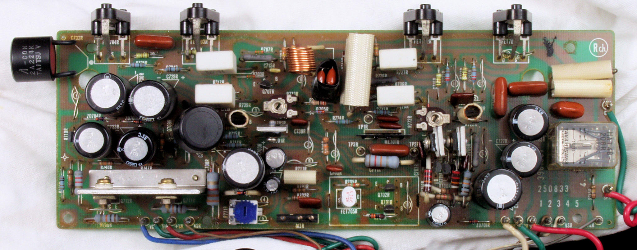 C22. 修理後 L側ドライブ基板 初段FET(電界効果トランジスター)、バランス/バイアス調整用半固定VR3個、SP接続リレー交換